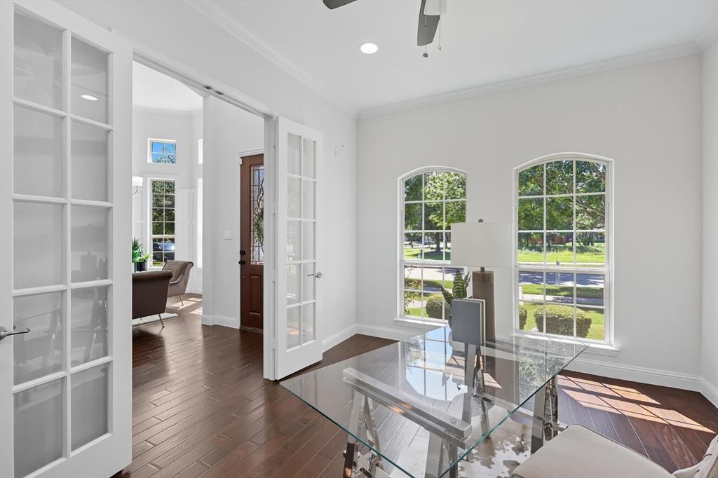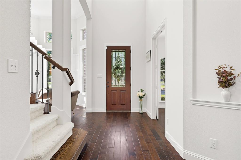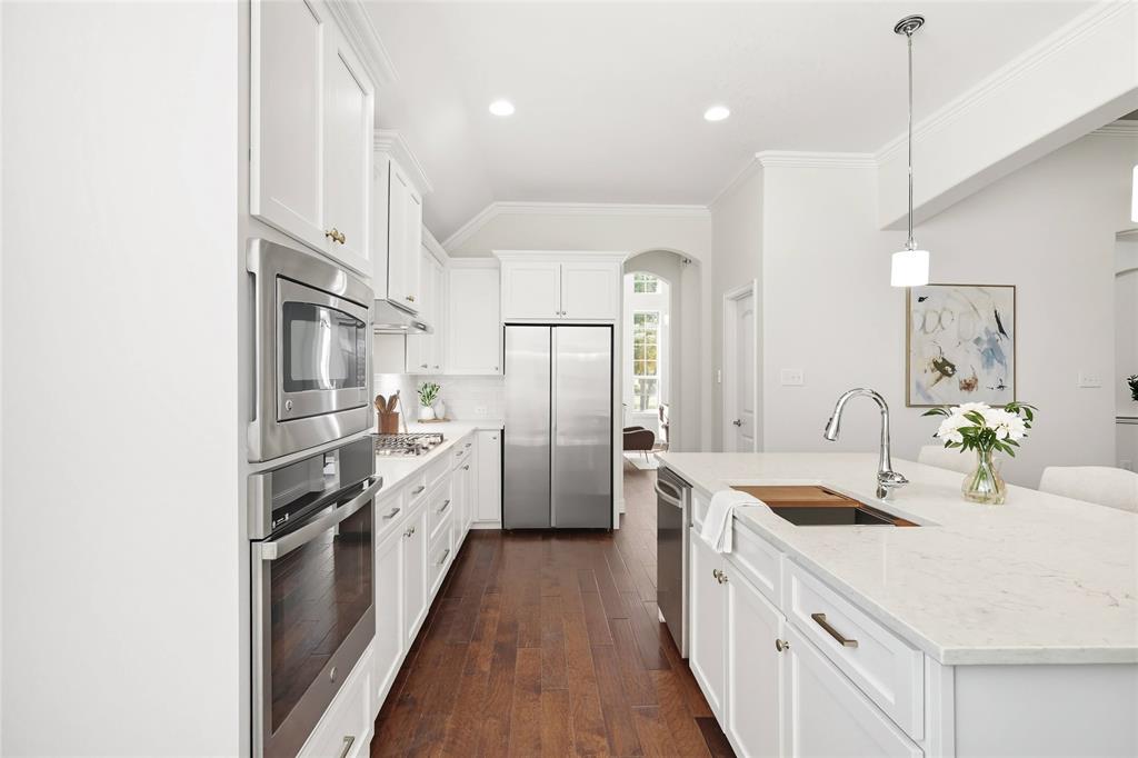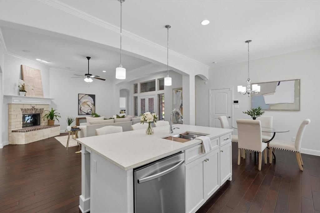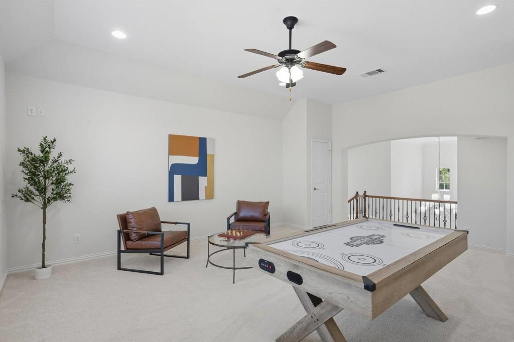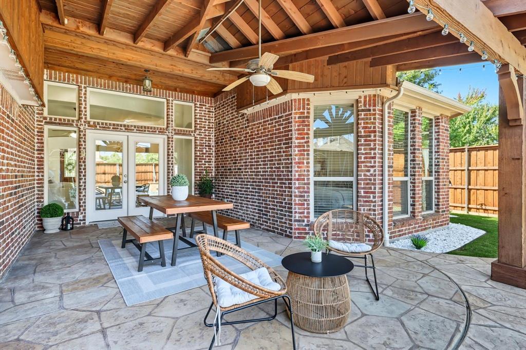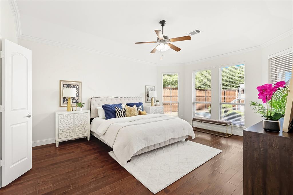 Beautifully Updated Home with Pool & Outdoor Retreat in a Prime Location. This stunning corner-lot home, across from scenic neighborhood trails, offers exceptional upgrades and timeless design throughout. With 4 bedrooms (2 downstairs), a dedicated office, and a charming front room featuring coffered walls and sunlit windows, the layout balances modern updates with family-friendly functionality. Step inside to find fresh interior paint throughout, new carpet, new hardwood floors in primary bedroom and stylishly updated main-floor bathrooms. The beautifully updated kitchen features refaced cabinets with maple doors and drawers, stunning new quartz countertops, a modern tile backsplash, and stylish new stainless-steel appliances - perfect for cooking and entertaining! The spacious living room, anchored by a stone fireplace, opens to the back patio and separates the primary suite from the rest of the home. The primary retreat offers a sitting area with pool views, and the master bath upgrades include new quartz countertops, sinks, faucets, lighting, mirrors, and frameless shower door. A second downstairs bedroom with an adjacent updated full bath provides flexibility for guests or multi generational living. Upstairs, a large game room connects to two generous bedrooms with great storage and a J&J bath. The private backyard is designed for relaxing or entertaining. Double glass doors lead to a cedar-covered patio, sparkling pool with water features, a sun shelf, and a manicured lawn for play. A removable patio safety fence adds peace of mind. Additional upgrades include whole home air purification systems (Aerus Air Scrubber), recent AC unit replacement (2022 and 2024), garage storage, whole-home surge protection and L2 EV charger outlet. Located in a welcoming neighborhood, you’ll enjoy community charm with unbeatable convenience. Just minutes from top-rated Frisco ISD schools, Whole Foods, Costco, HEB, dining, and more.