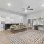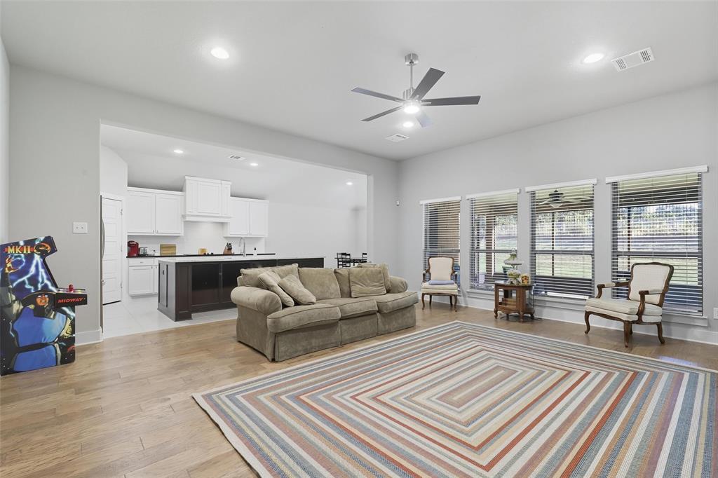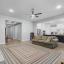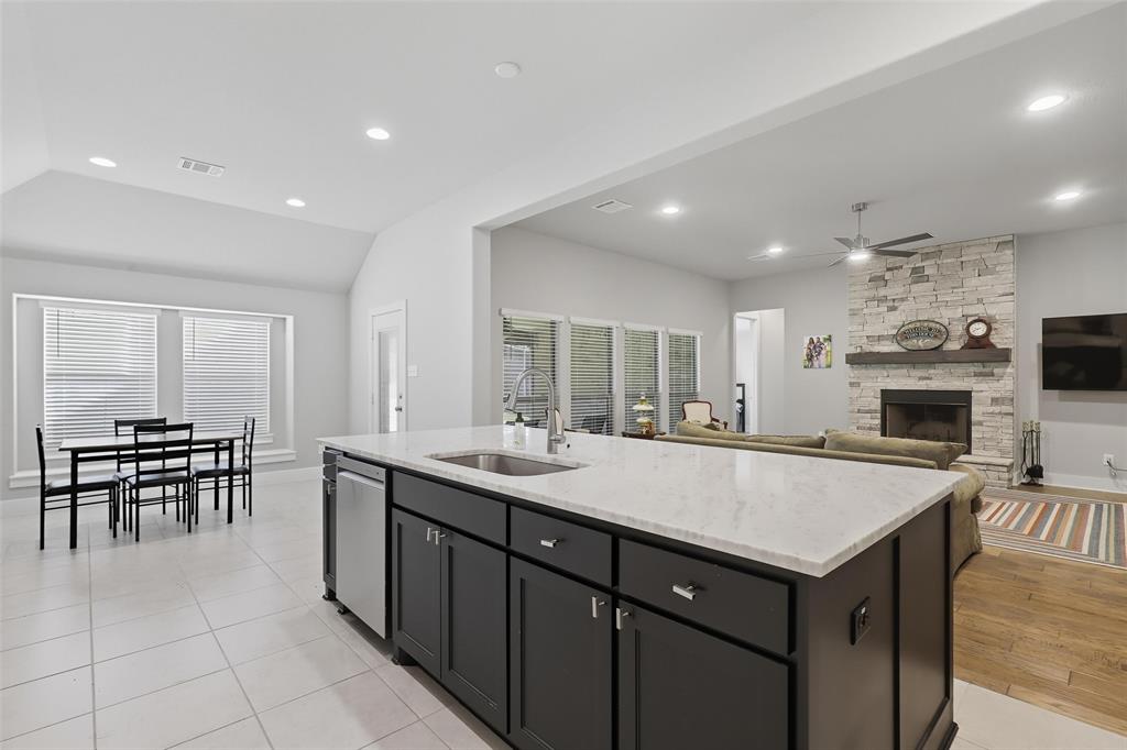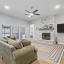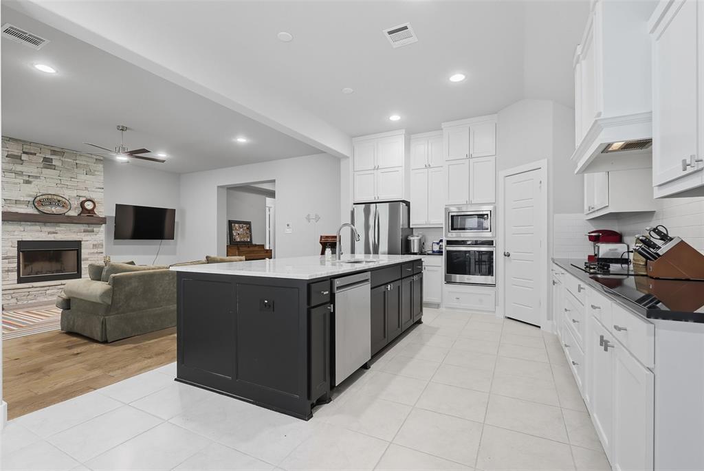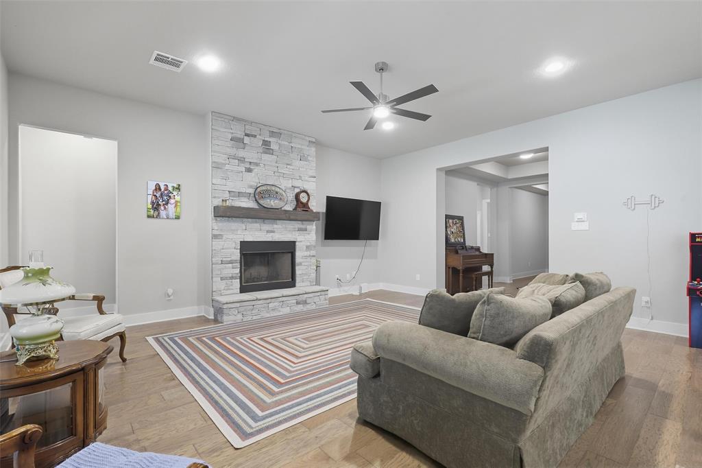 Inside, you’ll find an open-concept layout with engineered wood floors and a beautiful stone wood-burning fireplace with a brick chimney as the centerpiece of the living area. The island kitchen features custom cabinetry, stainless steel appliances, granite countertops, a subway tile backsplash, and a spacious pantry, all flowing seamlessly into the dining area and the screened-in 18x15 patio for year-round enjoyment.