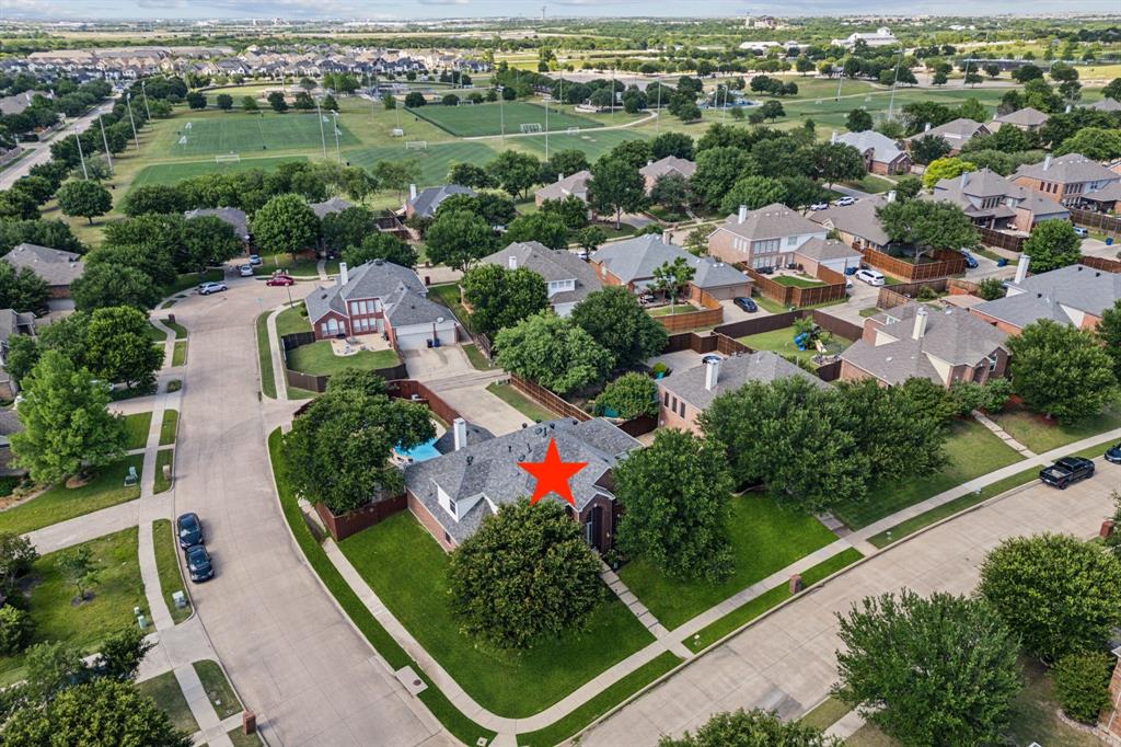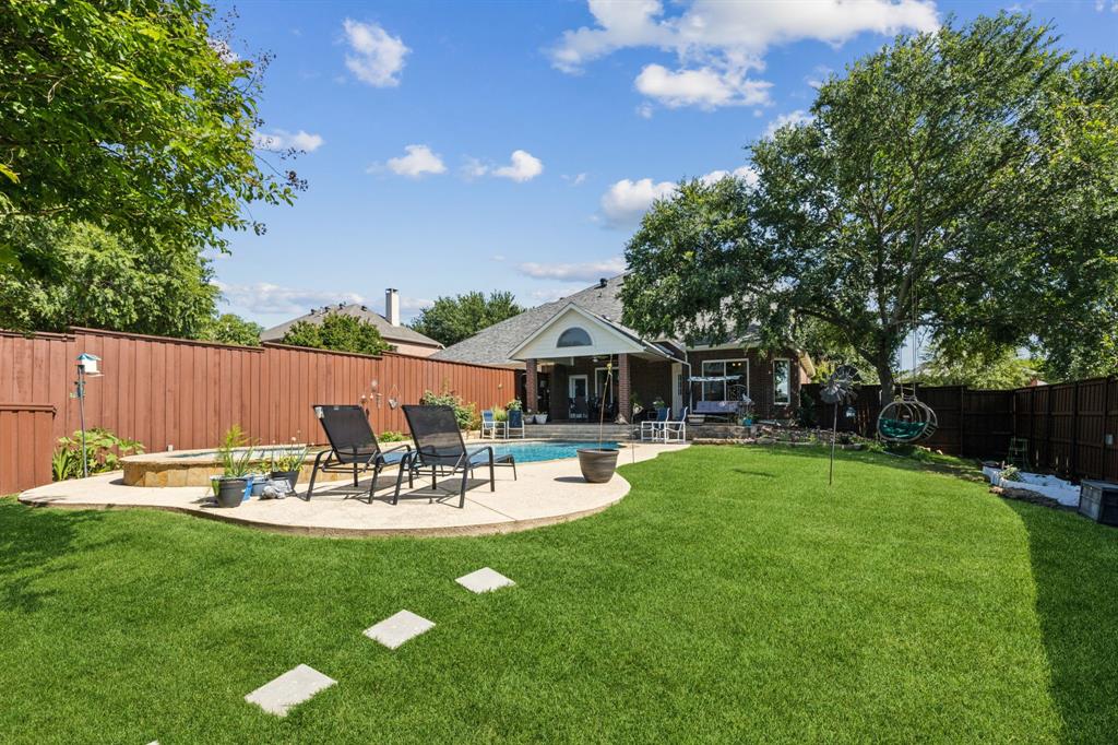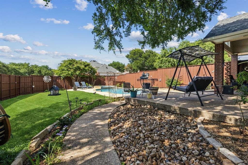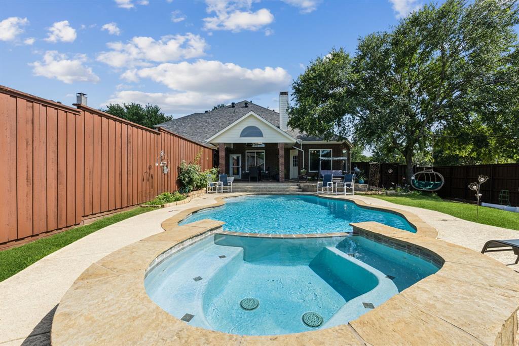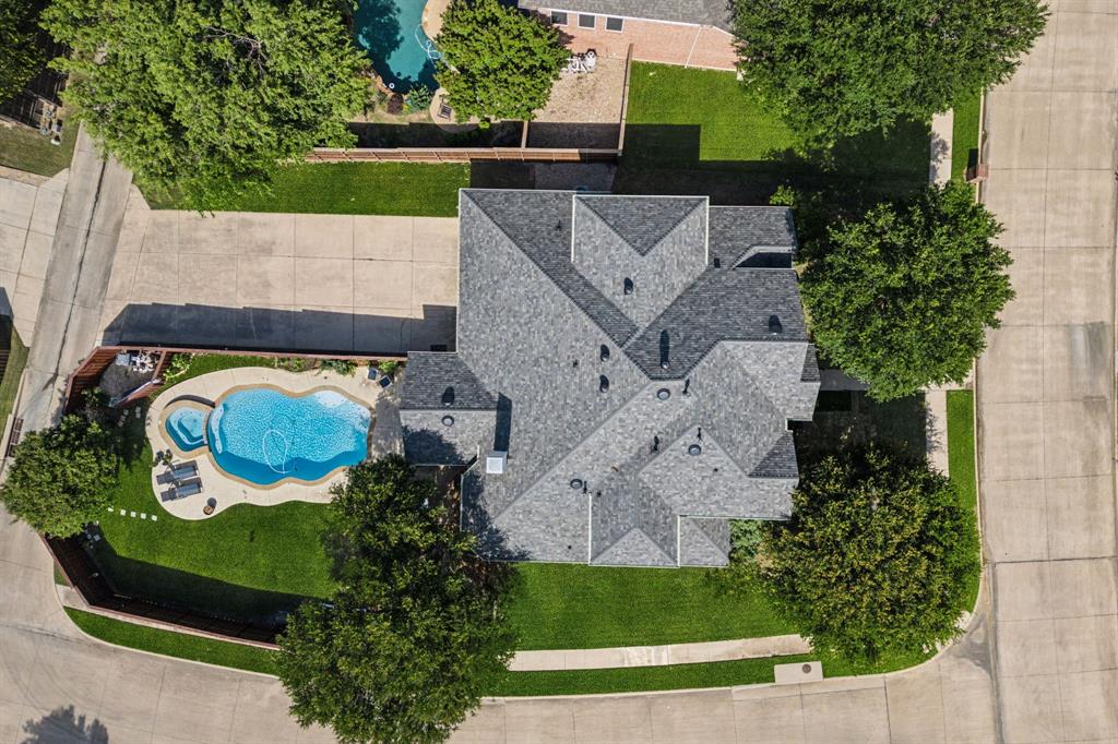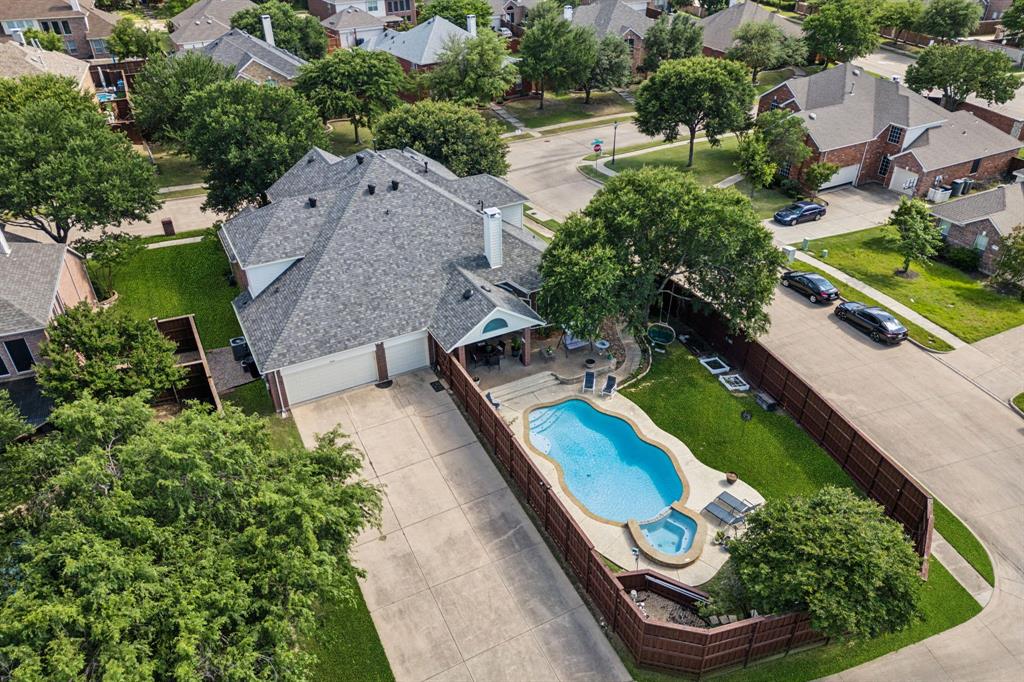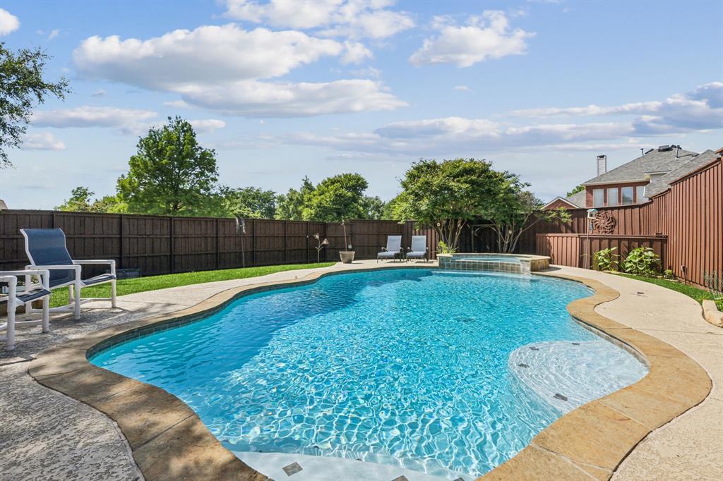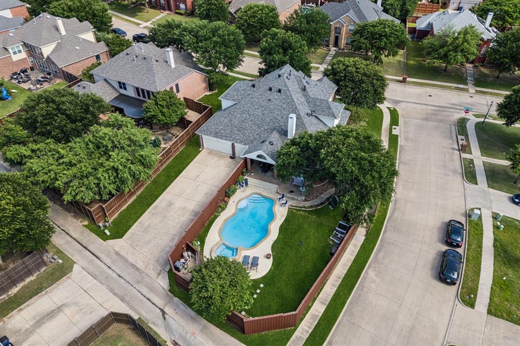 Immaculate home on a spacious corner lot in a well established neighborhood with mature trees! Three-car garage, exceptional curb appeal, & extensive upgrades throughout! Easy access to Dallas North Tollway, & convenient to shopping and dining. This home features an open floor-plan with an oversized kitchen, expansive kitchen island, breakfast bar, granite counters, gas cook-top, & an abundance of cabinet and counter space (all updated in 2017). Vinyl plank flooring added in kitchen in 2021 & in master bath in 2025. The adjoining living & dining areas showcase beautiful wood floors. French doors added to front formal room to allow for a private office space. Upstairs features new carpet (2024) including the staircase; dual staircases offer added convenience. The spacious primary suite includes an updated shower with a frame-less glass enclosure, two walk-in closets with California Closet updates, & a bonus shoe and purse closet. A secondary bedroom with a private full bath is located downstairs—ideal for guests or multi-generational living. Three additional bedrooms upstairs with a spacious bonus space that would make a great game room, playroom, or additional living room. The backyard is truly a showstopper, boasting a large covered outdoor living space, sparkling heated pool & spa, and plenty of room for gatherings or quiet evenings. This well-maintained property offers comfort, style, and thoughtful updates.