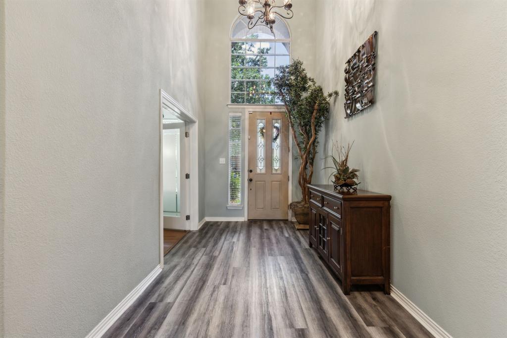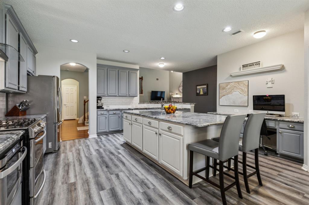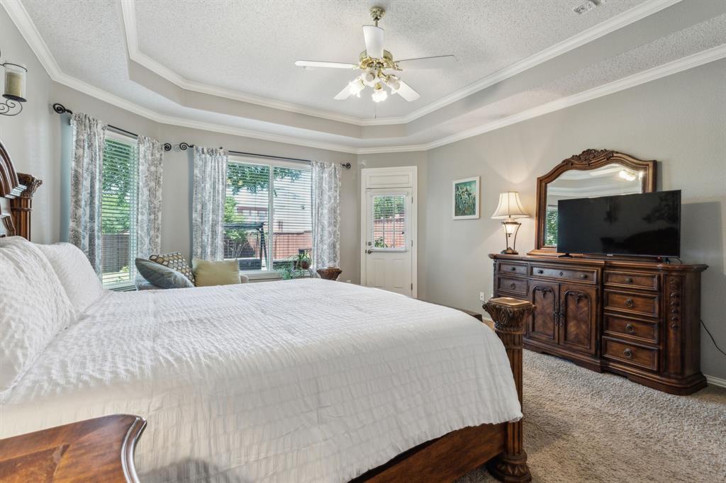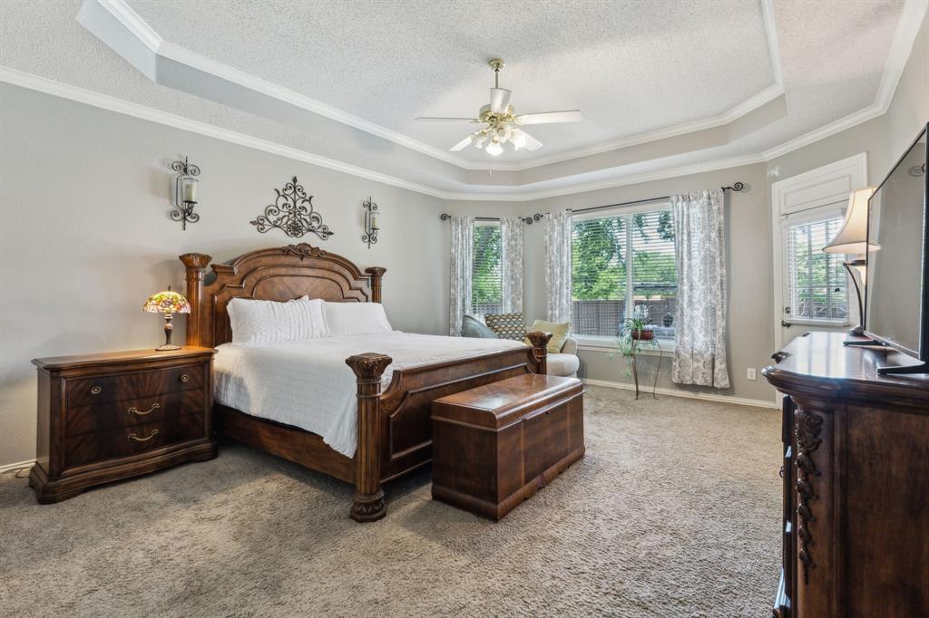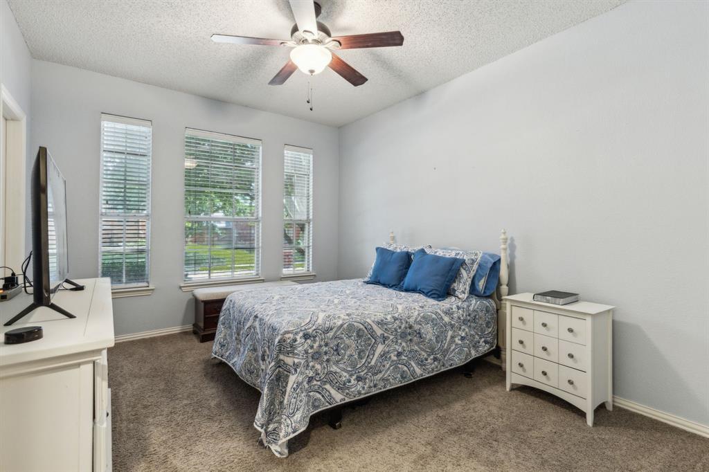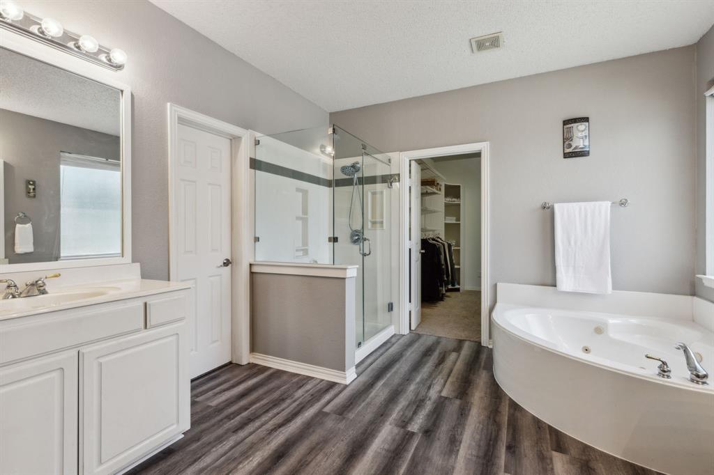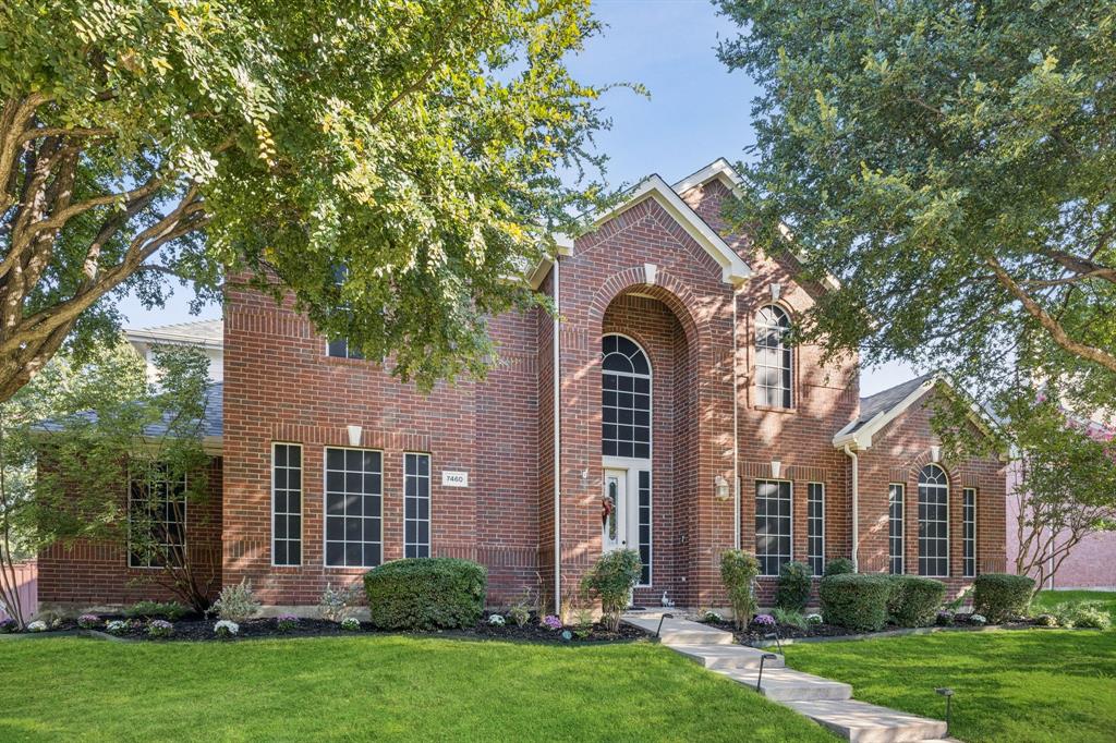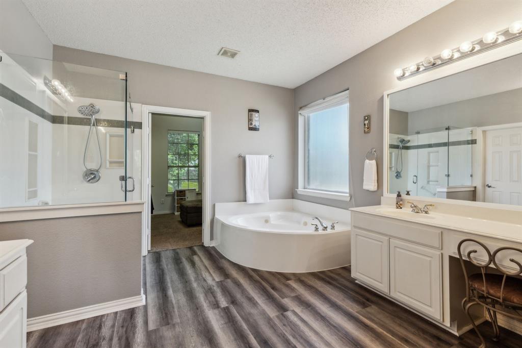Immaculate home on a spacious corner lot in a well established neighborhood with mature trees! Three-car garage, exceptional curb appeal, & extensive upgrades throughout! Easy access to Dallas North Tollway, & convenient to shopping and dining. This home features an open floor-plan with an oversized kitchen, expansive kitchen island, breakfast bar, granite counters, gas cook-top, & an abundance of cabinet and counter space (all updated in 2017). Vinyl plank flooring added in kitchen in 2021 & in master bath in 2025. The adjoining living & dining areas showcase beautiful wood floors. French doors added to front formal room to allow for a private office space. Upstairs features new carpet (2024) including the staircase; dual staircases offer added convenience. The spacious primary suite includes an updated shower with a frame-less glass enclosure, two walk-in closets with California Closet updates, & a bonus shoe and purse closet. A secondary bedroom with a private full bath is located downstairs—ideal for guests or multi-generational living. Three additional bedrooms upstairs with a spacious bonus space that would make a great game room, playroom, or additional living room. The backyard is truly a showstopper, boasting a large covered outdoor living space, sparkling heated pool & spa, and plenty of room for gatherings or quiet evenings. This well-maintained property offers comfort, style, and thoughtful updates.