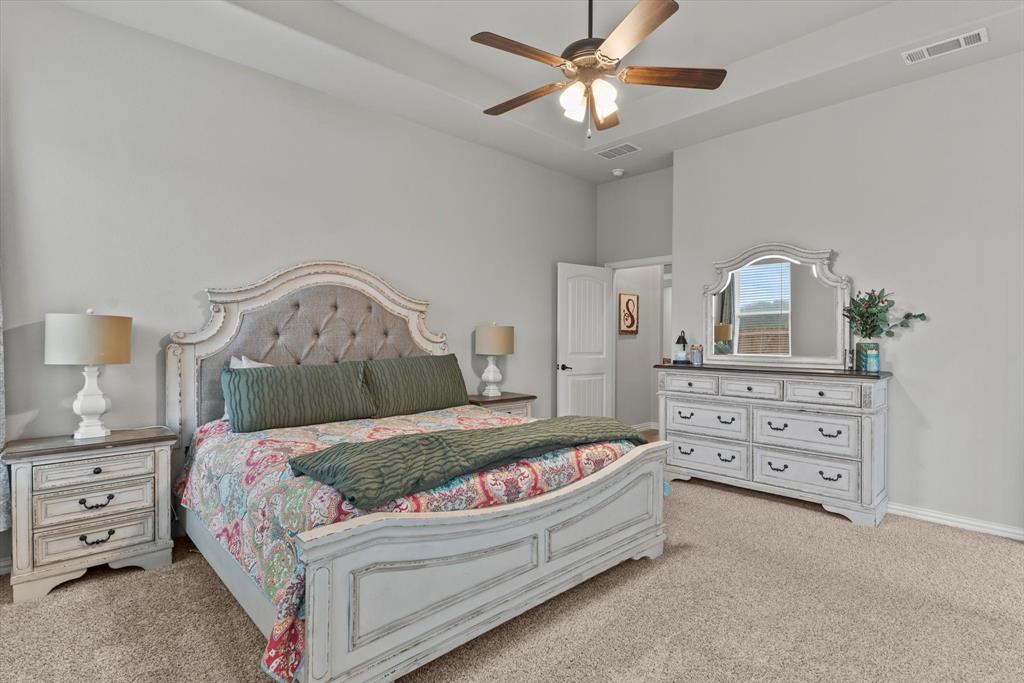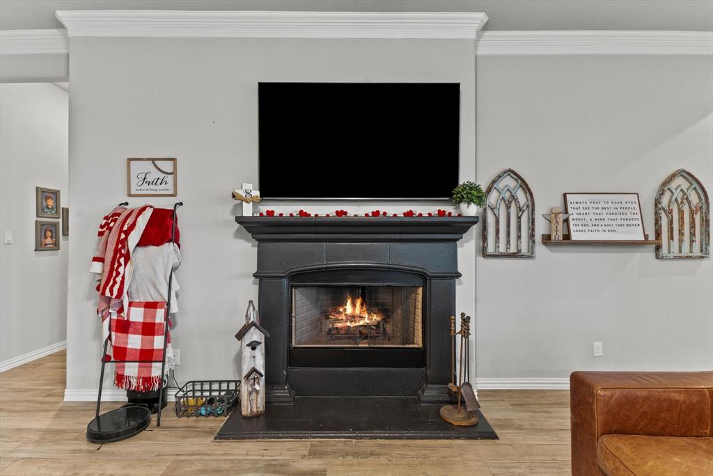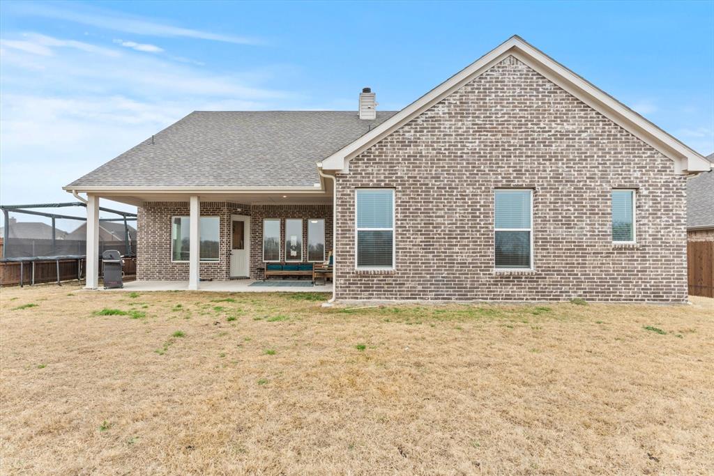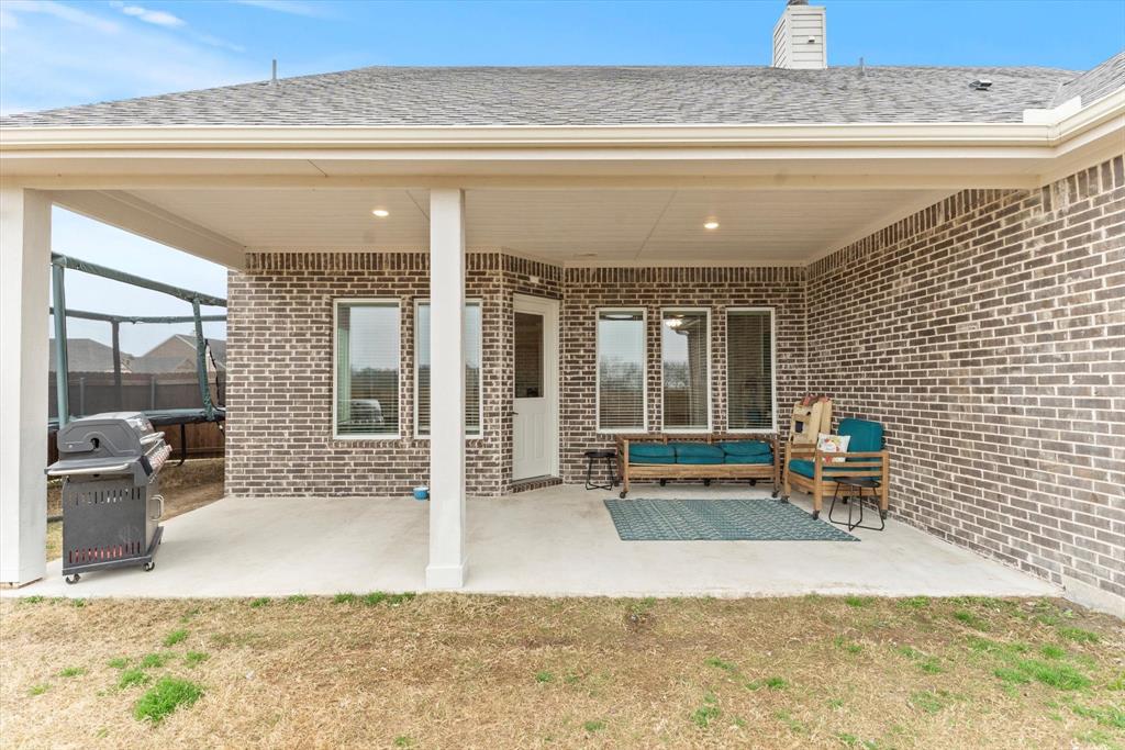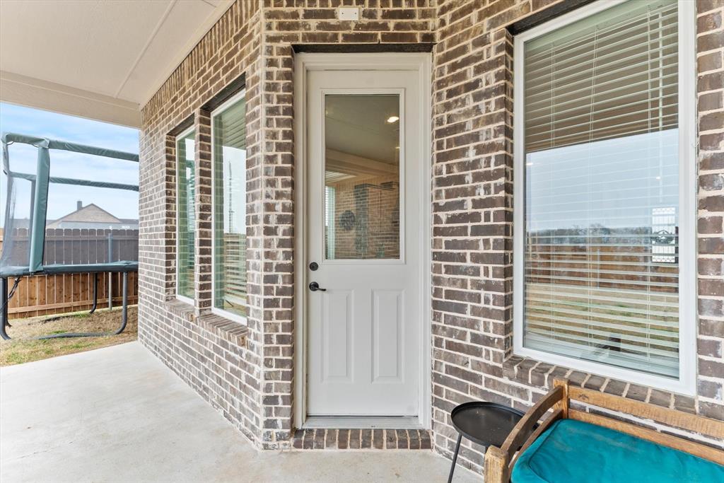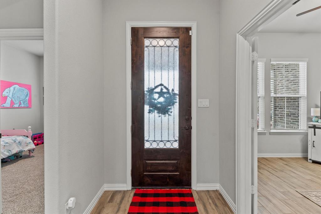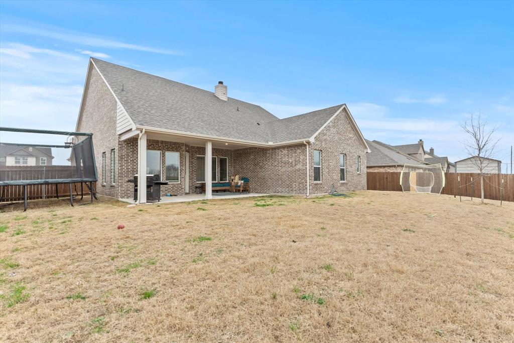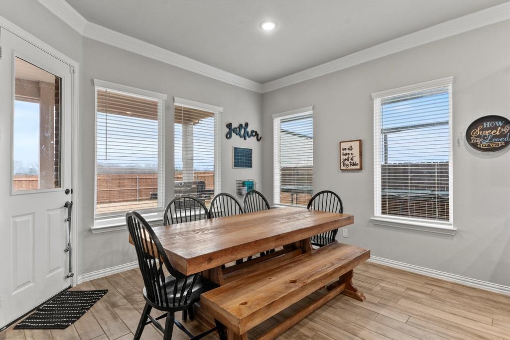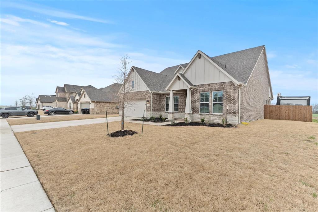 Discover your dream home offering 4 bright bedrooms, 3 well appointed baths, and a convenient 2 car garage. Step inside an inspiring open split-concept design featuring a versatile study adorned with double doors. The elegant entrance, highlighted by an oversized front door, welcomes you into main areas graced with chic wood tile flooring. The heart of the home is a gourmet kitchen complete with an oversized island and generous walk-in pantry. Adjacent, the expansive living room centers around a warm wood-burning fireplace. Secondary bedrooms are generously sized alongside two additional bathrooms, ensuring comfort for all. Retreat to the primary suite, an idyllic oasis with dual sinks, a relaxing garden tub, and a separate shower. Outside, enjoy a covered back patio and a fully irrigated, spacious yard offering serene privacy with no rear neighbors.