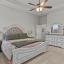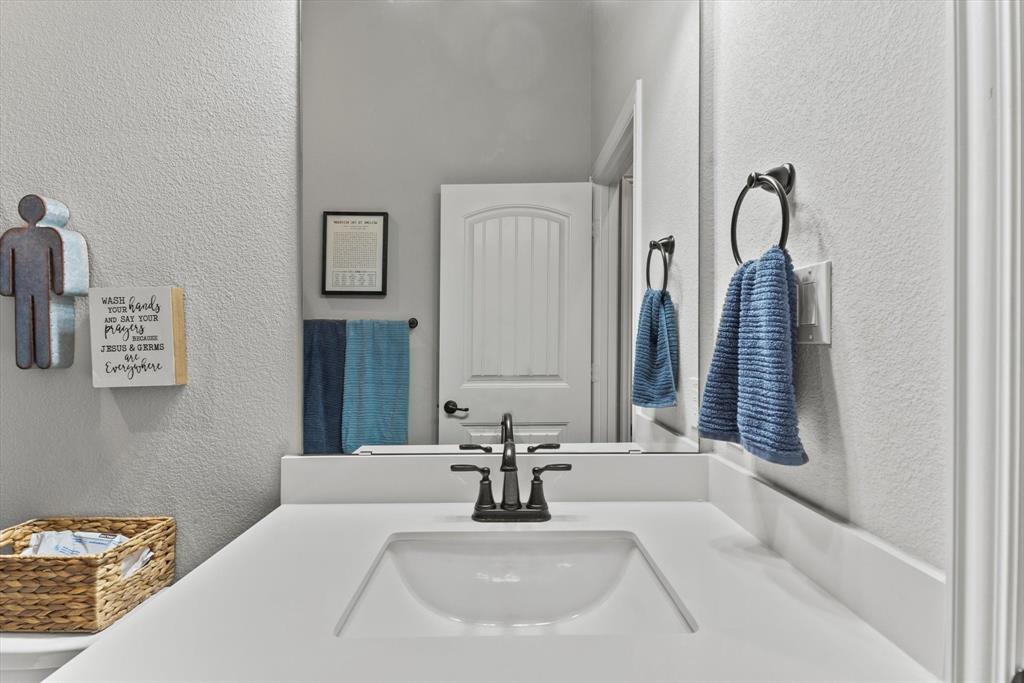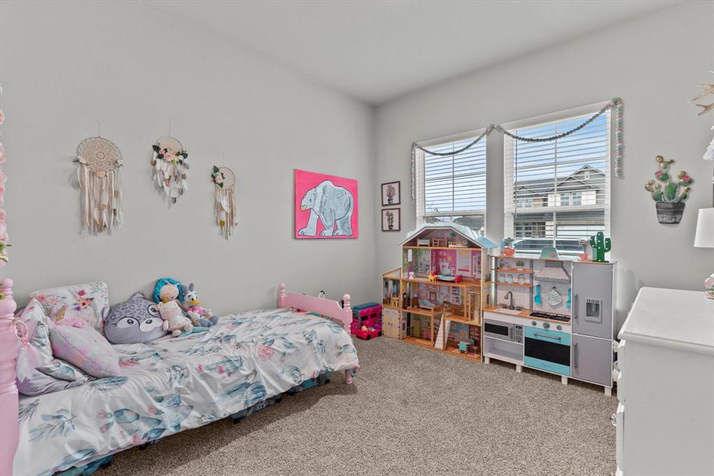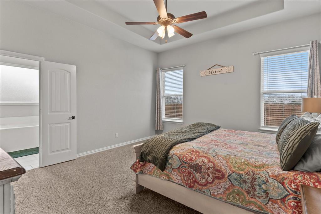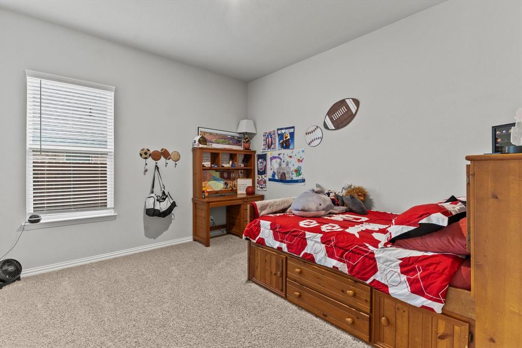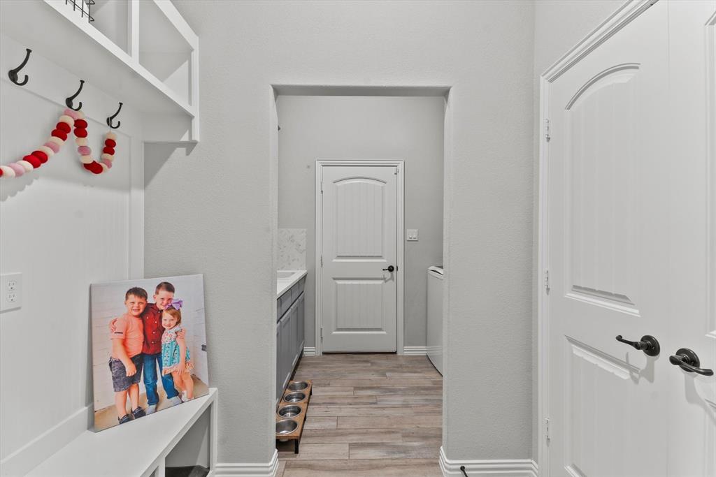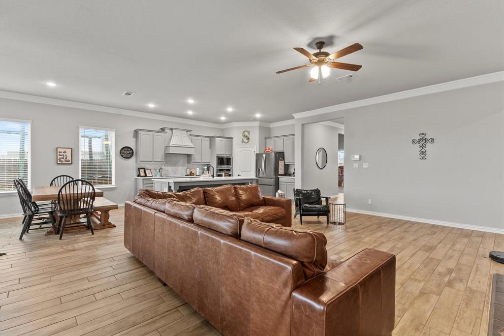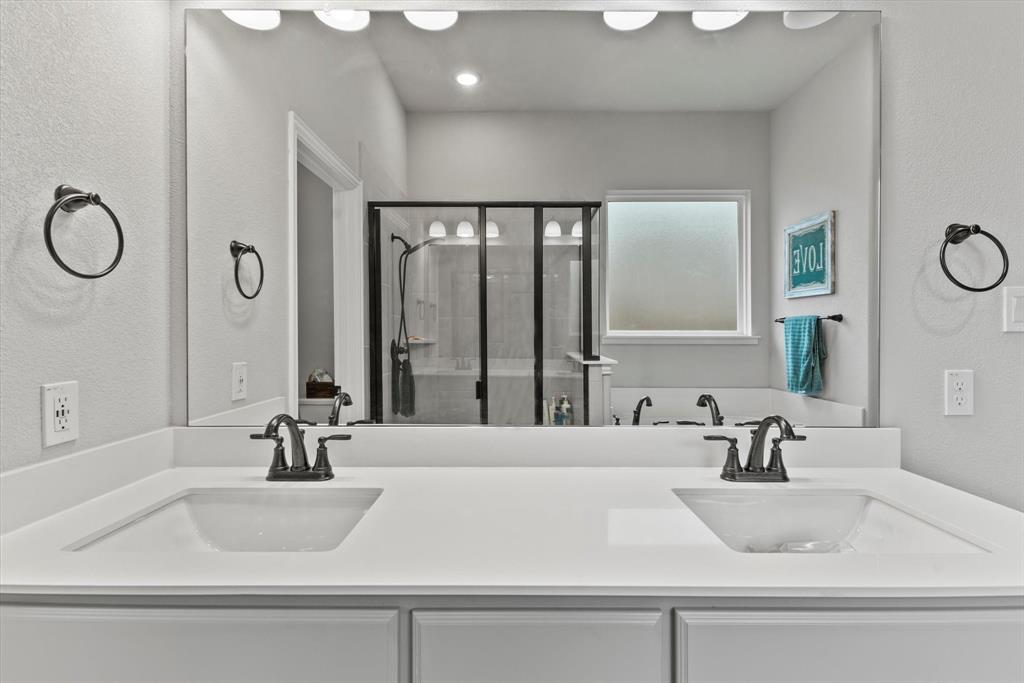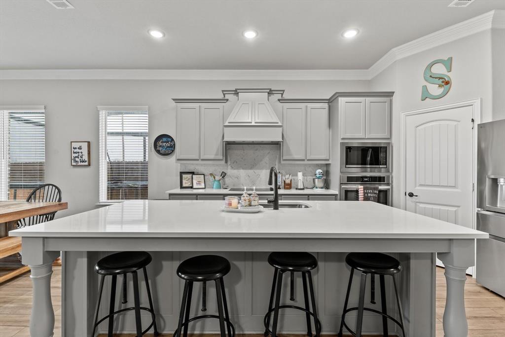 Discover your dream home offering 4 bright bedrooms, 3 well appointed baths, and a convenient 2 car garage. Step inside an inspiring open split-concept design featuring a versatile study adorned with double doors. The elegant entrance, highlighted by an oversized front door, welcomes you into main areas graced with chic wood tile flooring. The heart of the home is a gourmet kitchen complete with an oversized island and generous walk-in pantry. Adjacent, the expansive living room centers around a warm wood-burning fireplace. Secondary bedrooms are generously sized alongside two additional bathrooms, ensuring comfort for all. Retreat to the primary suite, an idyllic oasis with dual sinks, a relaxing garden tub, and a separate shower. Outside, enjoy a covered back patio and a fully irrigated, spacious yard offering serene privacy with no rear neighbors.