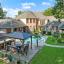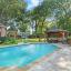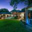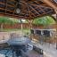 The backyard is a true oasis. Enjoy a resurfaced pool with grotto waterfall, separate hot tub under a brick gazebo with Bluetooth-enabled sound and lighting, and three patios for outdoor living. The main poolside patio features its own electrical system, ceiling fan, stone bar, fire pit, and seating area. Professional up-lighting highlights the trees and fence line, while a 180-ft cedar fence (2019) ensures complete privacy.