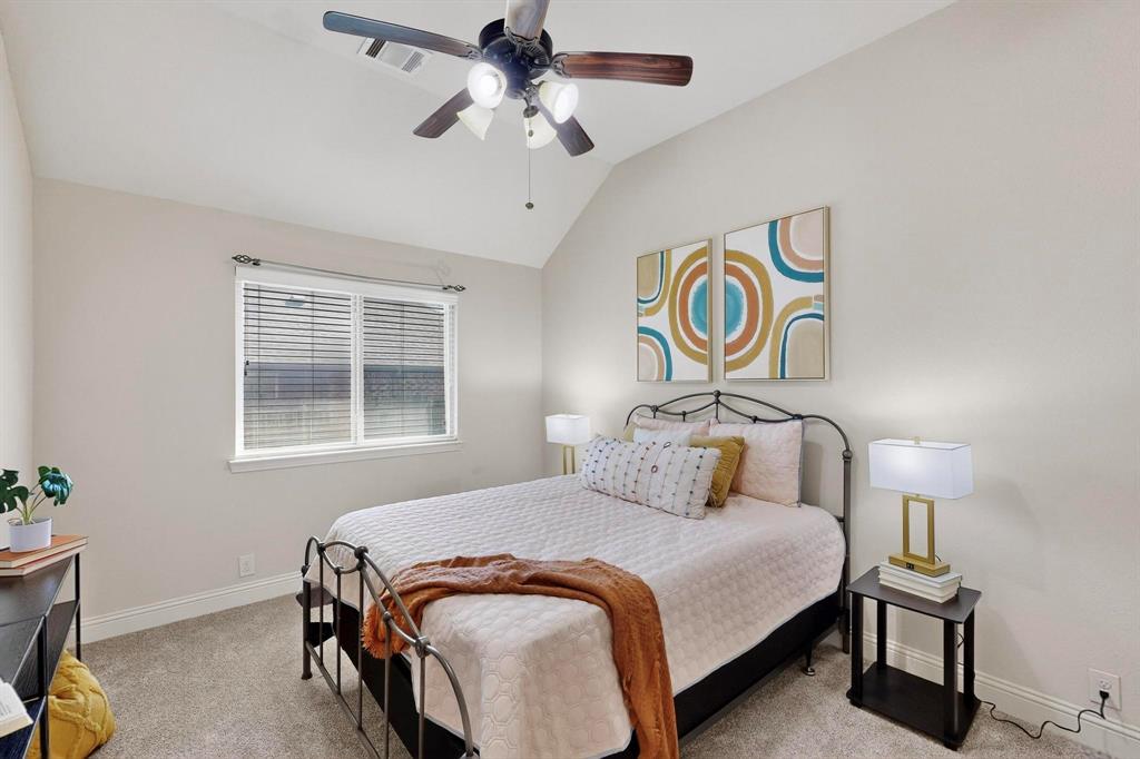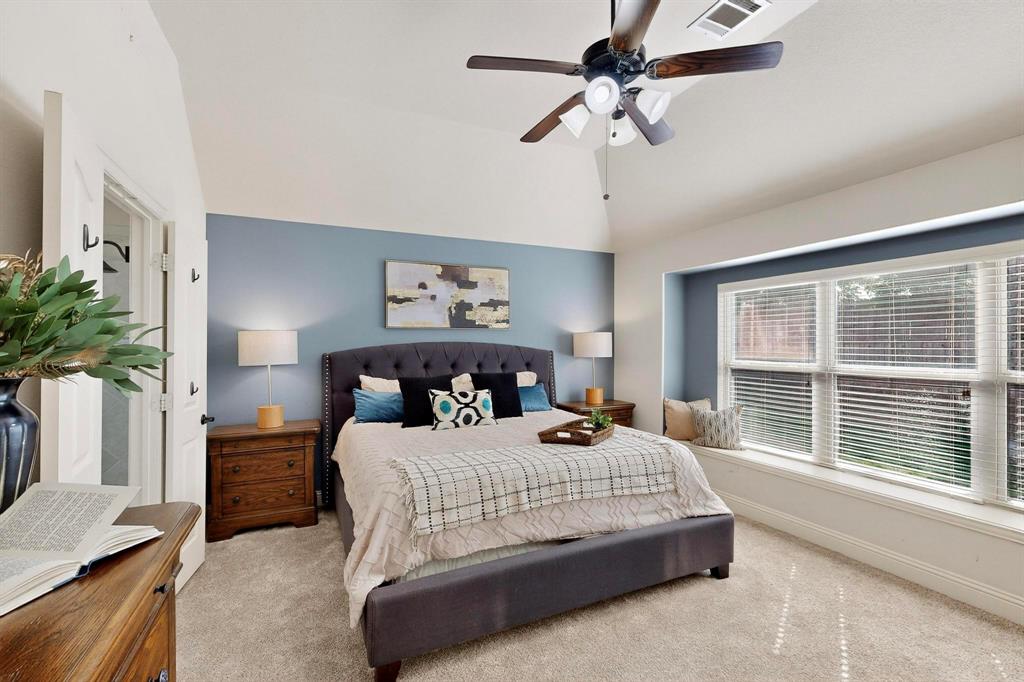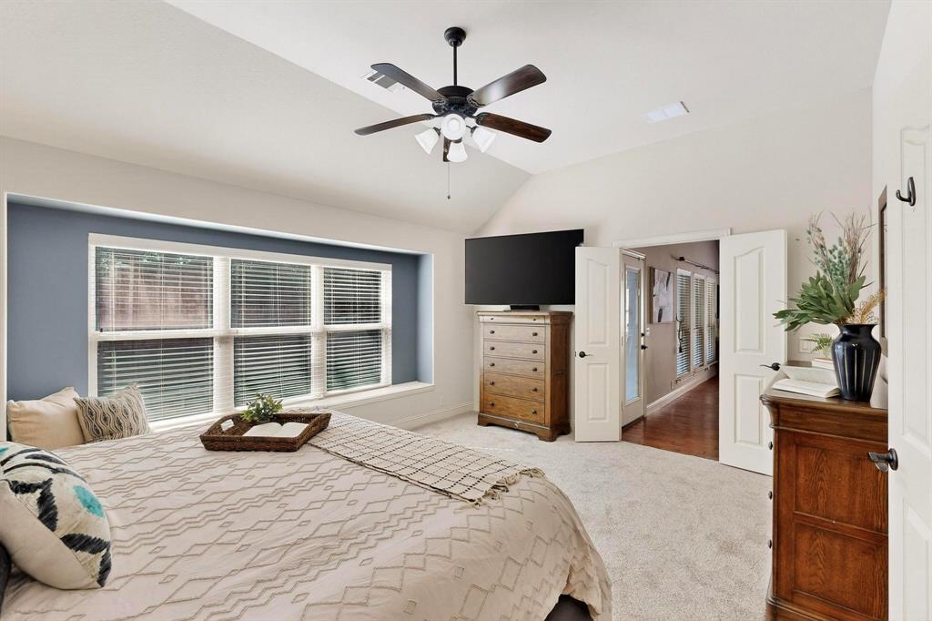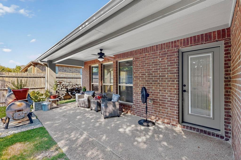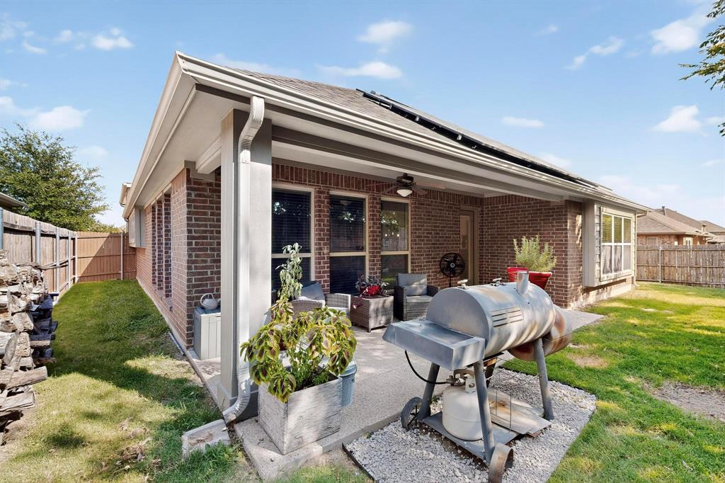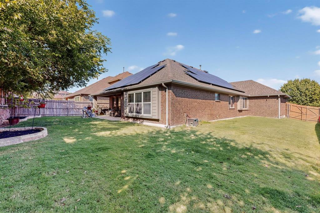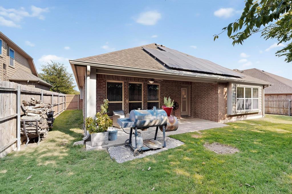 Welcome to 9204 Benbrook Lane, a gorgeous 3-bedroom, 2-bathroom home in the highly sought-after Country Lakes community of Argyle! This move-in ready East-facing home features an inviting open-concept design with brand new carpet, a spacious kitchen, dining, and living area perfect for entertaining. The kitchen is highlighted by stainless steel appliances and a gas cooktop, while large windows fill the living spaces with natural light. The primary suite offers a relaxing retreat with a cozy bay window sitting area, oversized shower, and generous walk-in closet. Secondary bedrooms are roomy and versatile, and the third-car garage provides extra space for storage, hobbies, or a workshop. Step outside to enjoy evenings on the extended front porch, or host weekend barbecues under the covered back patio overlooking a large backyard paradise with no rear neighbors—just wide-open fields for privacy. Recent updates include a brand-new roof replaced in 2024, upgraded outdoor wiring for holiday lights, and fully paid-off solar panels at closing—combining peace of mind with long-term energy savings. With its perfect blend of style, comfort, and modern upgrades, this Argyle treasure is priced to sell—and it won’t last long!
