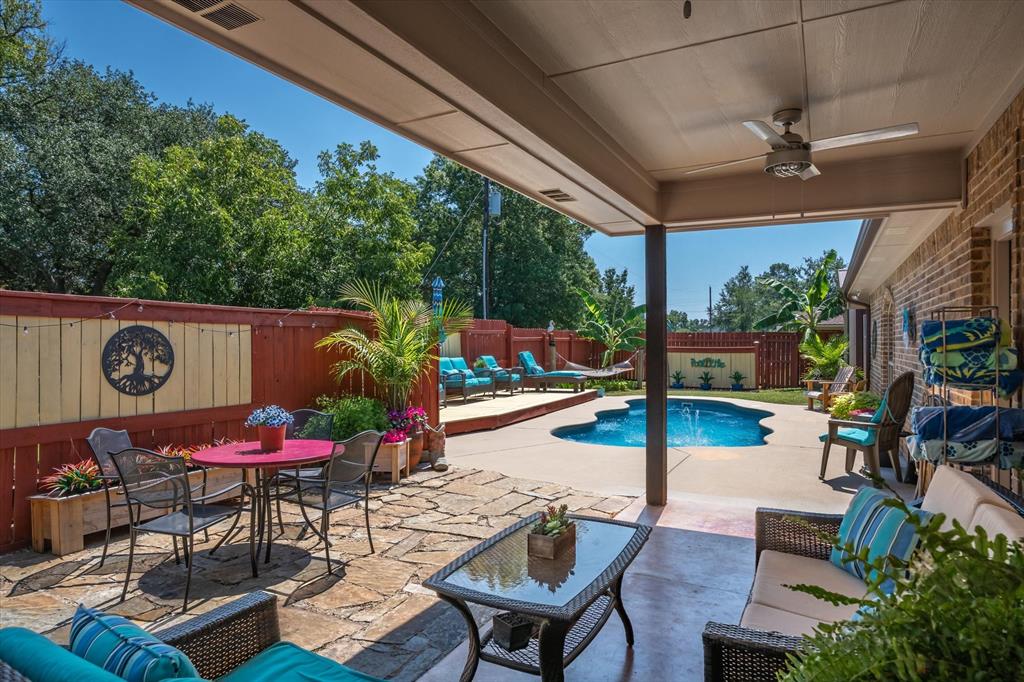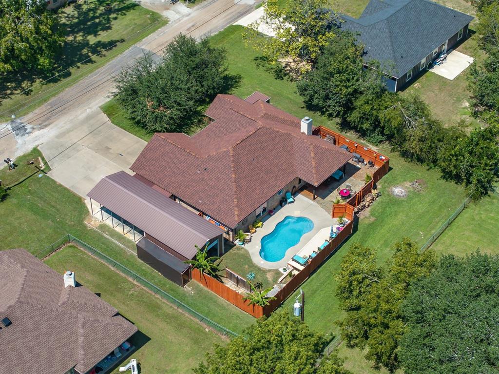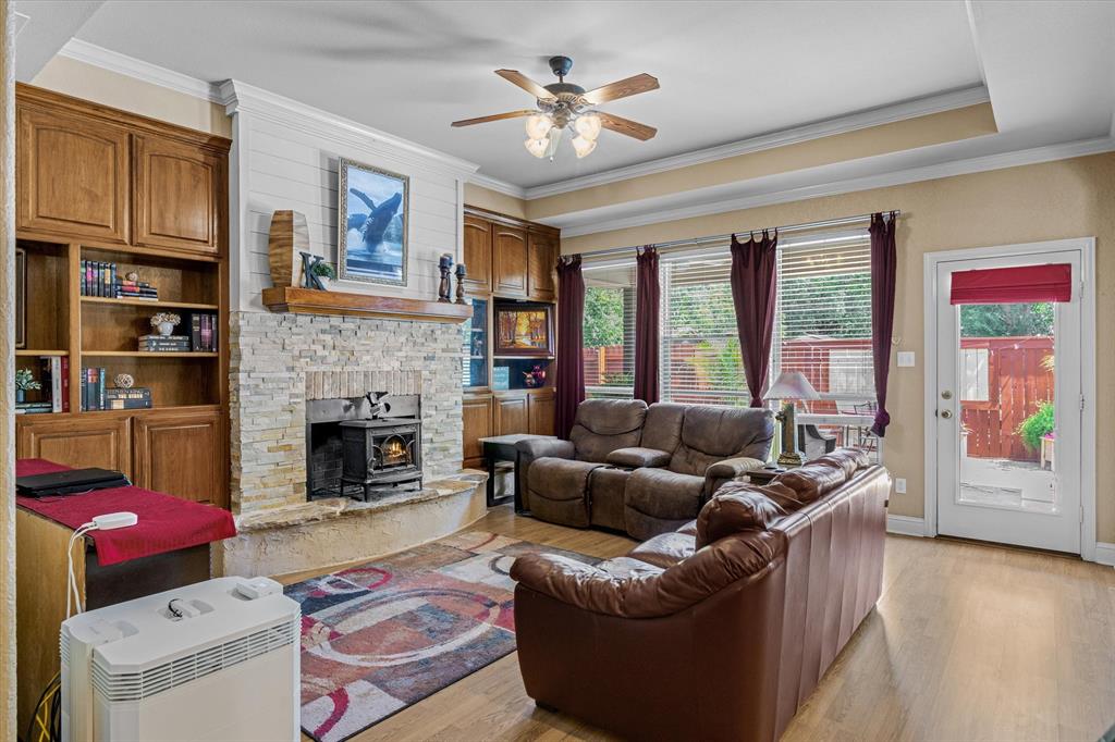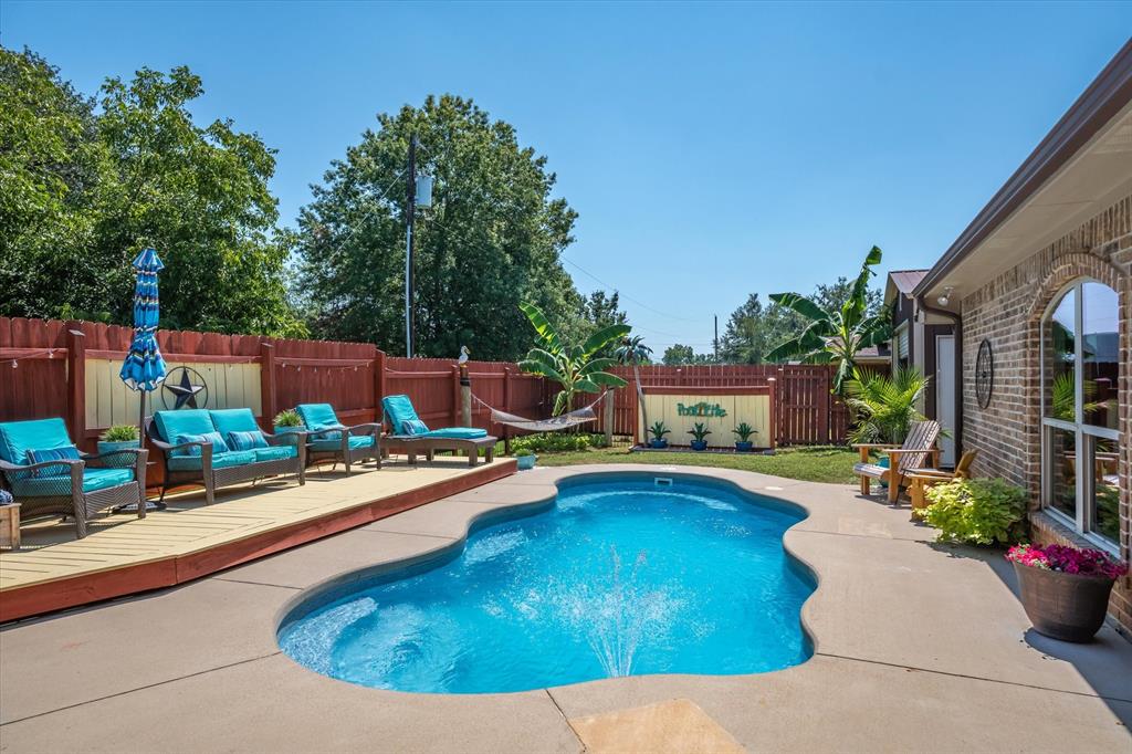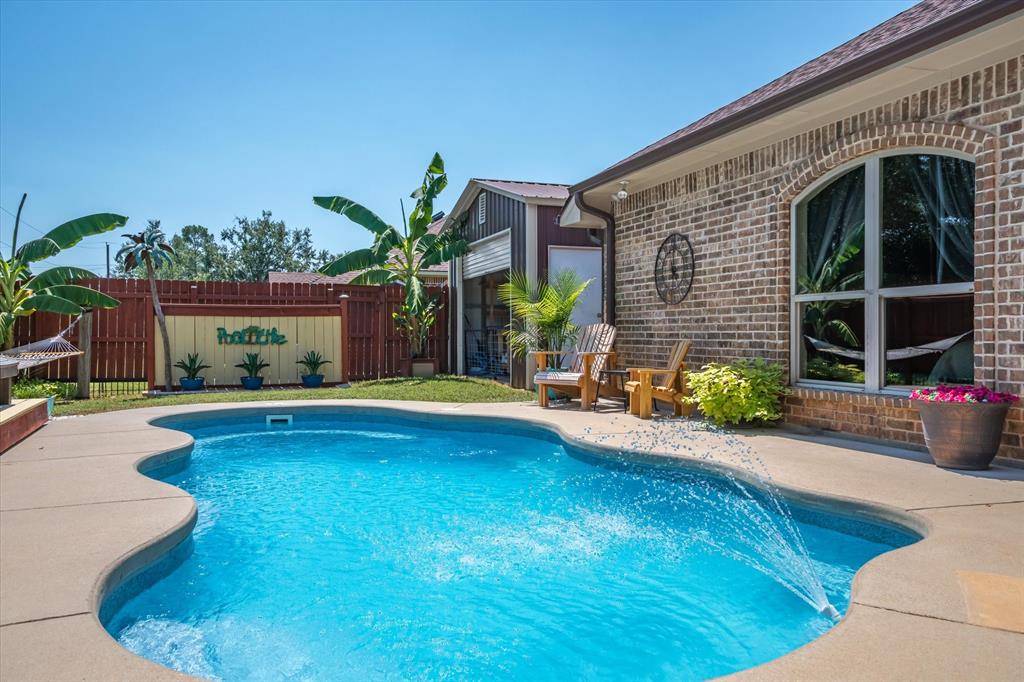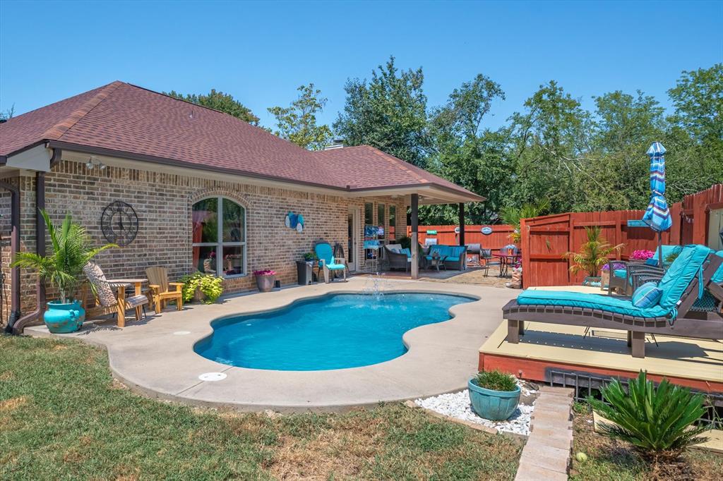 Stunning custom home showcasing timeless arches, soaring ceilings, and an open floor plan designed for entertaining. The spacious living area features a dramatic stone wood burning stove flanked by custom builtins, detailed crown molding, and abundant natural light. The large kitchen offers an island, ample storage, and a separate dining area for gatherings.The split bedroom layout ensures privacy, while the garage conversion adds a versatile second living space and storage area large enough for a motorcycle. Outside, enjoy your own backyard retreat with a sparkling pool, soothing water feature, deck for sunning, and a covered patio. Don't miss the additional yard space beyond the back fence. For hobbyists or extra storage, the property includes a shop with electricity, a covered carport, and additional storage buildings. Located within city limits and close to schools, this home blends convenience with custom features and has been meticulously maintained along with updates included Roof and gutters 2024, AC 2025, Water heater 2025, Pool pump 2025 and insulated garage door 2024.