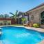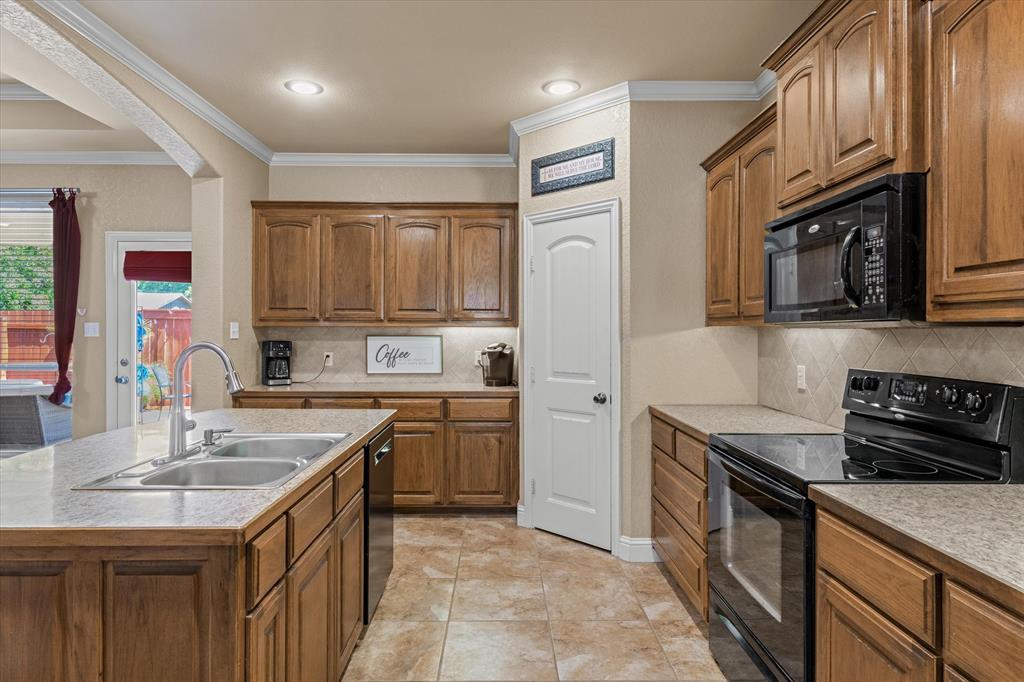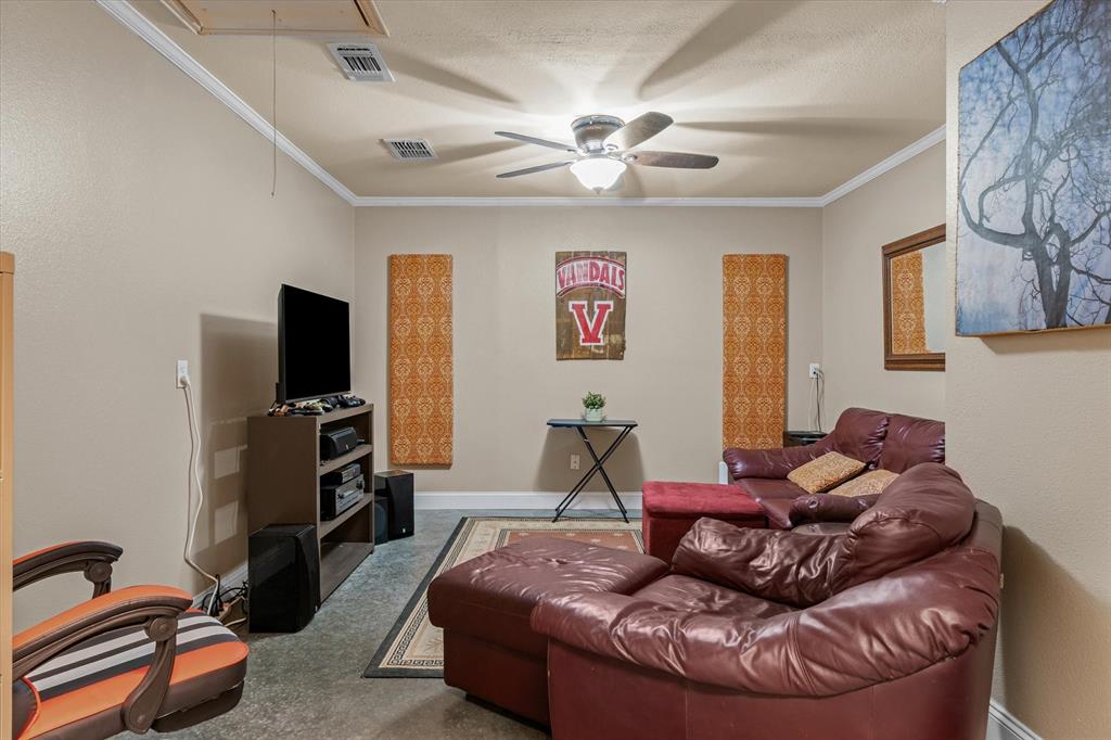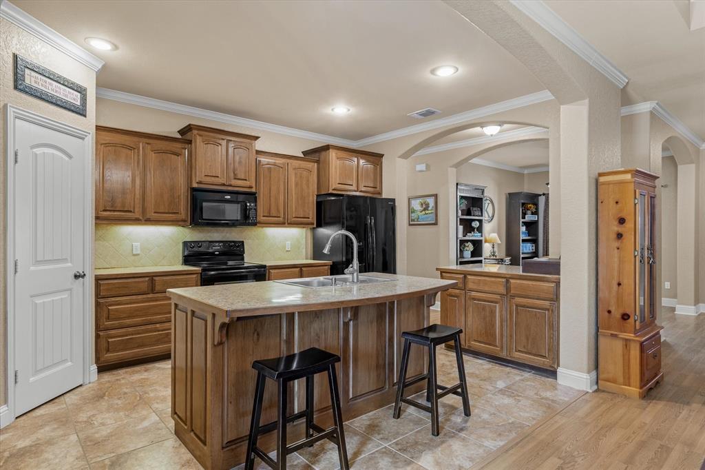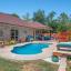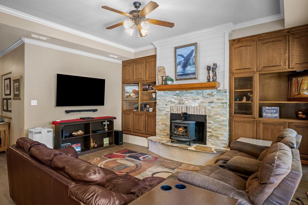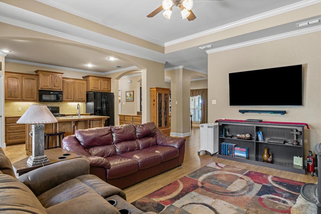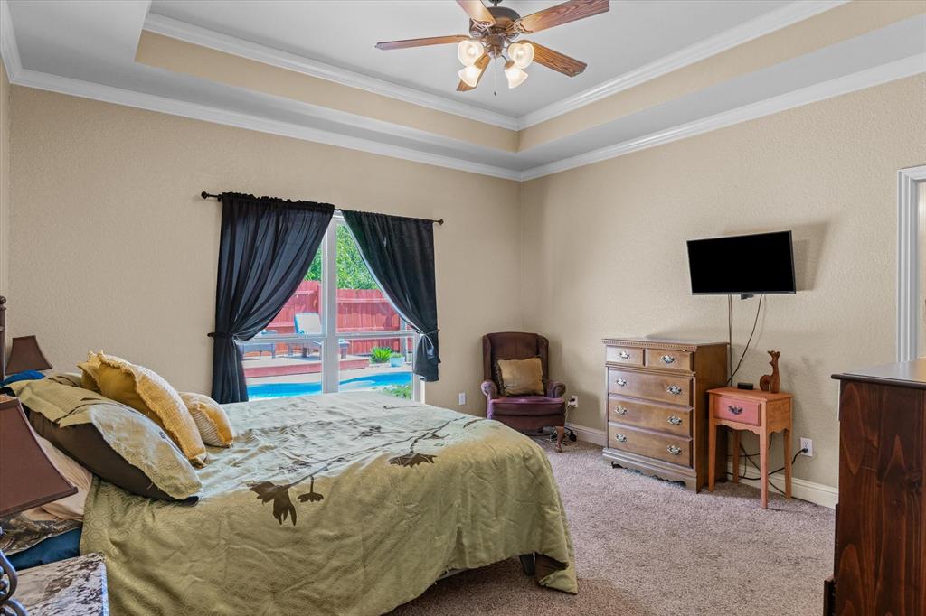 Stunning custom home showcasing timeless arches, soaring ceilings, and an open floor plan designed for entertaining. The spacious living area features a dramatic stone wood burning stove flanked by custom builtins, detailed crown molding, and abundant natural light. The large kitchen offers an island, ample storage, and a separate dining area for gatherings.The split bedroom layout ensures privacy, while the garage conversion adds a versatile second living space and storage area large enough for a motorcycle. Outside, enjoy your own backyard retreat with a sparkling pool, soothing water feature, deck for sunning, and a covered patio. Don't miss the additional yard space beyond the back fence. For hobbyists or extra storage, the property includes a shop with electricity, a covered carport, and additional storage buildings. Located within city limits and close to schools, this home blends convenience with custom features and has been meticulously maintained along with updates included Roof and gutters 2024, AC 2025, Water heater 2025, Pool pump 2025 and insulated garage door 2024.