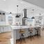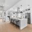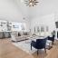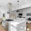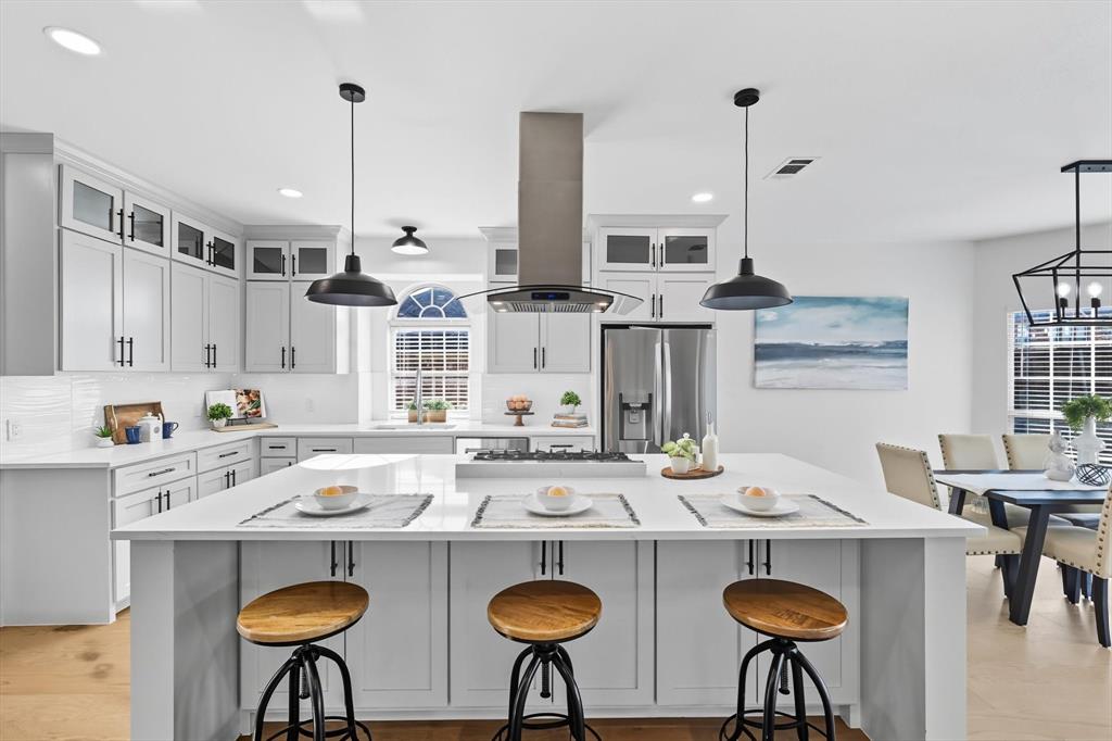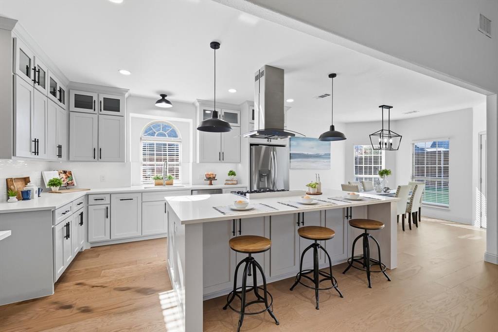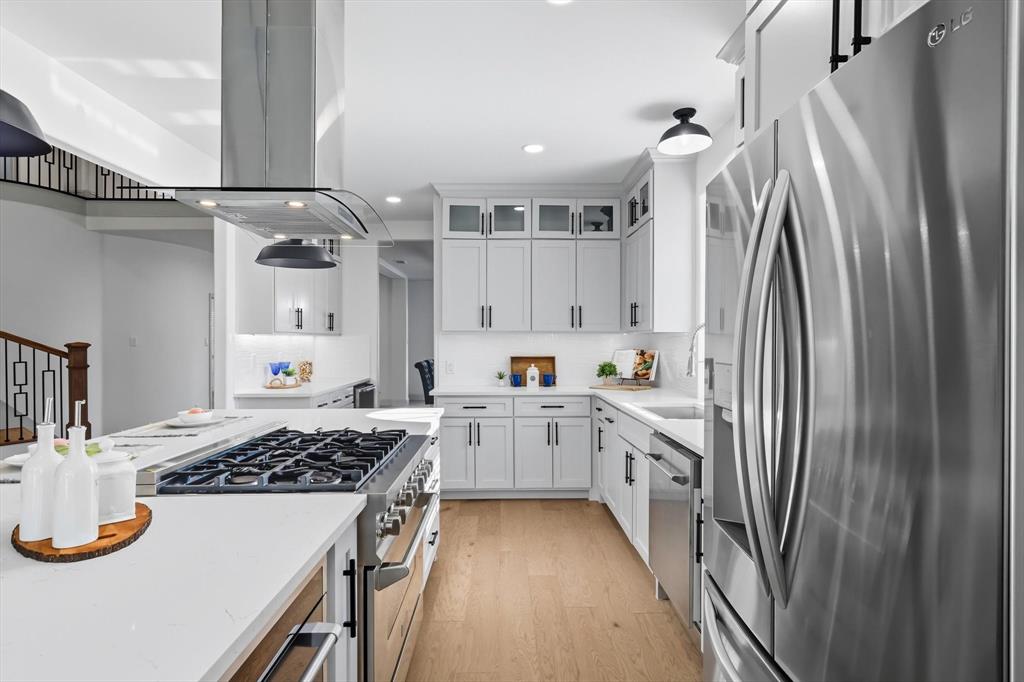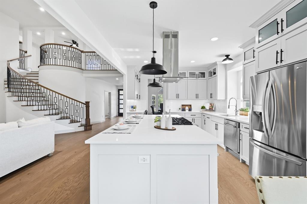The open-concept, light and bright layout centers around the gourmet kitchen, complete with quartz countertops, an oversized island with breakfast bar, 36” gourmet range, wine cooler, walk-in pantry, dishwasher, and microwave.