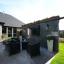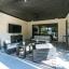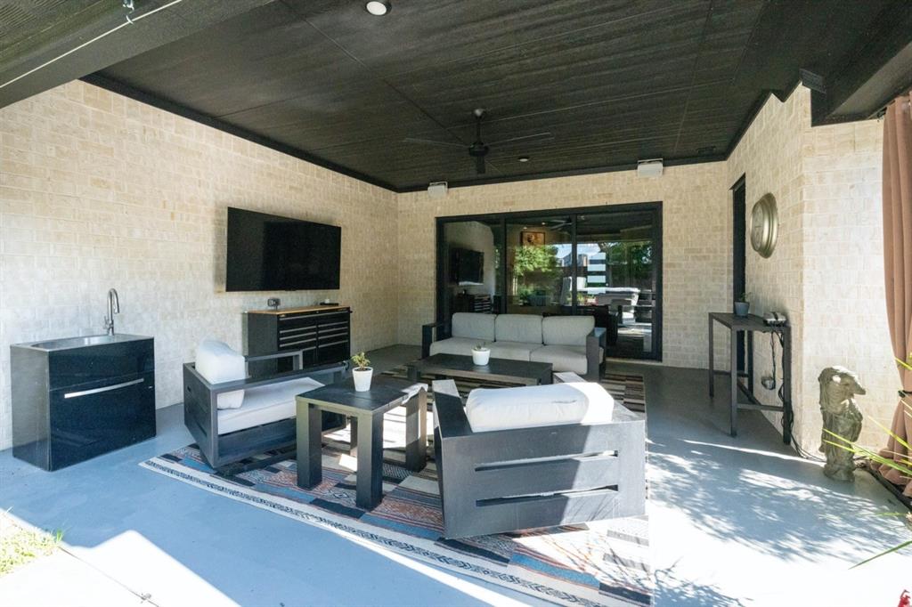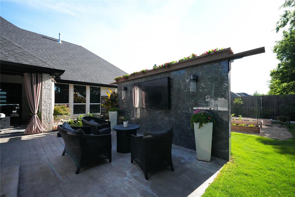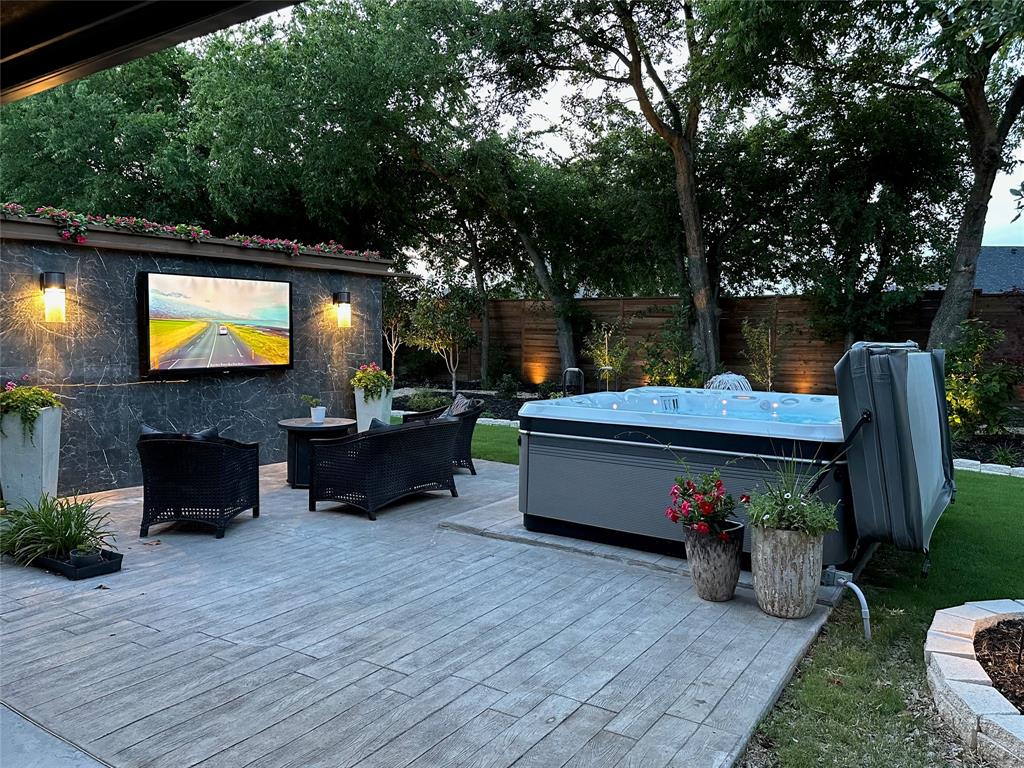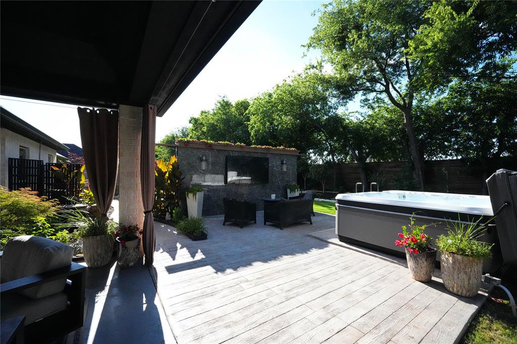 Outdoors, entertain or unwind in your private retreat. An extended covered patio with privacy curtains features a marble-faced media wall and a 75-inch outdoor TV, all viewable from the 8-seat saltwater spa with 74 jets, Bluetooth audio, and year-round temperature control.
