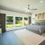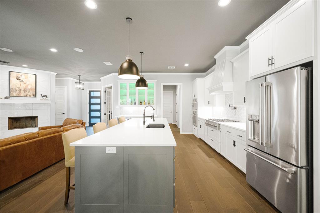 Inside, an open-concept layout is filled with natural light and anchored by a dramatic 3-panel sliding glass door system that seamlessly connects indoor and outdoor living. The chef’s kitchen is a centerpiece, featuring professional Café smart appliances, a gas cooktop with pot filler, quartz countertops, and extensive storage.