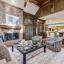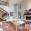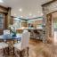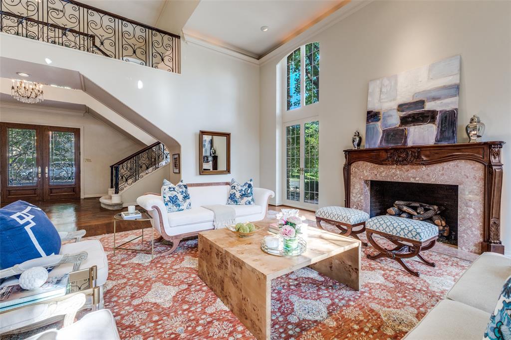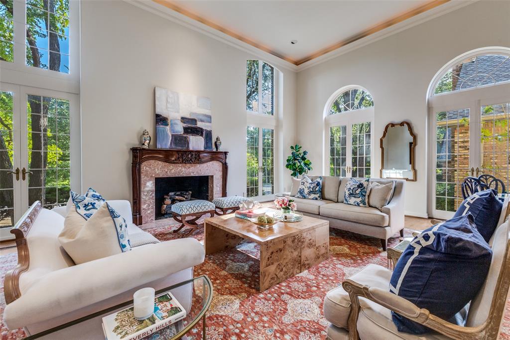 The main living area features a gas fireplace with a marble surround, framed by floor-to-ceiling windows offering serene views of the creek and walking trail. A second living area with its own marble fireplace opens to the chef’s kitchen, showcasing a built-in gas range, double ovens, warming drawer, and Sub-Zero refrigerator, freezer.