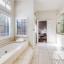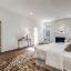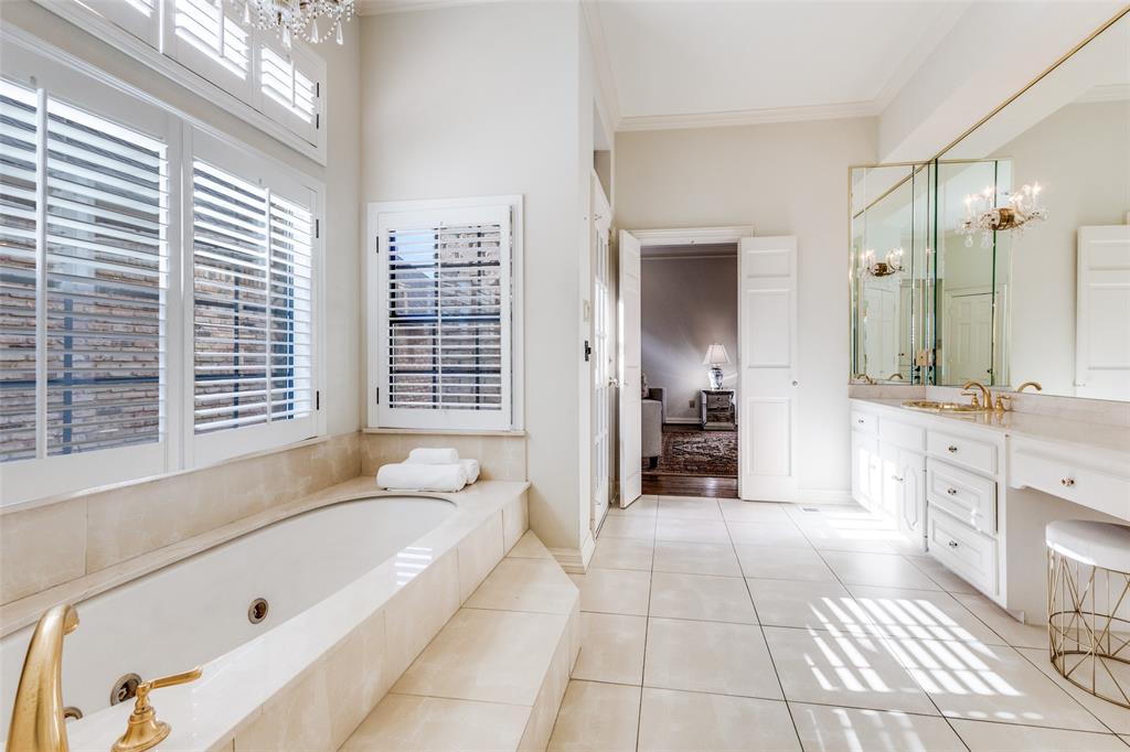 The grand primary suite is a private retreat with its own marble fireplace, direct courtyard access, dual walk-in closets, and luxurious his-and-hers baths—one with a soaking tub and the other with an oversized shower.