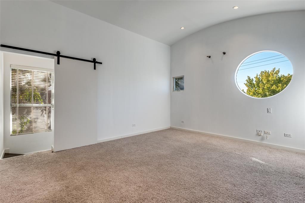 Wommack, blending distinctive details with functional spaces. Each oversized bedroom is privately situated on its own floor with ensuite bath and walk-in closet, creating the perfect retreat. The primary suite on the second level features an ensuite bath (oversized shower and two sinks), walk-in closet, built-in desk and brand-new carpet. The top-floor suite is enhanced by cathedral ceilings, unique windows, barn-door and its own private entrance, making it ideal for guests or roommates.