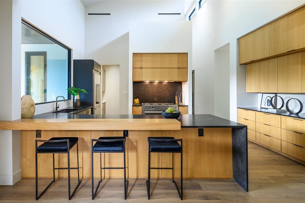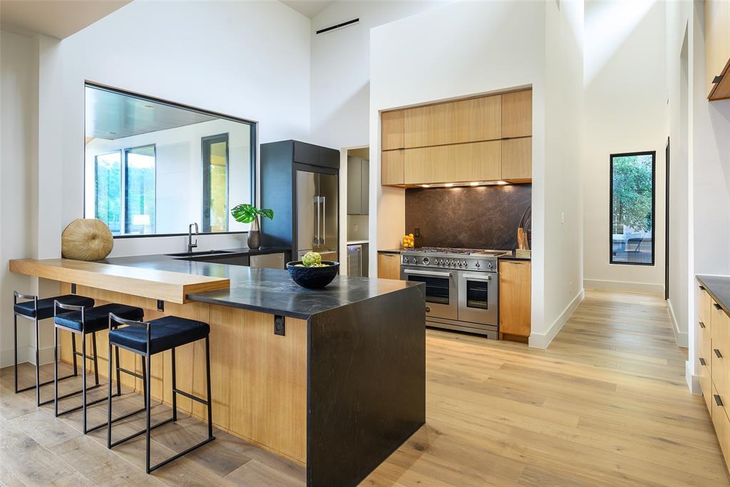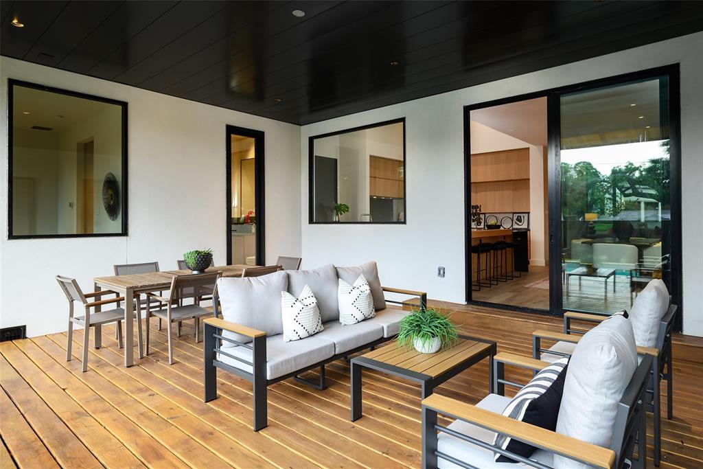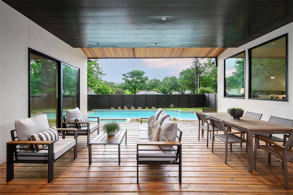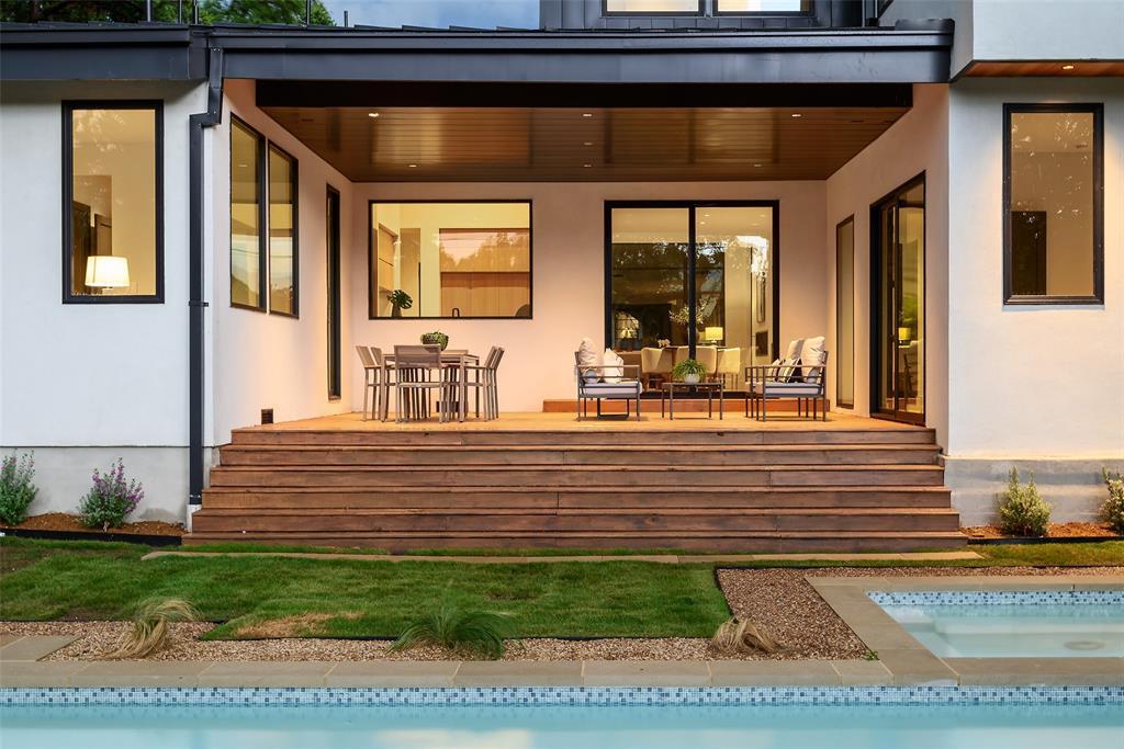 Interior finishes include warm wide-plank wood flooring, quartzite and marble surfaces, and carefully selected natural stone elements, all contributing to a refined and timeless aesthetic. Outdoor amenities include a luxurious pool and an expansive covered deck with distinct areas for lounging and dining.