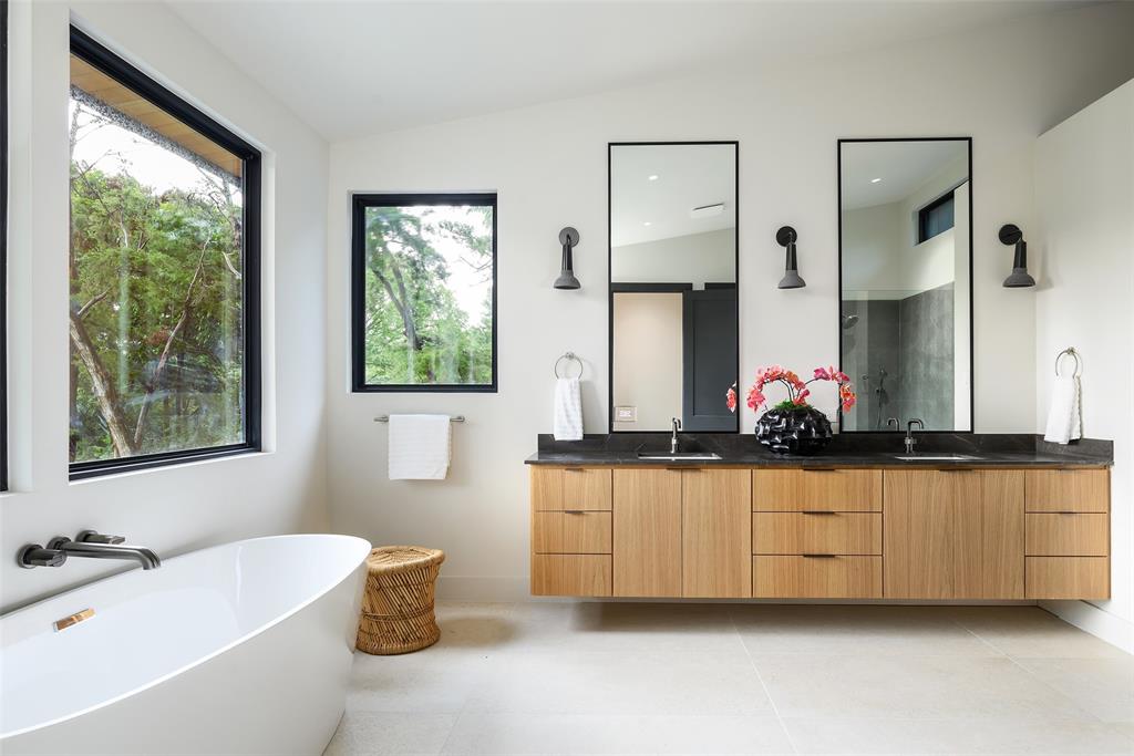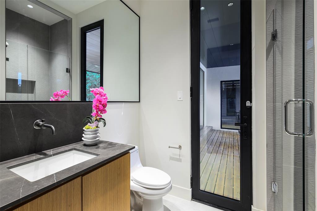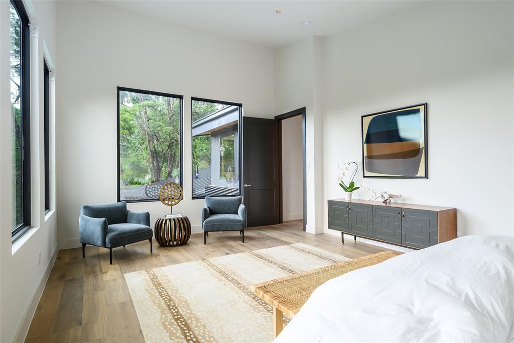 Encompassing 3,449 square feet on a beautifully treed 0.24-acre lot, the home offers four bedrooms, four full baths, one half bath, and an attached two-car garage. Its architectural design is defined by clean lines, expansive walls of glass, and a seamless integration of indoor and outdoor living.