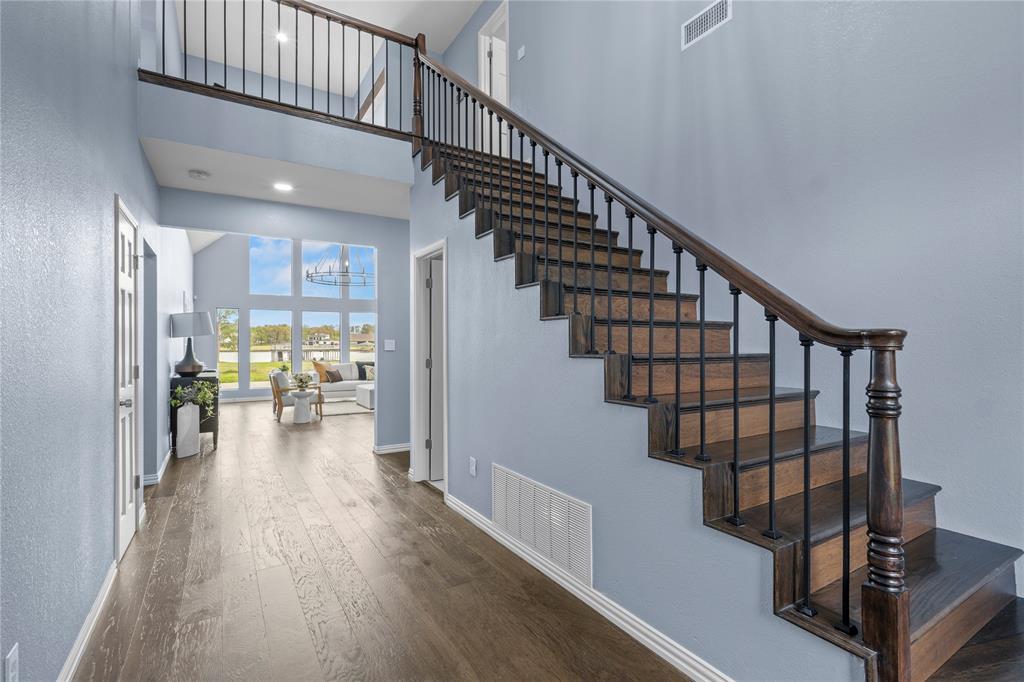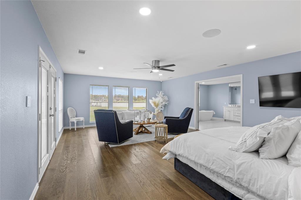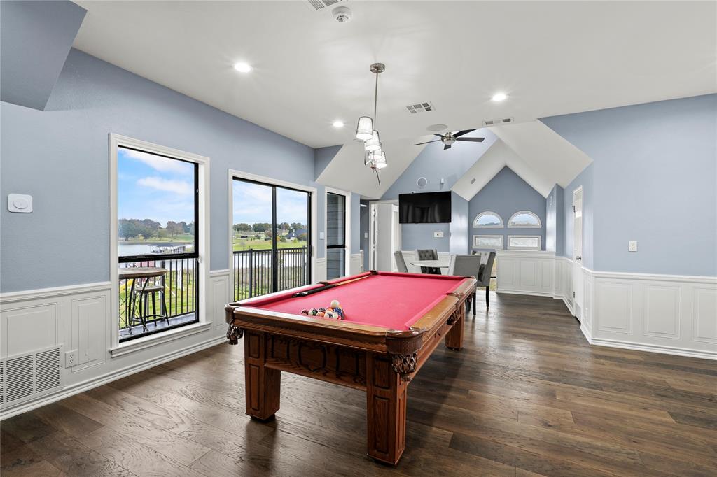 The primary suite offers a serene retreat with panoramic views, a spa-like en-suite with soaking tub, walk-in shower, double vanity, and a spacious walk-in closet. Upstairs, enjoy a game room, movie room, additional bedrooms, and two balconies overlooking the lake.