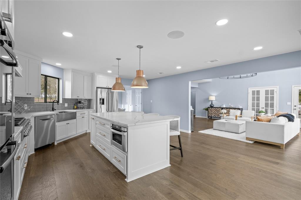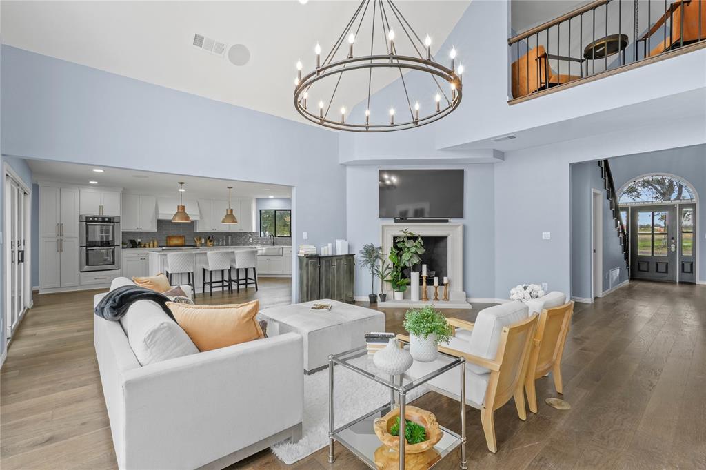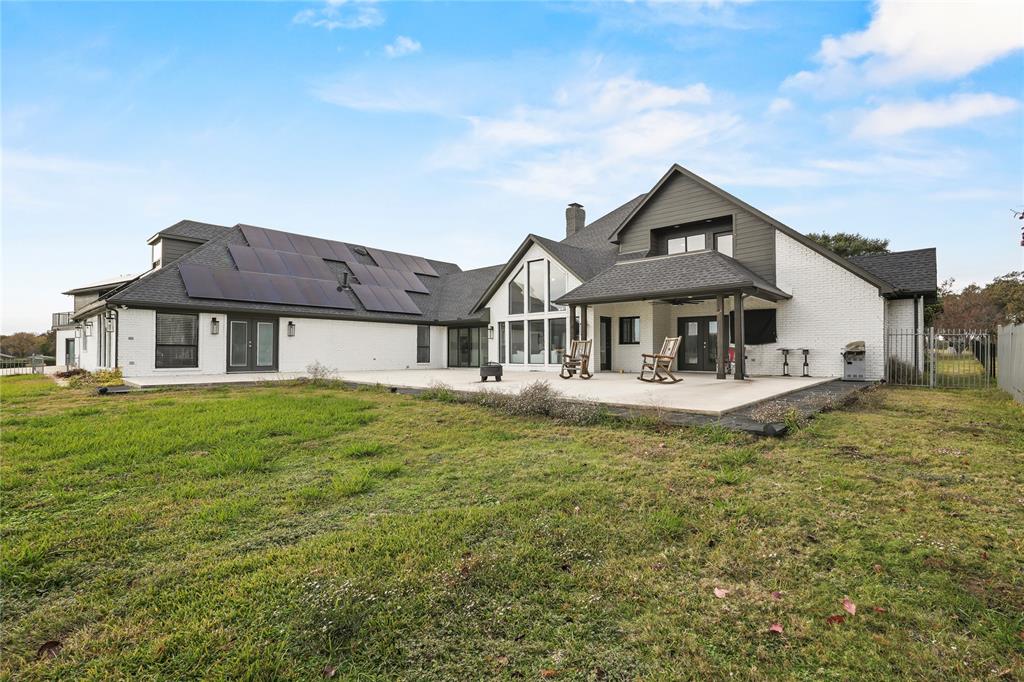 This solar-powered residence spans over 7,000 sq. ft. of thoughtfully designed space, featuring 6 private bedrooms, 9 bathrooms, an office, and an impressive 6-car garage with additional carport. Expansive windows in the living area frame breathtaking lake views, flowing seamlessly into the gourmet kitchen with a large island, Bosch appliances, quartz countertops, and a designer vent hood.