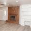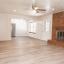 Spacious living area and dining are open to one another. Brick wood burning fireplace and built in desk with bookshelves in the living area.