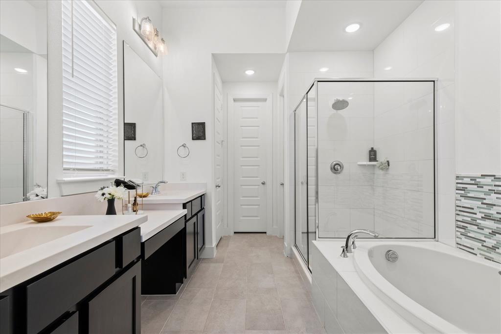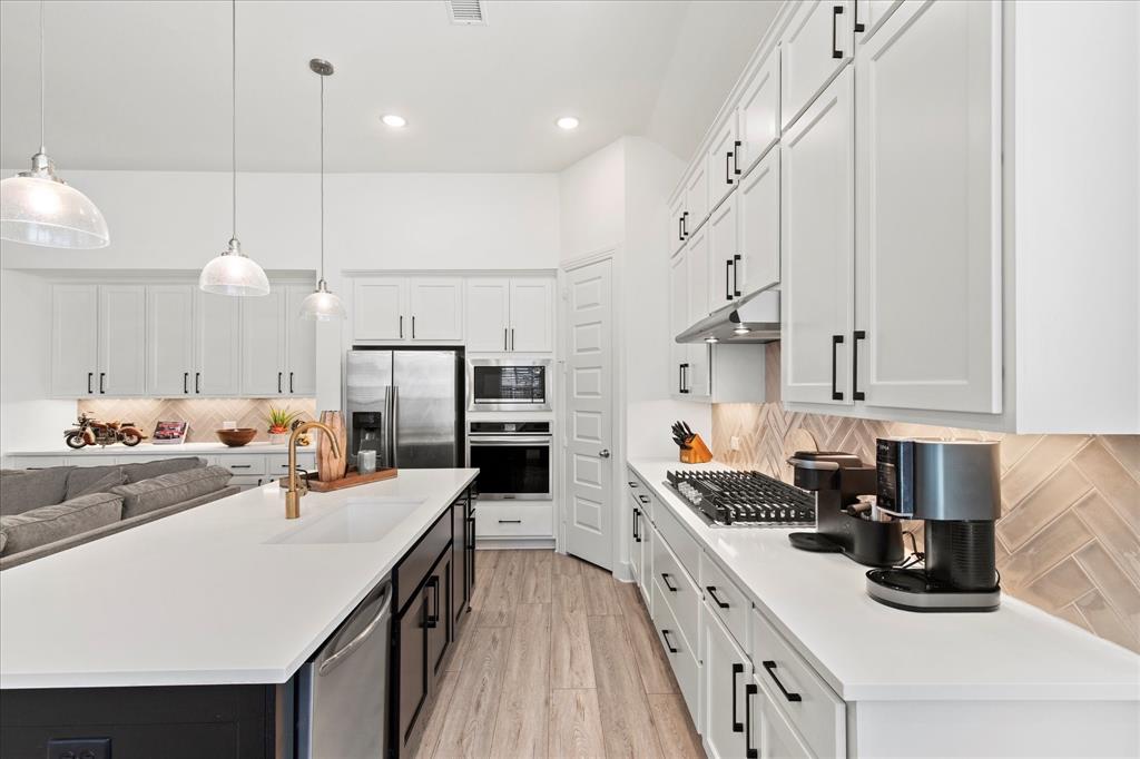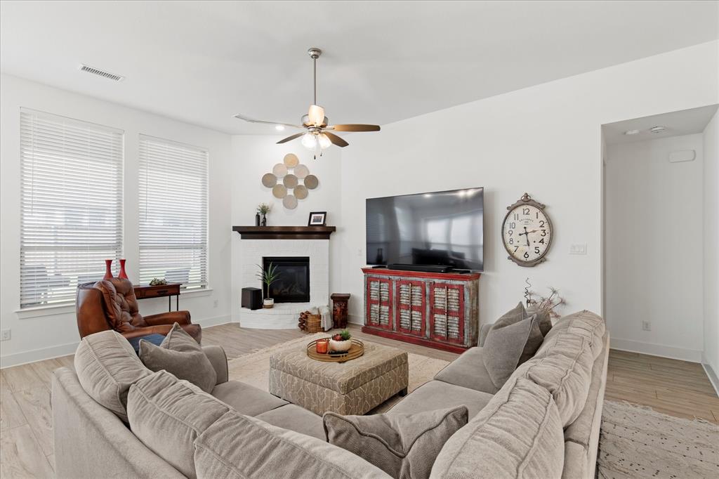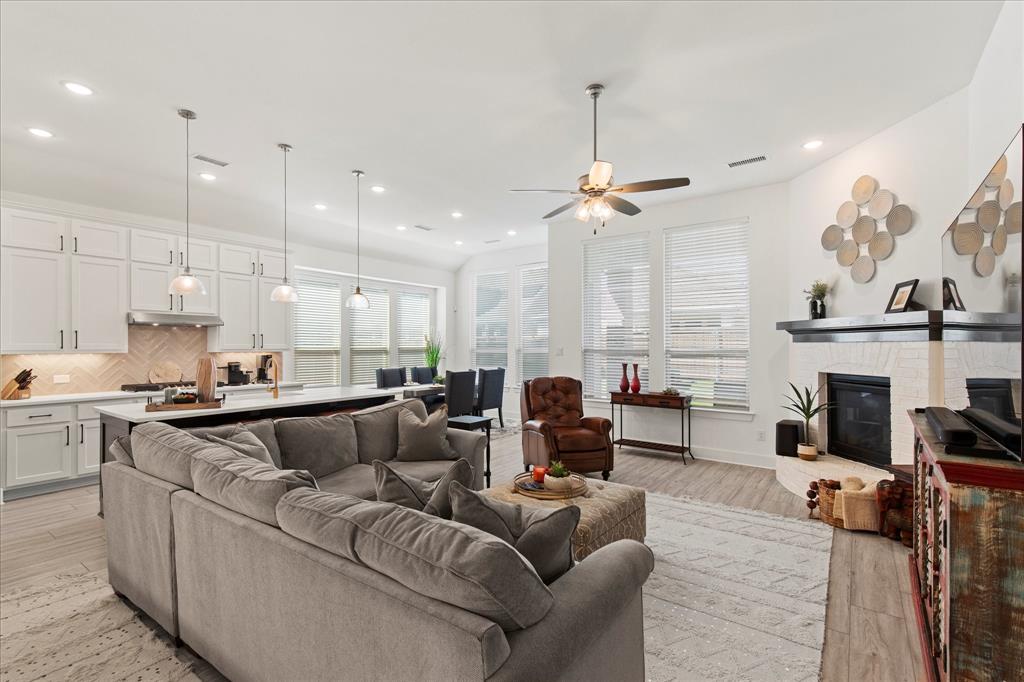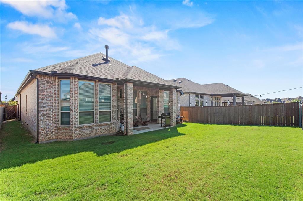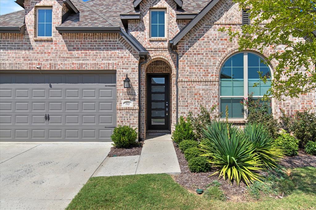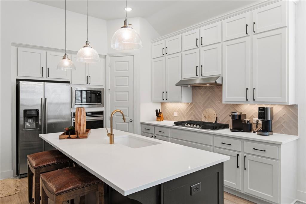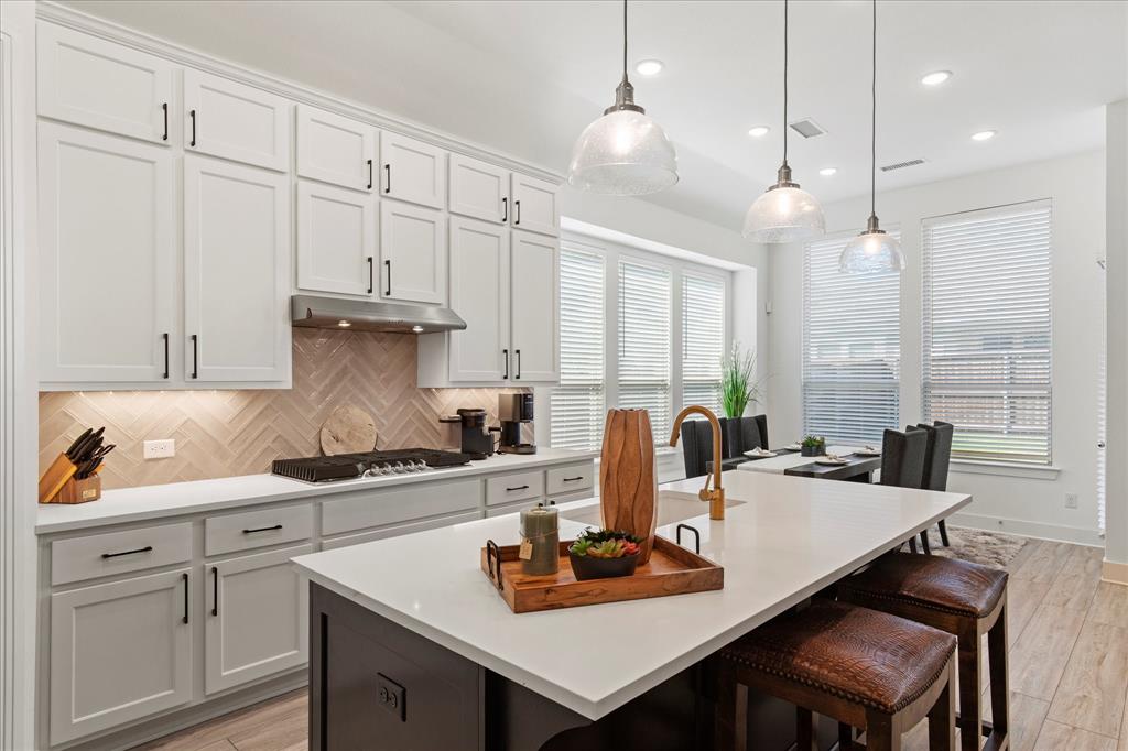 This a beautifully crafted brick-exterior residence combines spacious living with modern luxury in a neighborhood packed with amenities. Four bedrooms plus a dedicated office with elegant French doors create the perfect balance between family comfort and home-office convenience. The kitchen is a chef’s delight, dressed in white shaker cabinetry and quartz counters, anchored by a large island with seating, complete with a gas cooktop, corner pantry, glass tile backsplash, and a built-in serving bar that make every meal and gathering a pleasure. Step into the heart of the home: a centrally located living room warmed by a painted brick fireplace crowned with a dark wood stained mantle. Your primary suite gives you extra room to unwind, with bay windows that fill the space with light, an ensuite featuring a garden tub, separate shower, dual sinks, and a vanity area. One of the guest bedrooms also enjoys its own ensuite bath—ideal for guests or multigenerational living. Outside, a privacy-fenced backyard and covered patio create a serene outdoor escape, while the neighborhood delights with multiple playgrounds and a large community pool just steps away. Welcome home.