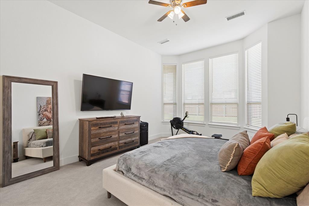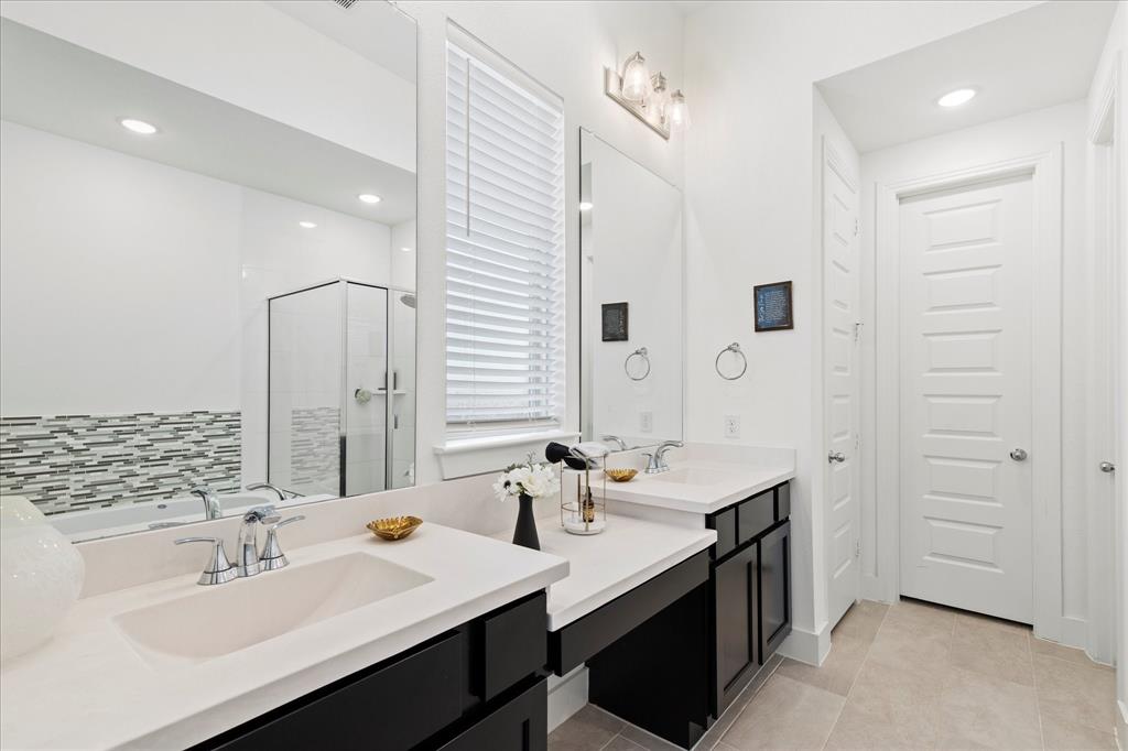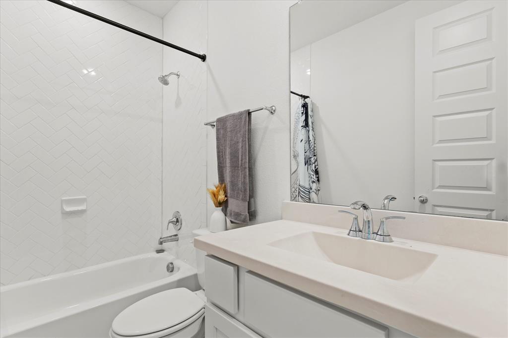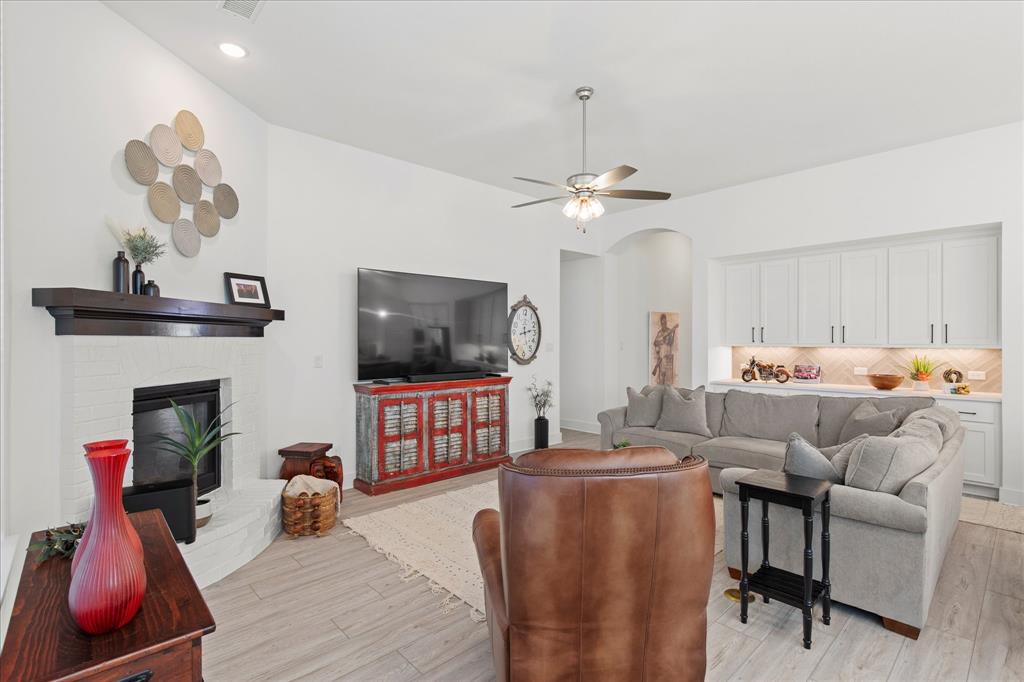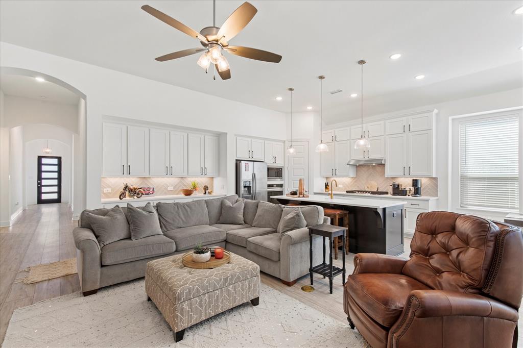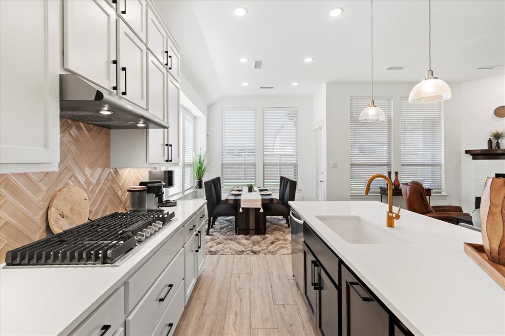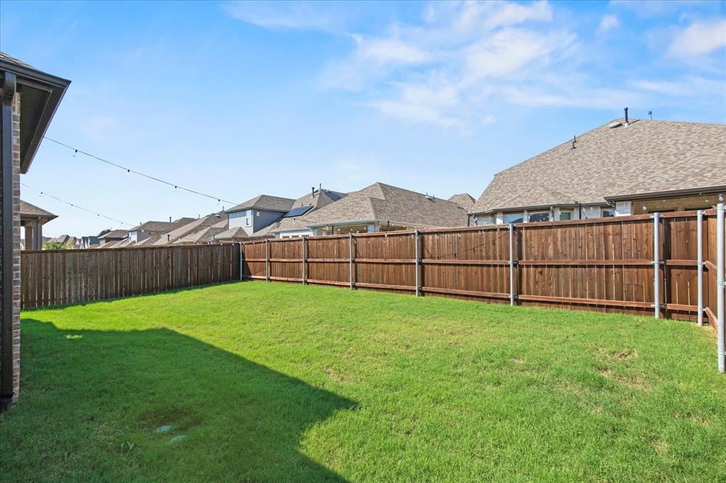 This a beautifully crafted brick-exterior residence combines spacious living with modern luxury in a neighborhood packed with amenities. Four bedrooms plus a dedicated office with elegant French doors create the perfect balance between family comfort and home-office convenience. The kitchen is a chef’s delight, dressed in white shaker cabinetry and quartz counters, anchored by a large island with seating, complete with a gas cooktop, corner pantry, glass tile backsplash, and a built-in serving bar that make every meal and gathering a pleasure. Step into the heart of the home: a centrally located living room warmed by a painted brick fireplace crowned with a dark wood stained mantle. Your primary suite gives you extra room to unwind, with bay windows that fill the space with light, an ensuite featuring a garden tub, separate shower, dual sinks, and a vanity area. One of the guest bedrooms also enjoys its own ensuite bath—ideal for guests or multigenerational living. Outside, a privacy-fenced backyard and covered patio create a serene outdoor escape, while the neighborhood delights with multiple playgrounds and a large community pool just steps away. Welcome home.