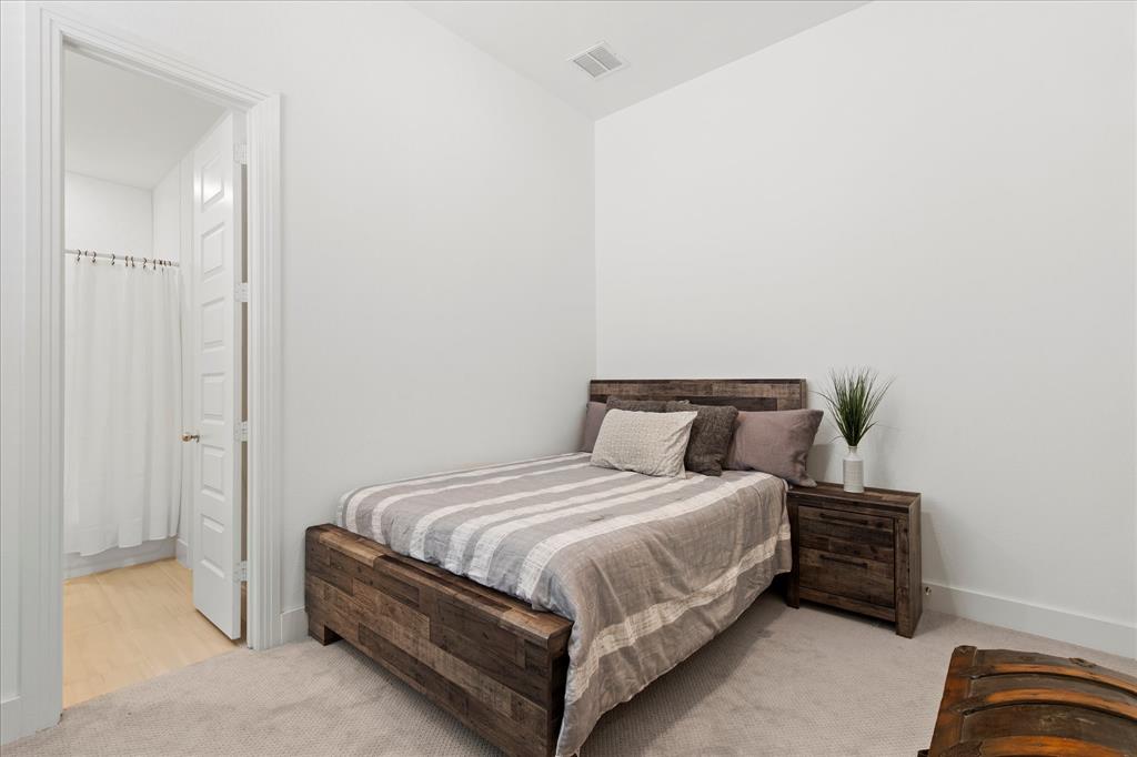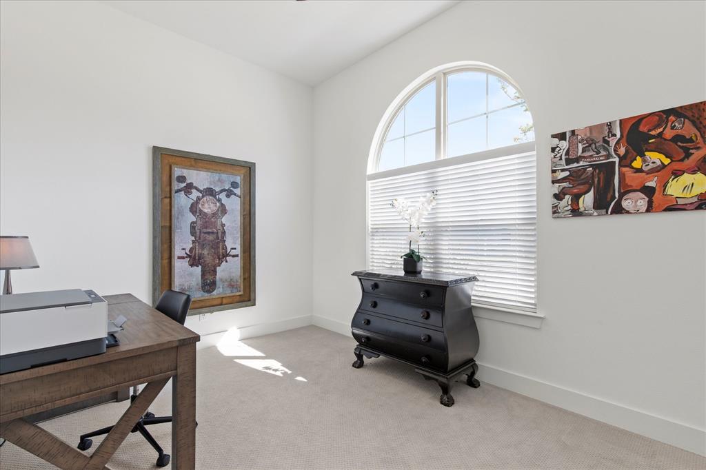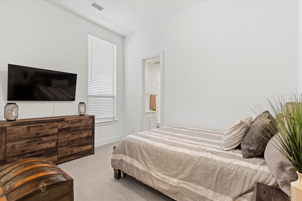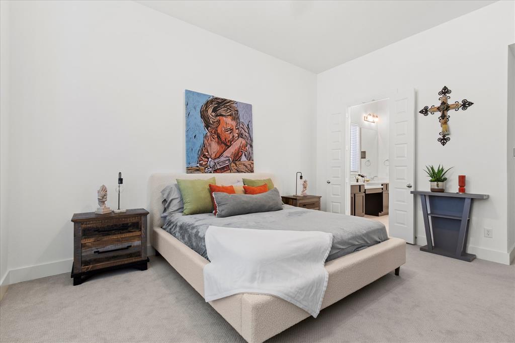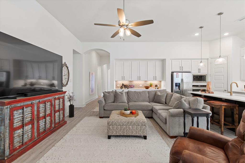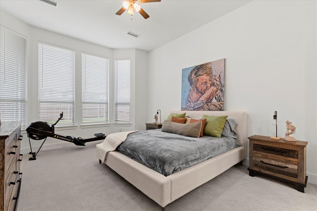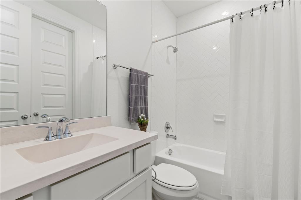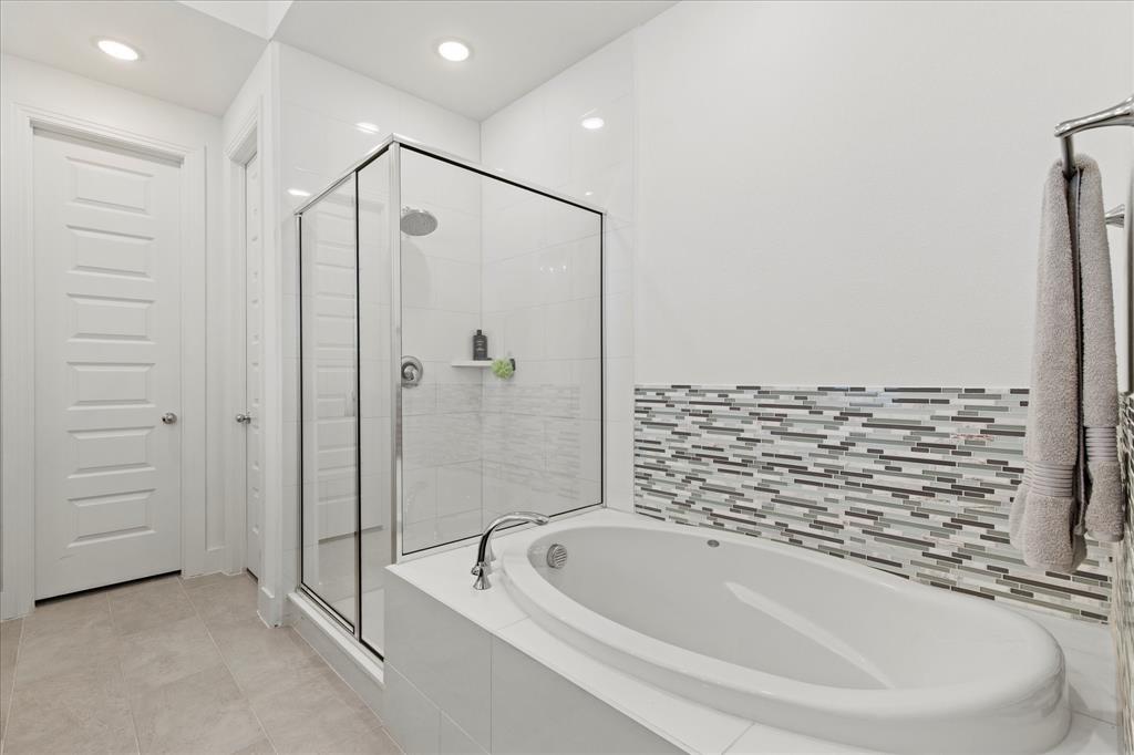 This a beautifully crafted brick-exterior residence combines spacious living with modern luxury in a neighborhood packed with amenities. Four bedrooms plus a dedicated office with elegant French doors create the perfect balance between family comfort and home-office convenience. The kitchen is a chef’s delight, dressed in white shaker cabinetry and quartz counters, anchored by a large island with seating, complete with a gas cooktop, corner pantry, glass tile backsplash, and a built-in serving bar that make every meal and gathering a pleasure. Step into the heart of the home: a centrally located living room warmed by a painted brick fireplace crowned with a dark wood stained mantle. Your primary suite gives you extra room to unwind, with bay windows that fill the space with light, an ensuite featuring a garden tub, separate shower, dual sinks, and a vanity area. One of the guest bedrooms also enjoys its own ensuite bath—ideal for guests or multigenerational living. Outside, a privacy-fenced backyard and covered patio create a serene outdoor escape, while the neighborhood delights with multiple playgrounds and a large community pool just steps away. Welcome home.