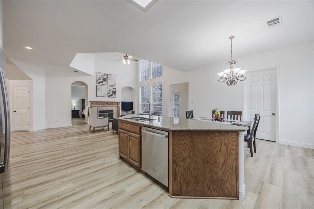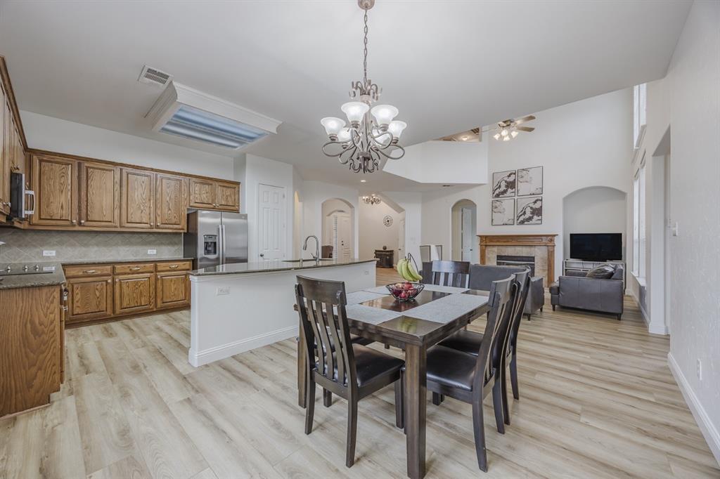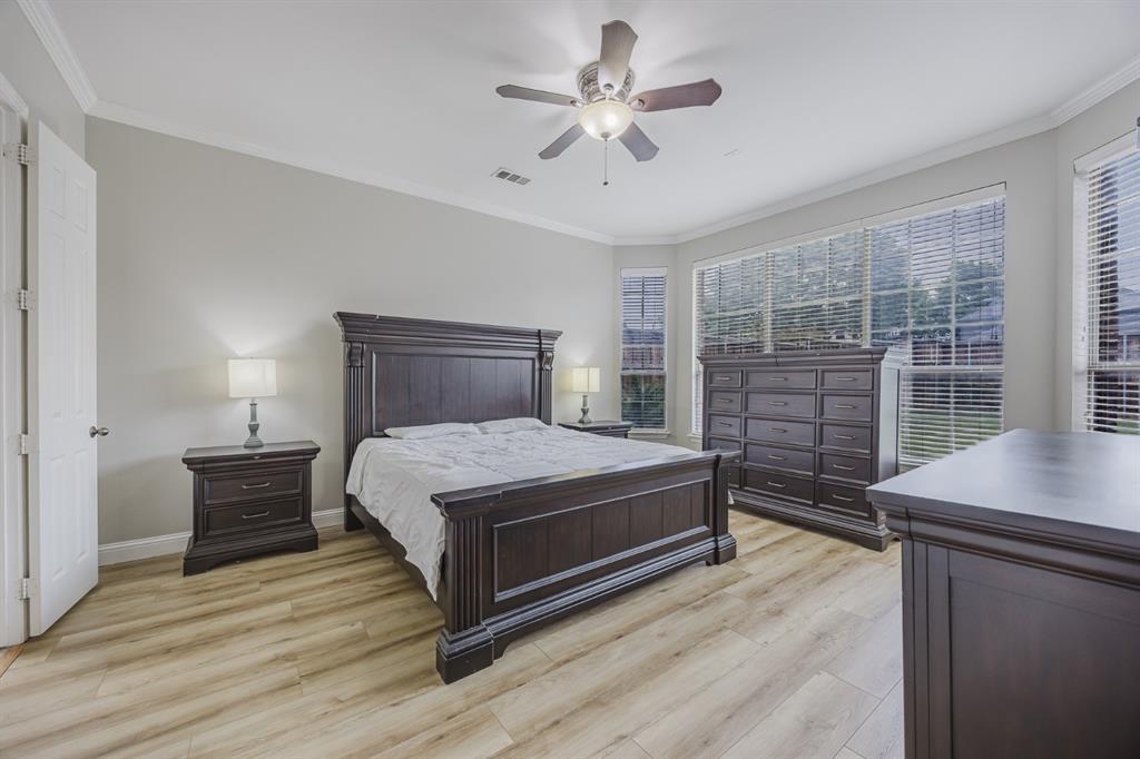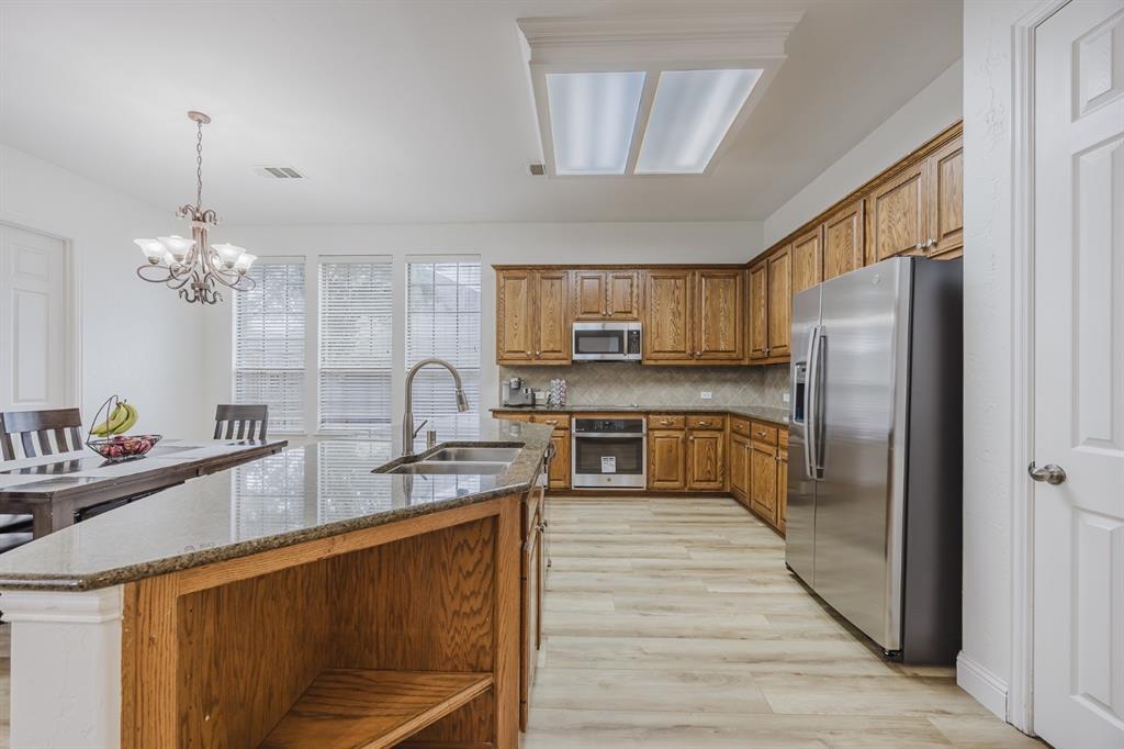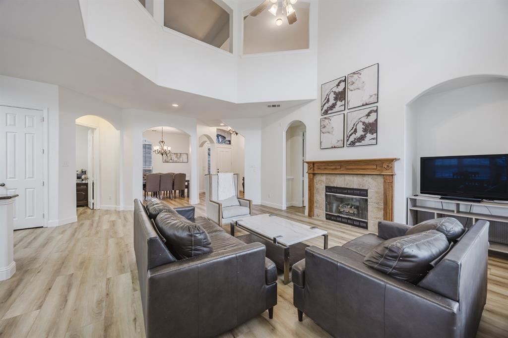 Recent 2025 upgrades: roof, HVAC, flooring, interior paint, and appliances. Beautiful 5-bedroom, 4.5-bath Drees custom home in Meadow Hill Estates of Frisco offering 3,415 sq. ft. of open, thoughtfully designed living space. The grand living room features vaulted ceilings, a fireplace, and abundant natural light. The kitchen includes a large granite island, stainless steel appliances, and a breakfast area. The primary suite offers dual vanities, soaking tub, and separate shower. A first-floor guest suite with private bath is ideal for visitors or a home office. Upstairs provides three additional bedrooms, two full baths, an open game room, and a spacious media room. The oversized backyard includes a board-on-board fence and extended patio for entertaining. Located on a large lot in Frisco ISD with easy access to DNT, Preston Rd, US-380, SH-121, shopping, dining, and Warren Sports Complex. With updates, a flexible layout, and prime location, this home is move-in ready.