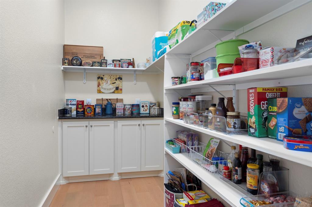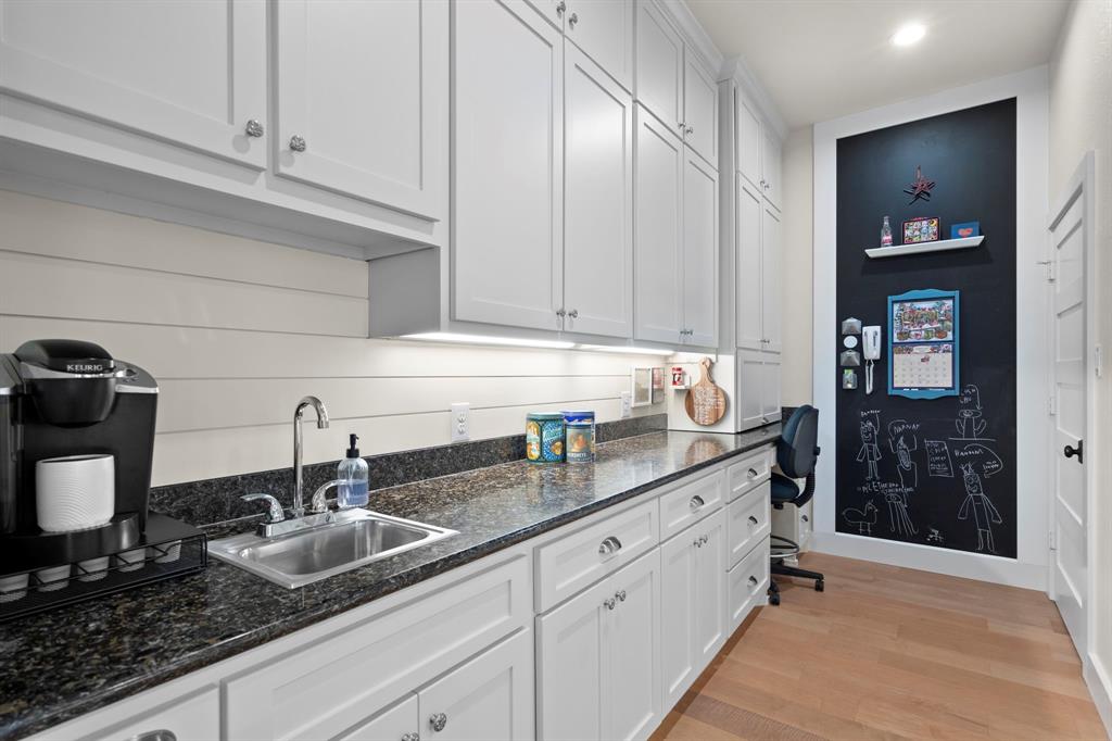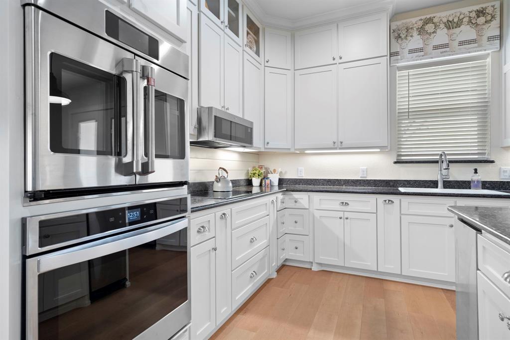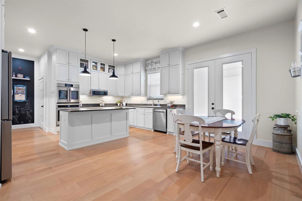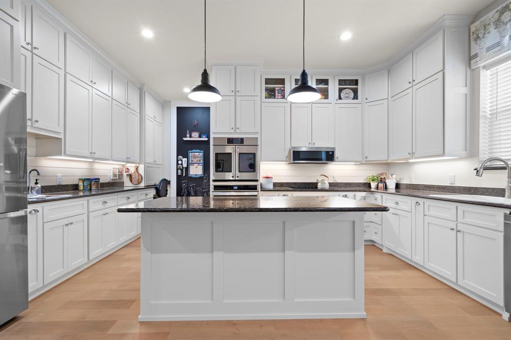 At the heart of the home, the gourmet kitchen is a chef’s dream—complete with dual sinks, double ovens, an oversized island, generous cabinetry, ample counter space, and a walk-in pantry that can easily accommodate all your culinary needs. Whether hosting a dinner party or preparing daily meals, this space combines functionality with custom finishes throughout.