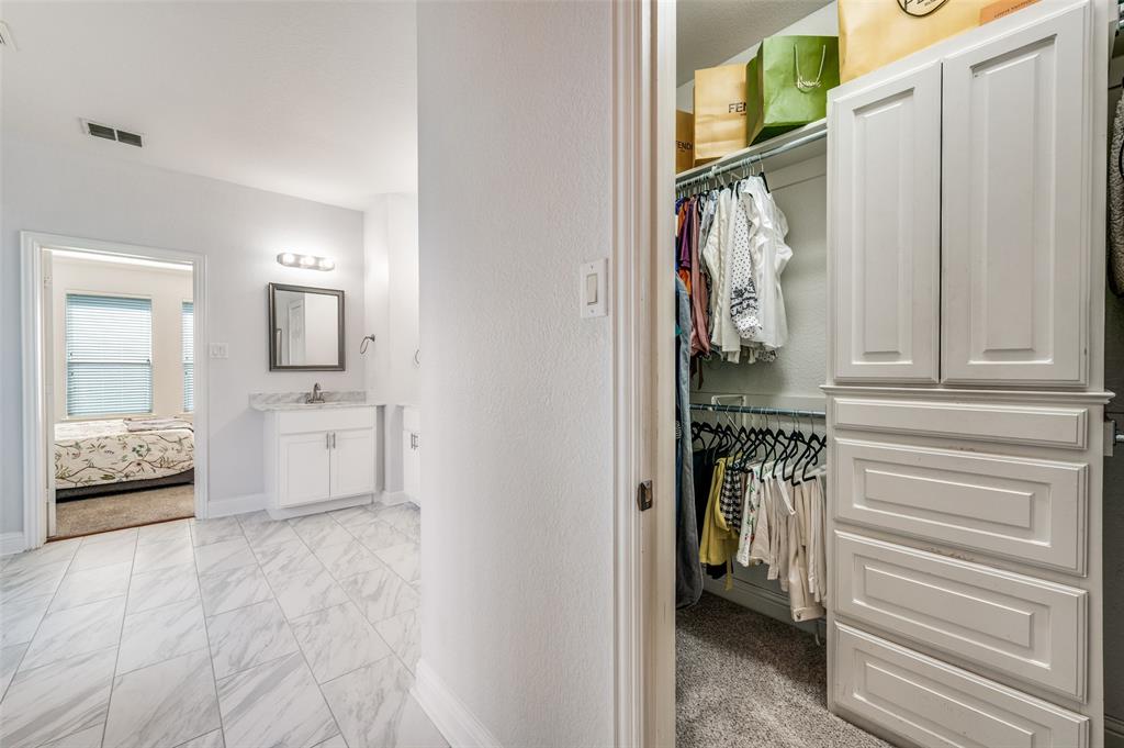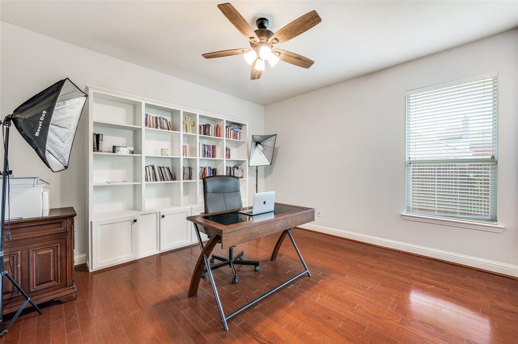 Spacious four-bedroom home in the sought-after Preston Lakes subdivision of Prosper offering a functional layout and recent updates. The primary suite is located downstairs with 2 walk-in closets with built in shelving and cabinets along with a private office with direct access to the primary bedroom, built-in bookshelves, and custom cabinetry. The home includes three large living areas with two downstairs and an upstairs game room, creating multiple options for entertaining and everyday living. Upstairs you will find 3 bedrooms, each with its own closet. Recent improvements include a NEW ROOF installed in 2024, fresh interior paint, and new carpet upstairs. The fenced backyard offers plenty of room to add a pool and design an outdoor living space to fit your needs.