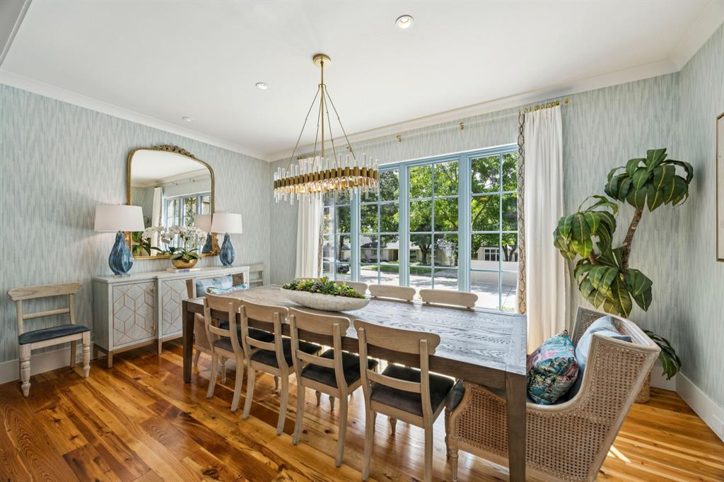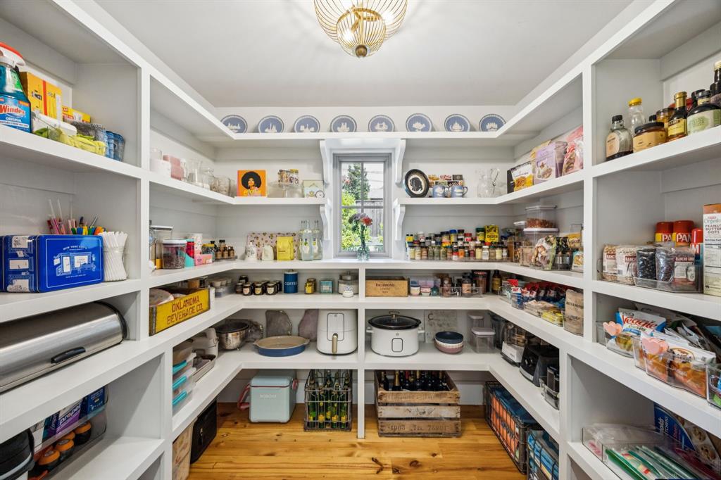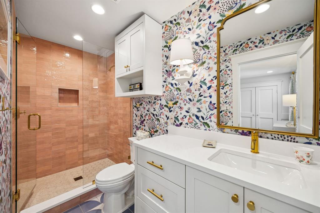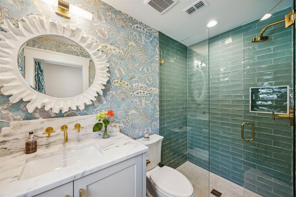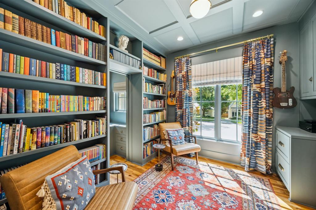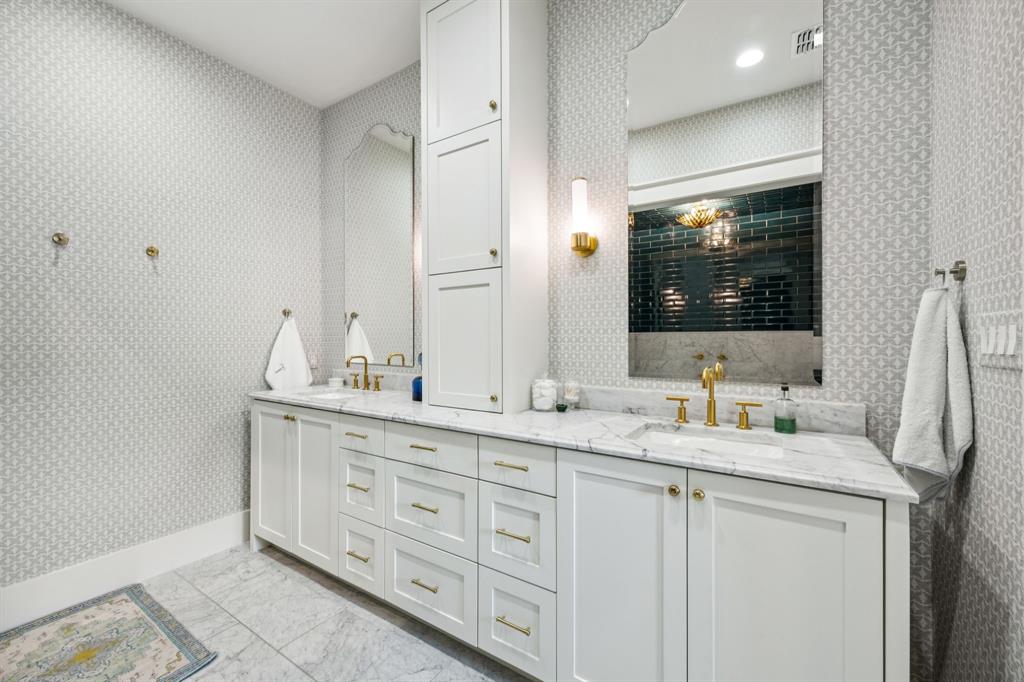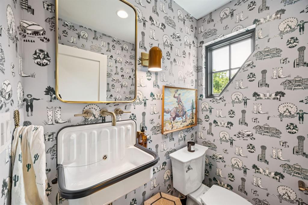 Inside, you'll find reclaimed pine floors that exude warmth and charm, complemented by designer finishes at every turn. The butler’s pantry and library are elevated with exquisite Armac Martin hardware, while Thibaut and York wallpapers add layers of texture and sophistication throughout the home. The playful charm of Katie Kime’s Dallas Toile wallpaper creates a whimsical statement in the spacious playroom.