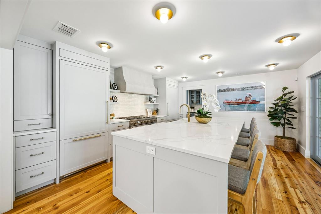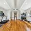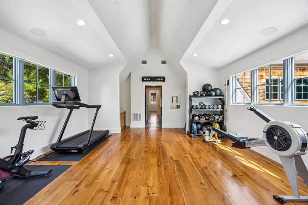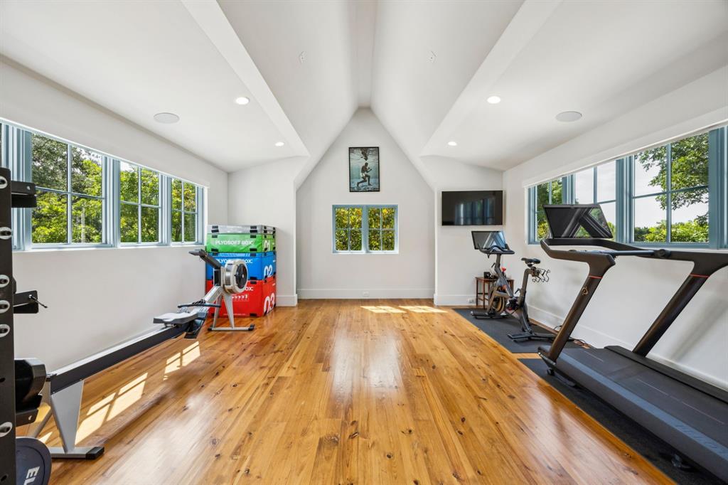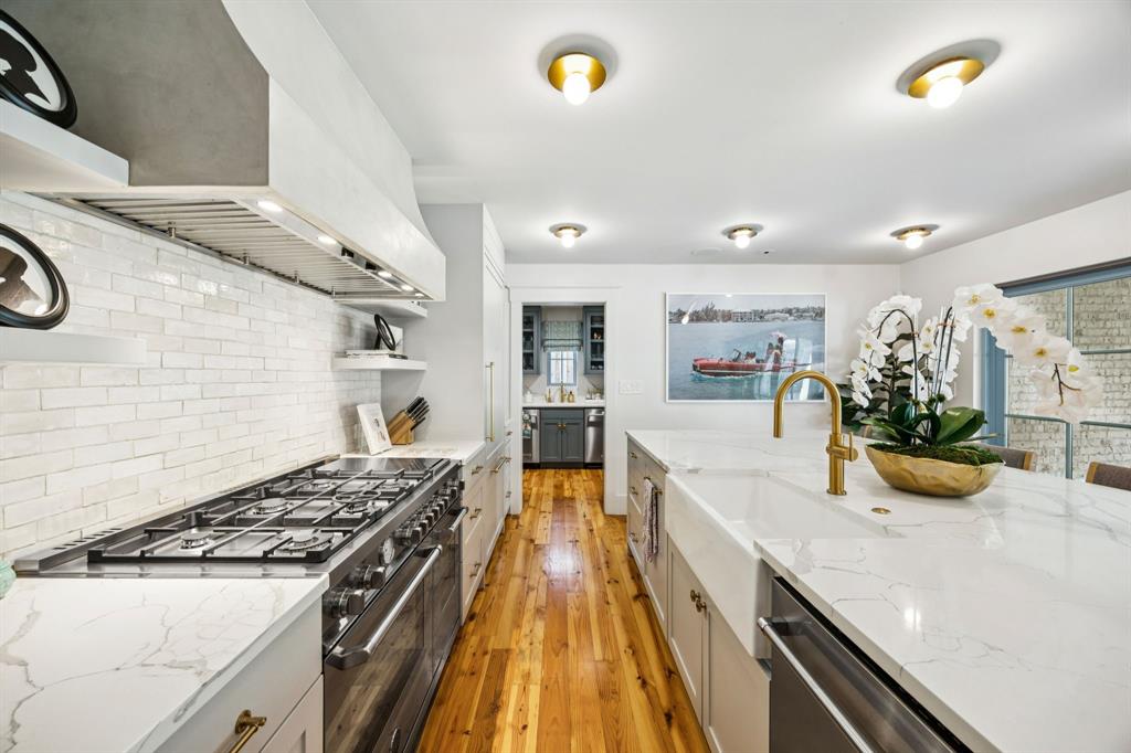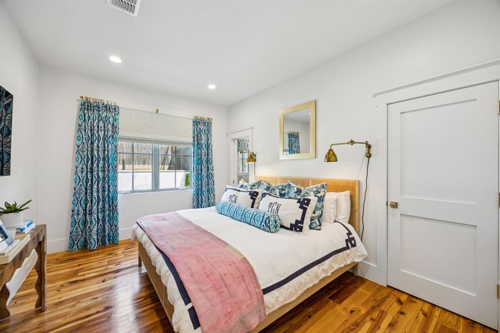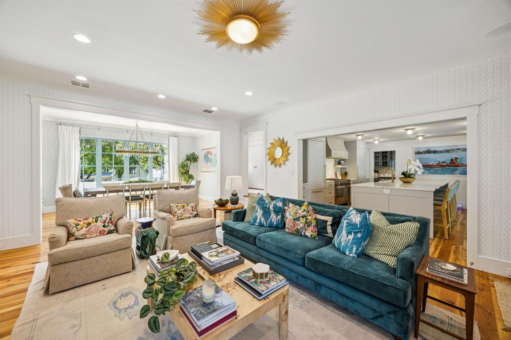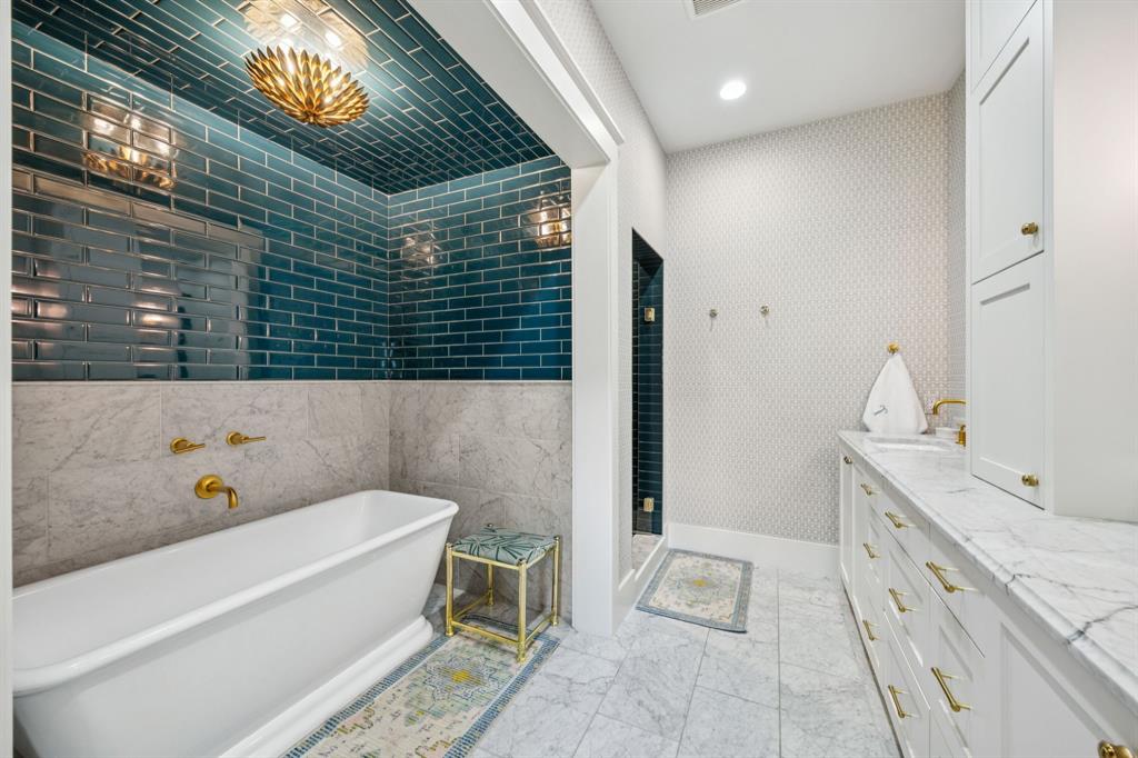 Inside, you'll find reclaimed pine floors that exude warmth and charm, complemented by designer finishes at every turn. The butler’s pantry and library are elevated with exquisite Armac Martin hardware, while Thibaut and York wallpapers add layers of texture and sophistication throughout the home. The playful charm of Katie Kime’s Dallas Toile wallpaper creates a whimsical statement in the spacious playroom.