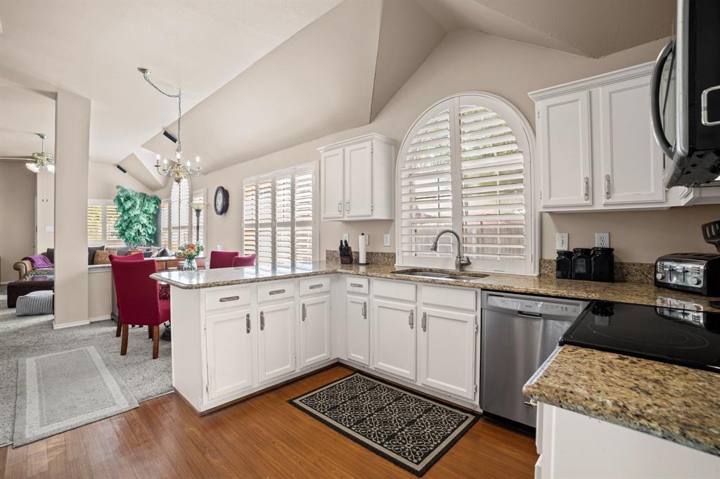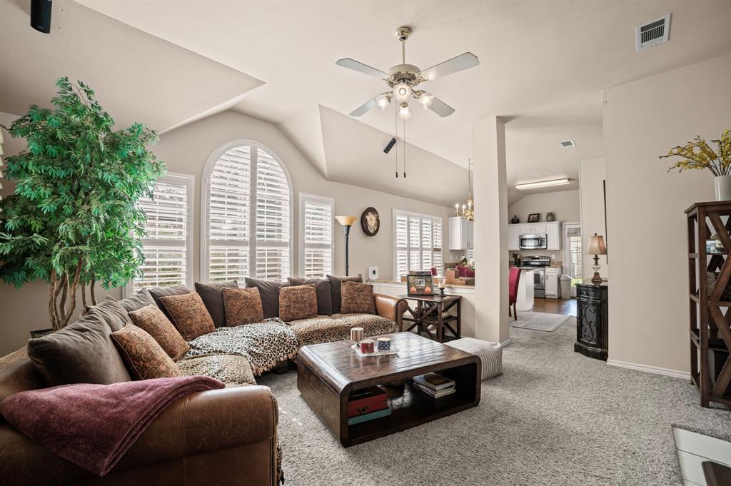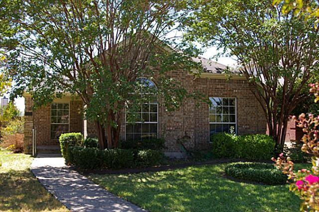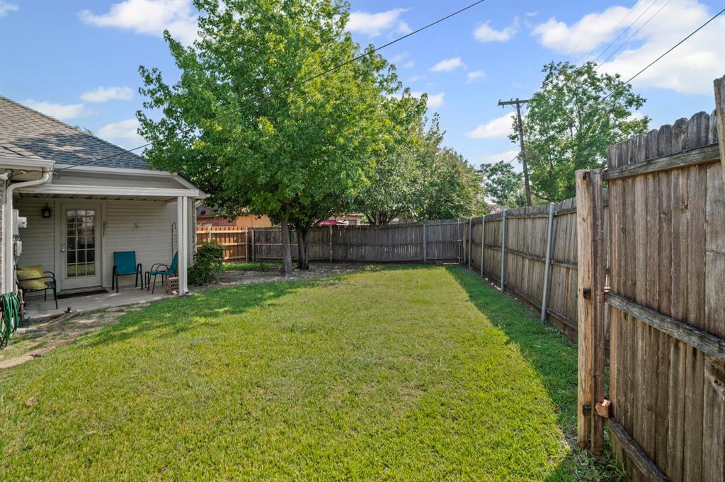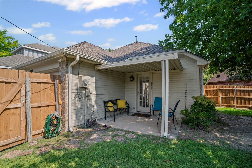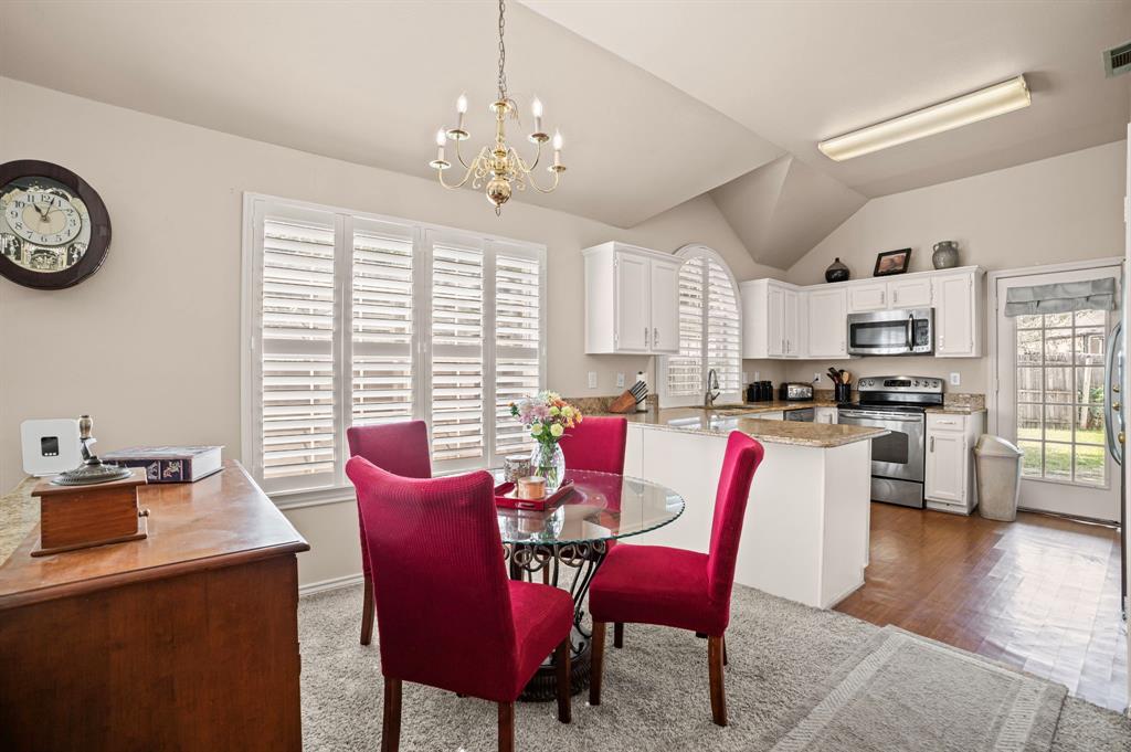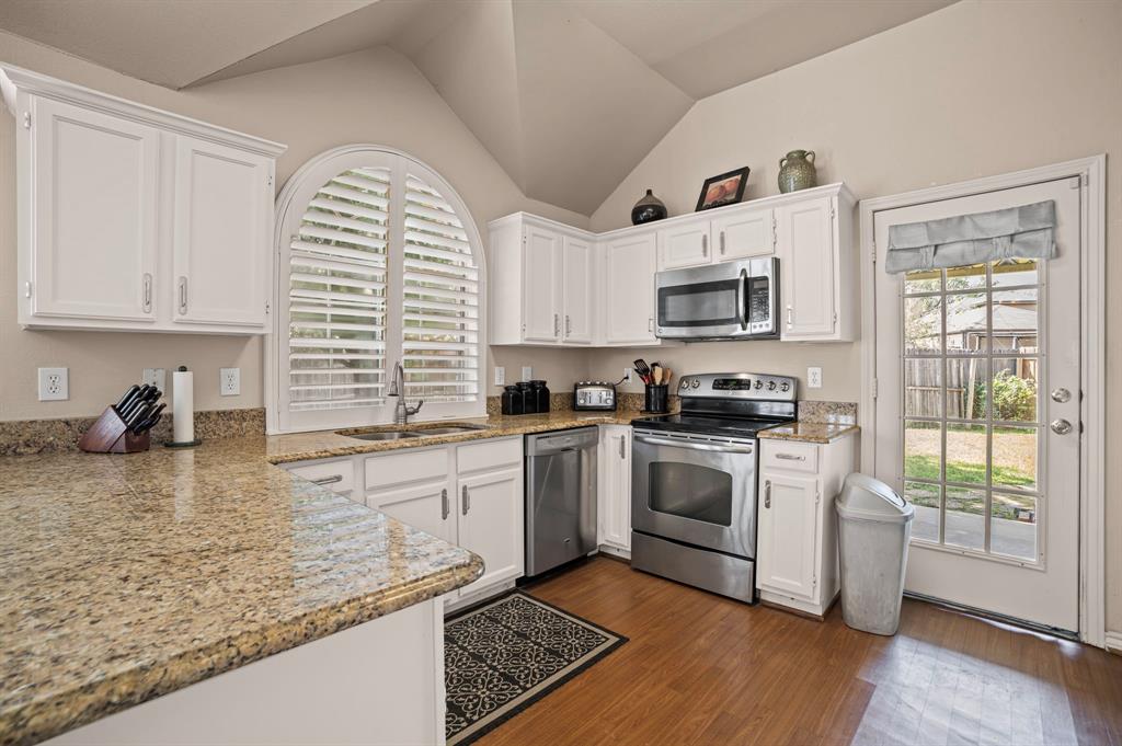 Beautiful One-story brick home on cul-de-sac in quiet Mesquite neighborhood. Home has three bedrooms and two full bathrooms with an attached two car garage with rear alley entry. New stylish and sophisticated planter shutters recently added to every window of the home helps you control the amount of light in each room. Home styled in a neutral color scheme throughout from walls to flooring. Home features a gas log fireplace with fluted wood mantle, gorgeous granite countertops, crown molding and high vaulted ceilings. Kitchen features all stainless-steel appliances, undermount stainless-steel sink with disposal, built in automatic dishwasher, microwave, and electric 5 burner range, spacious pantry, breakfast bar, beautiful white finished cabinets and wood laminate flooring with French door opening to backyard patio.