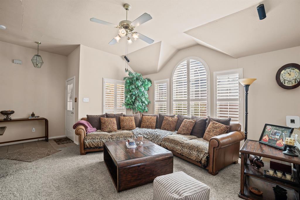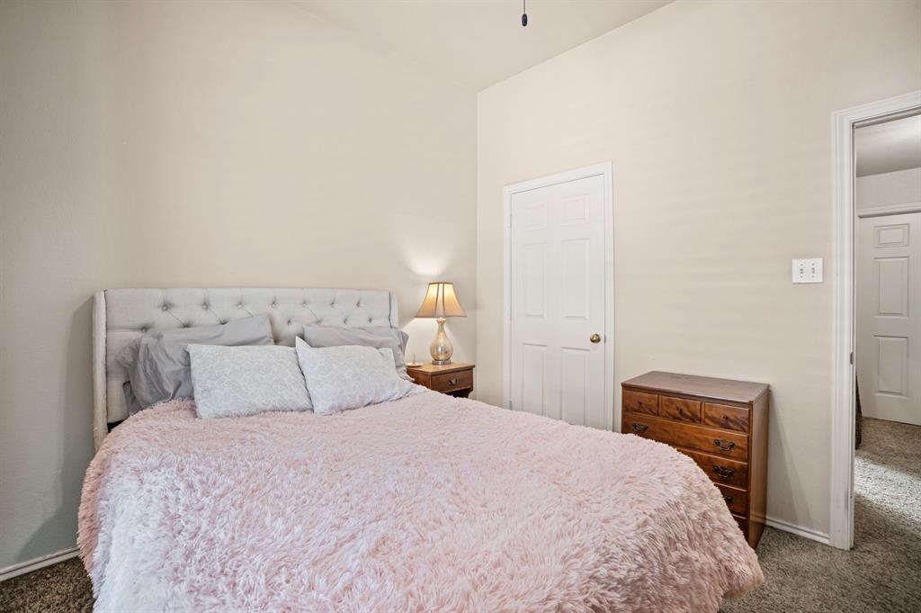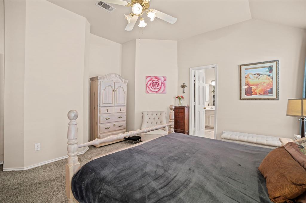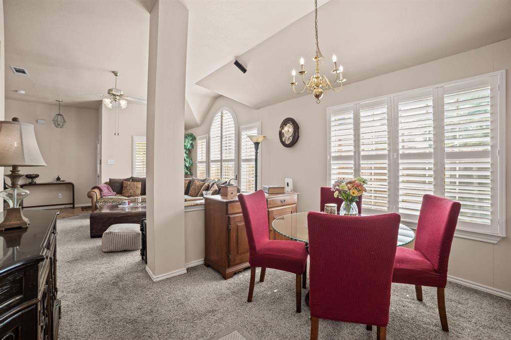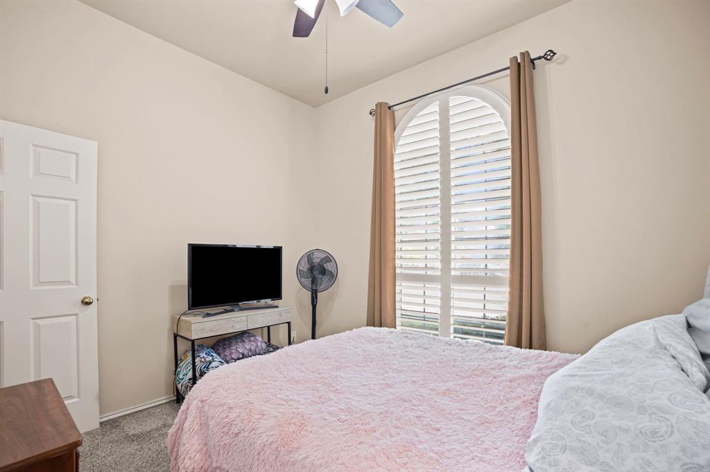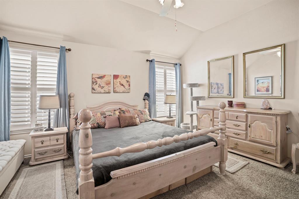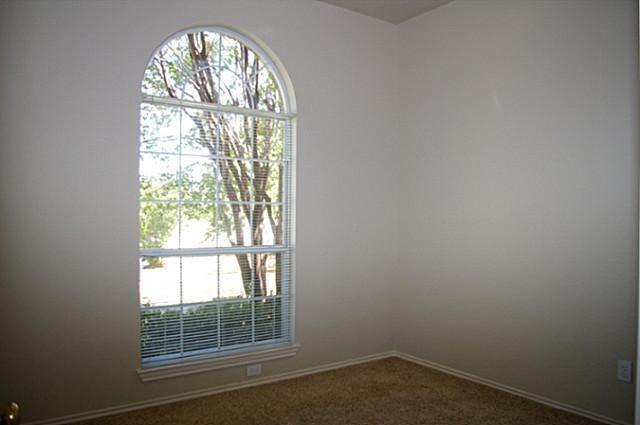 Beautiful One-story brick home on cul-de-sac in quiet Mesquite neighborhood. Home has three bedrooms and two full bathrooms with an attached two car garage with rear alley entry. New stylish and sophisticated planter shutters recently added to every window of the home helps you control the amount of light in each room. Home styled in a neutral color scheme throughout from walls to flooring. Home features a gas log fireplace with fluted wood mantle, gorgeous granite countertops, crown molding and high vaulted ceilings. Kitchen features all stainless-steel appliances, undermount stainless-steel sink with disposal, built in automatic dishwasher, microwave, and electric 5 burner range, spacious pantry, breakfast bar, beautiful white finished cabinets and wood laminate flooring with French door opening to backyard patio.