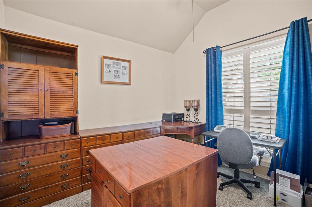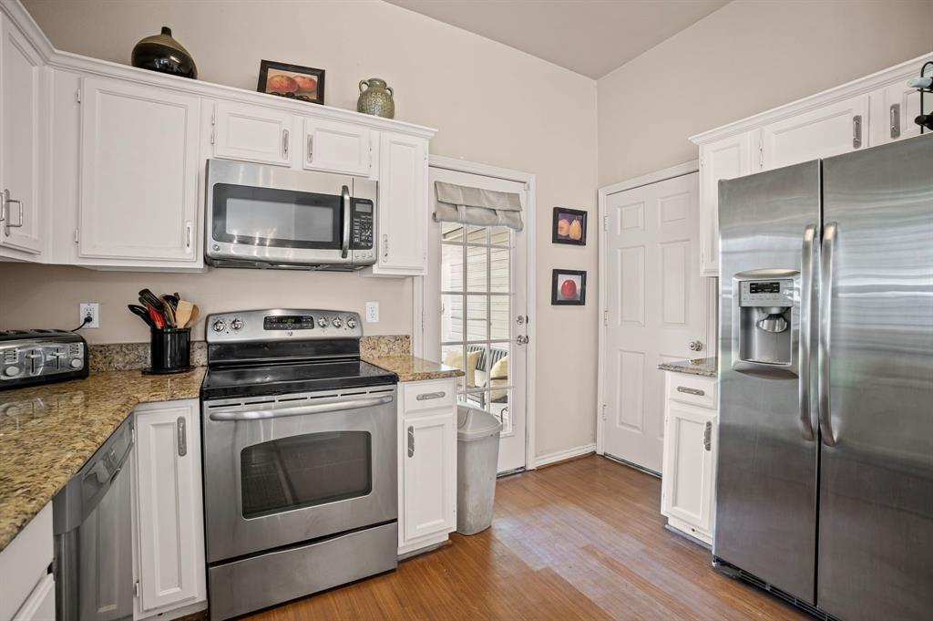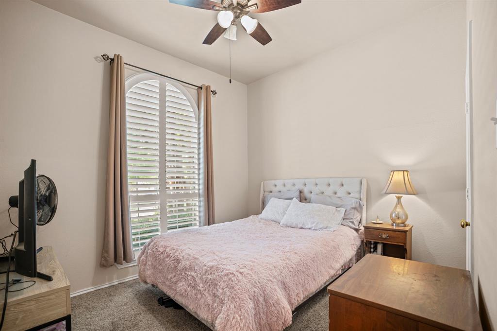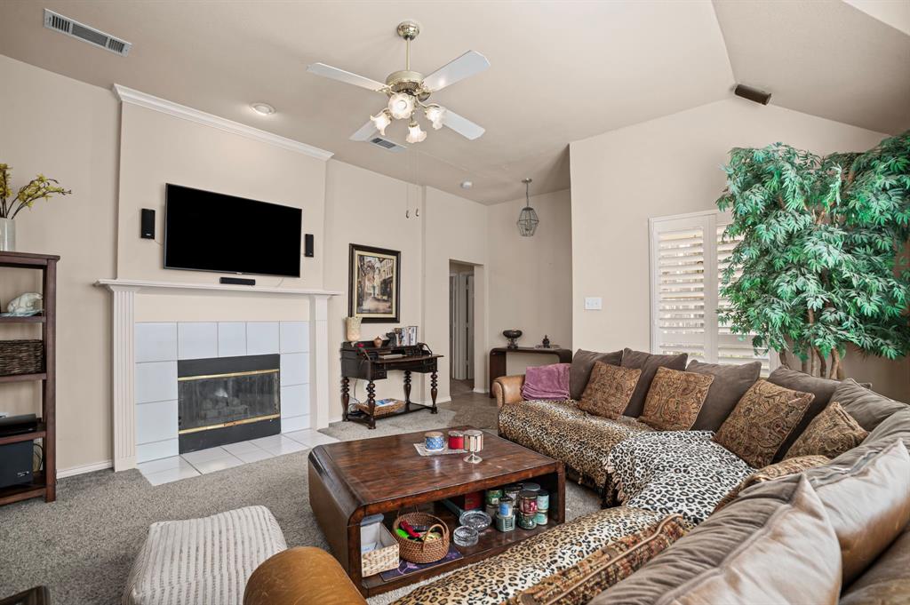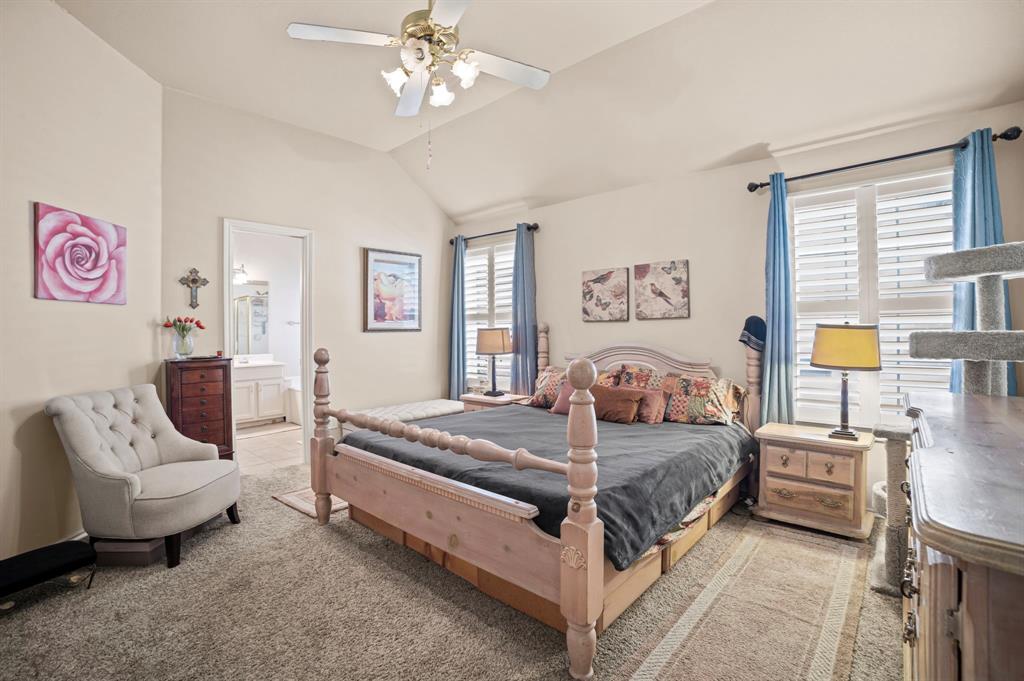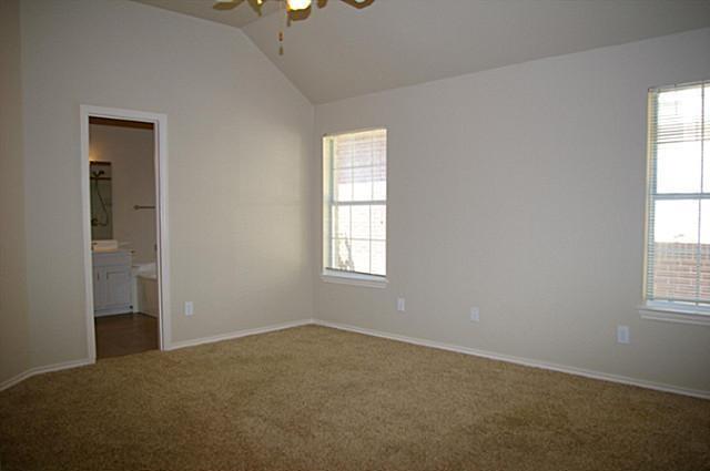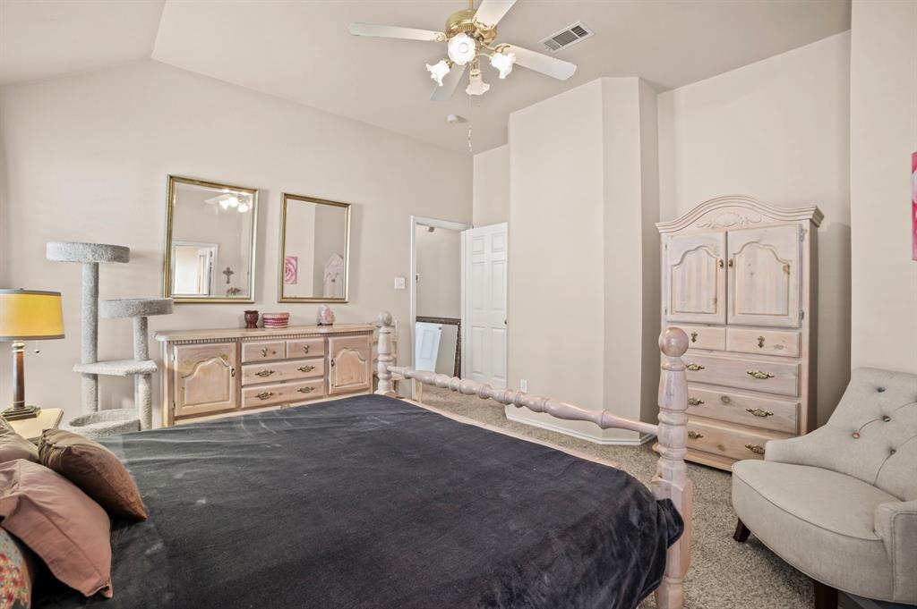 Beautiful One-story brick home on cul-de-sac in quiet Mesquite neighborhood. Home has three bedrooms and two full bathrooms with an attached two car garage with rear alley entry. New stylish and sophisticated planter shutters recently added to every window of the home helps you control the amount of light in each room. Home styled in a neutral color scheme throughout from walls to flooring. Home features a gas log fireplace with fluted wood mantle, gorgeous granite countertops, crown molding and high vaulted ceilings. Kitchen features all stainless-steel appliances, undermount stainless-steel sink with disposal, built in automatic dishwasher, microwave, and electric 5 burner range, spacious pantry, breakfast bar, beautiful white finished cabinets and wood laminate flooring with French door opening to backyard patio.