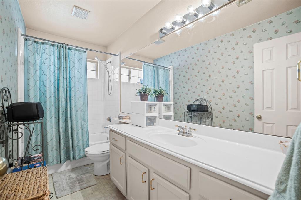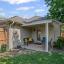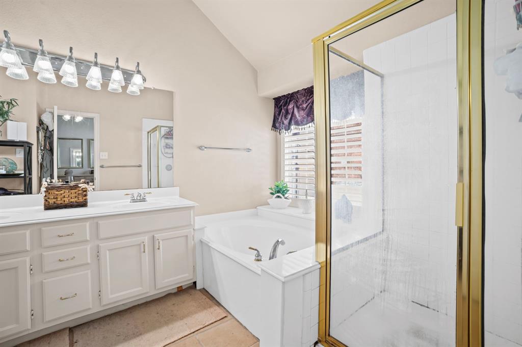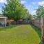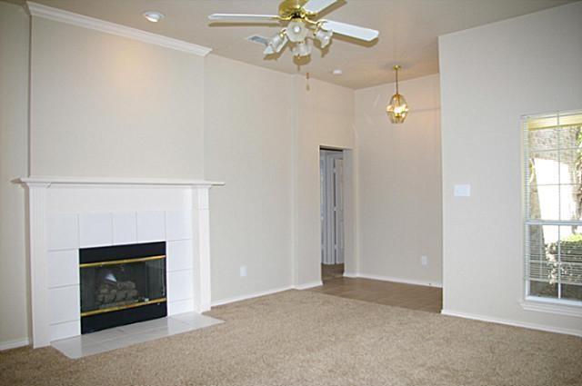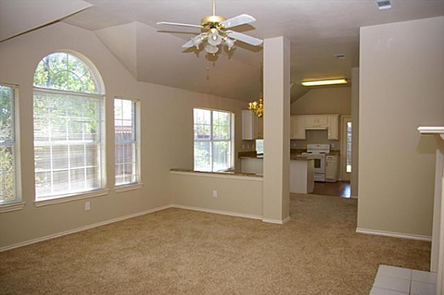 Flooring includes tile entryway and tile in primary bath with carpet in living areas and bedrooms. Large primary bedroom features crown molding and high ceilings and opens onto spacious primary bath with his and her vanities, garden tub, large separate shower, and walk-in-closet. Two roomy auxiliary bedrooms, one of which could double perfectly as a home office, are complete with spacious closets, high ceilings and newly updated ceiling fans with lighting. Spacious laundry room with storage shelves is off main living area allowing for electric dryer and washer hook up. New six-foot wooden privacy fence surrounds large back yard with two mature trees for shade with back patio and front porch.