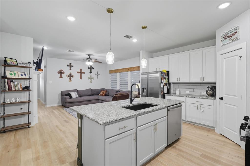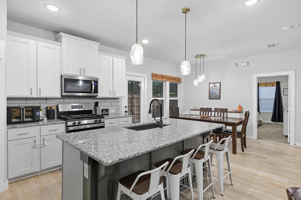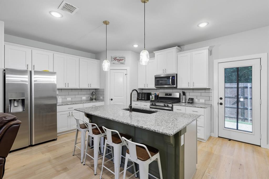 The kitchen is a true highlight, featuring stainless steel appliances, granite countertops, a walk-in pantry, a gas stove, a large farmhouse sink, and generous storage space. Each of the three full bathrooms is well-appointed with dedicated storage. Step outside to a private, fenced backyard that is perfect for weekend barbecues or quiet mornings. Also enjoy the added bonus of being directly next to neighborhood green space.