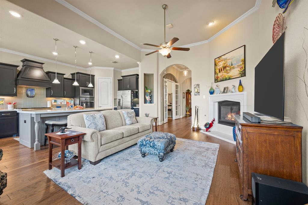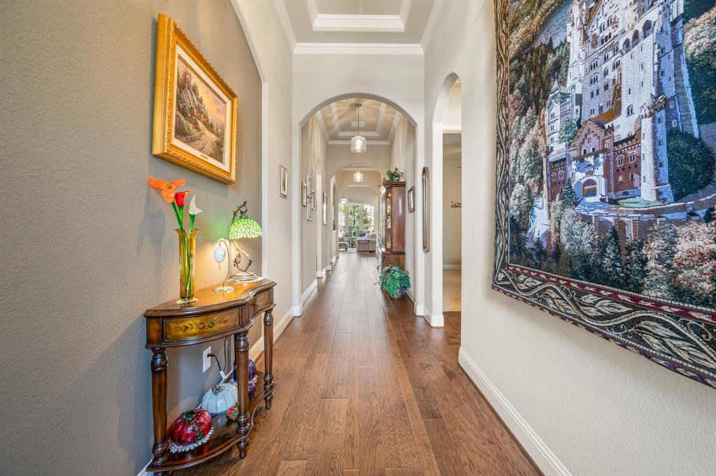 Step inside to find 12-foot ceilings, vaulted details, crown molding, and abundant natural light that create a spacious and inviting atmosphere. The home showcases engineered wood flooring throughout the main living areas, tile in the bathrooms, and plush carpet in the bedrooms for comfort.