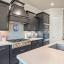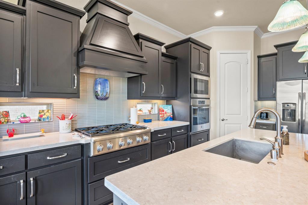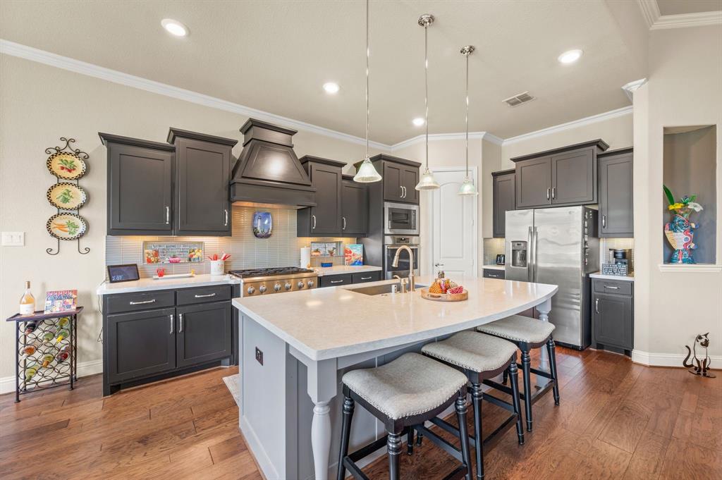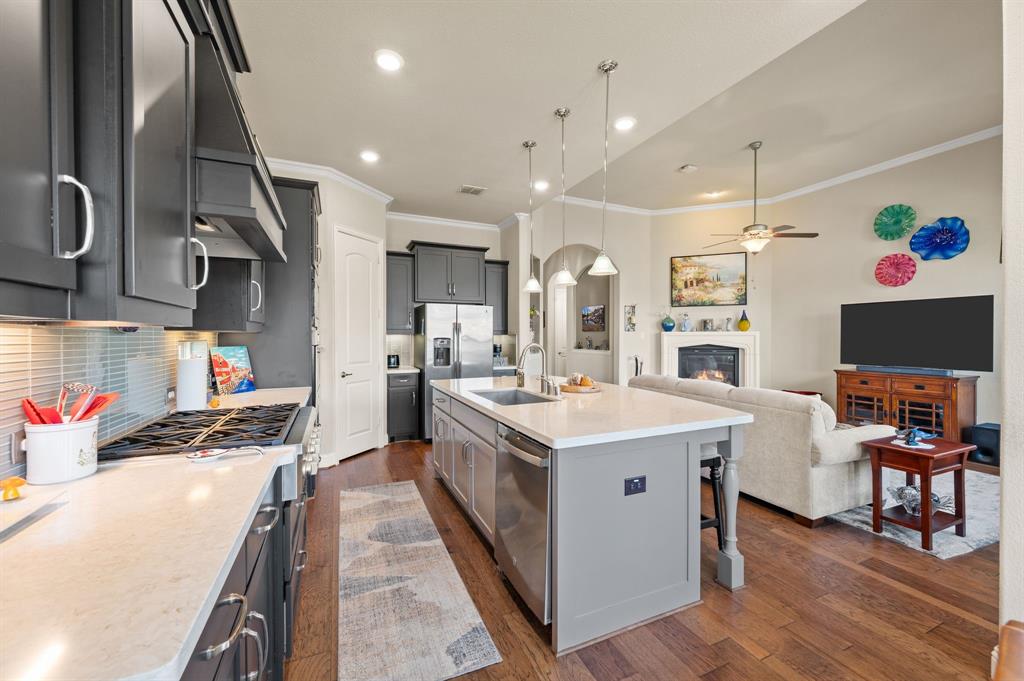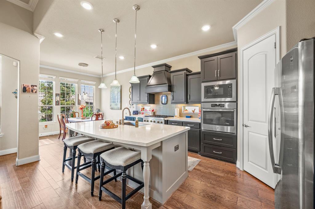 The kitchen is designed for both everyday living and entertaining with rich dark cabinetry, quartz countertops, a large island, stainless steel appliances, gas cooktop, and a cozy breakfast nook overlooking the north facing backyard.