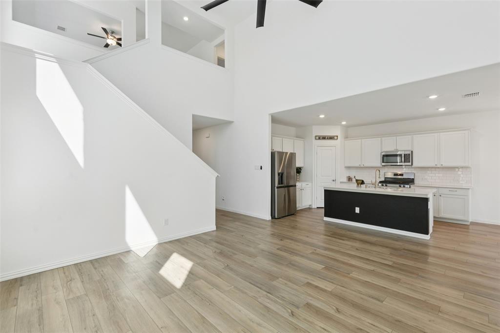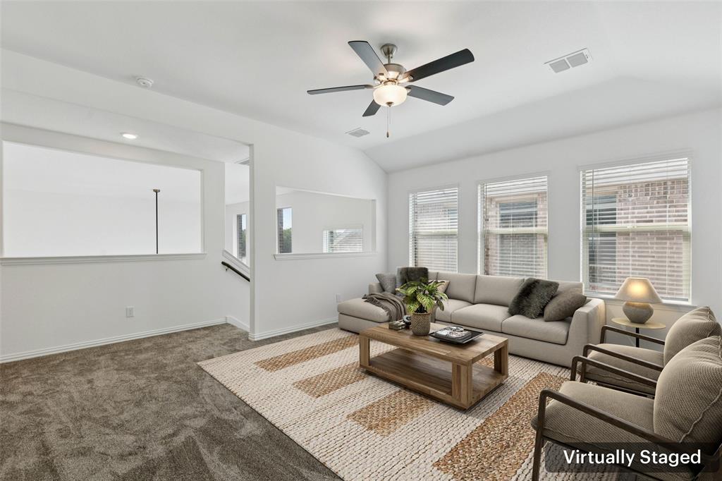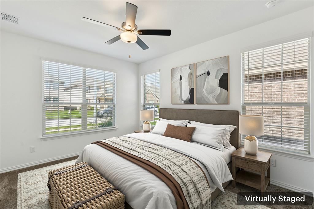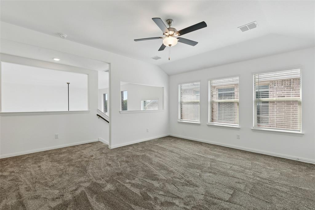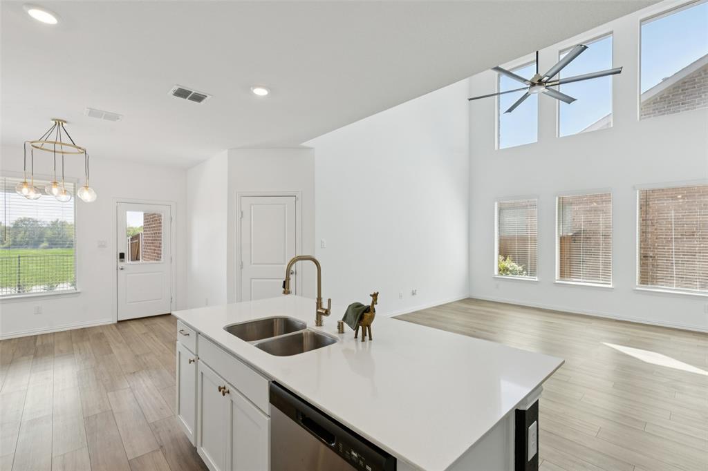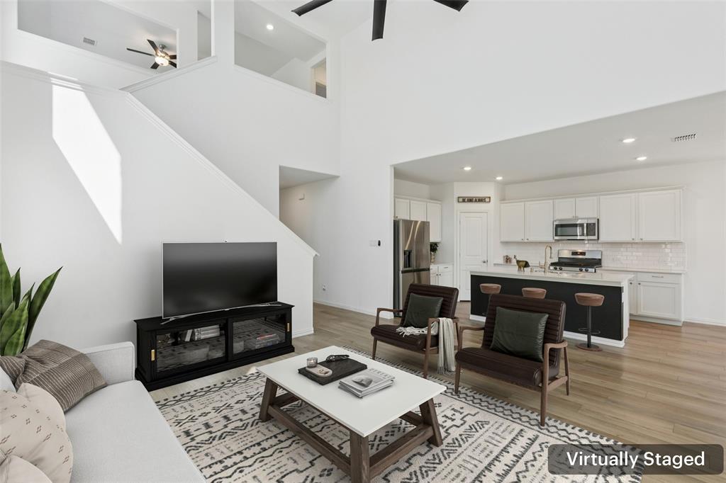 Better than new, this stunning 4-bedroom, 3-bath Justin home is filled with upgrades, ceiling fans, and thoughtful details throughout. From the moment you arrive, you are welcomed by soaring ceilings and modern elegance that set the tone for the entire home. At the heart of the open floor plan, the inviting living room features a wall of windows that fill the space with natural light and seamlessly connect to the enviable kitchen. The kitchen is a true showpiece, offering a large island with seating, built-in stainless steel appliances, and abundant cabinet and storage space—perfect for everyday living and entertaining. The serene downstairs primary suite provides a peaceful retreat with its spa-like ensuite bath, complete with dual sinks, a walk-in shower, and a spacious walk-in closet. A guest room and full bath are also conveniently located on the first floor, ideal for visitors or multi-generational living. Upstairs, you’ll find two generously sized secondary bedrooms joined by a Jack and Jill bath, along with a large family room that offers endless possibilities for a game room, media space, or second living area. Enjoy backyard views from the covered patio, perfect for relaxing or hosting gatherings. Situated on a desirable lot, this home truly combines comfort, style, and function—ready for you to move in and make your own. Great community amenities include a Lazy River, pool, parks, and trails. Just minutes from Elementary school. New paint, carpet, and refrigerator included. 3D tour available online.