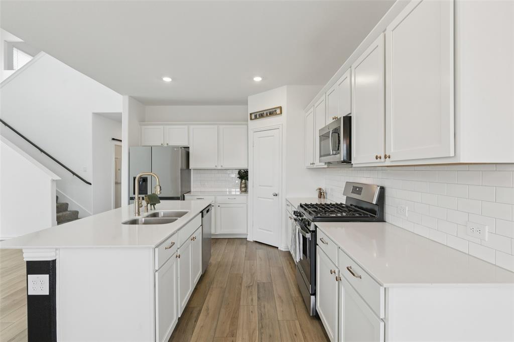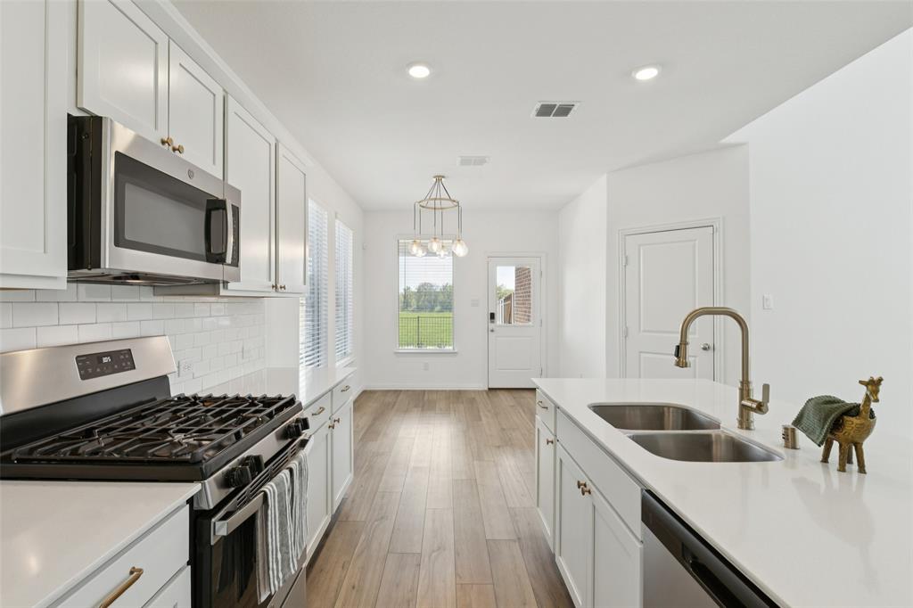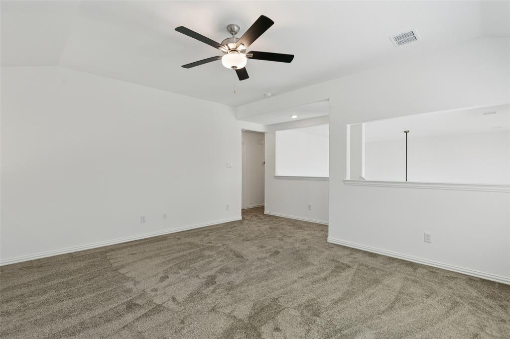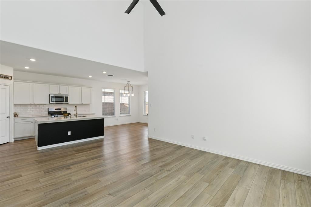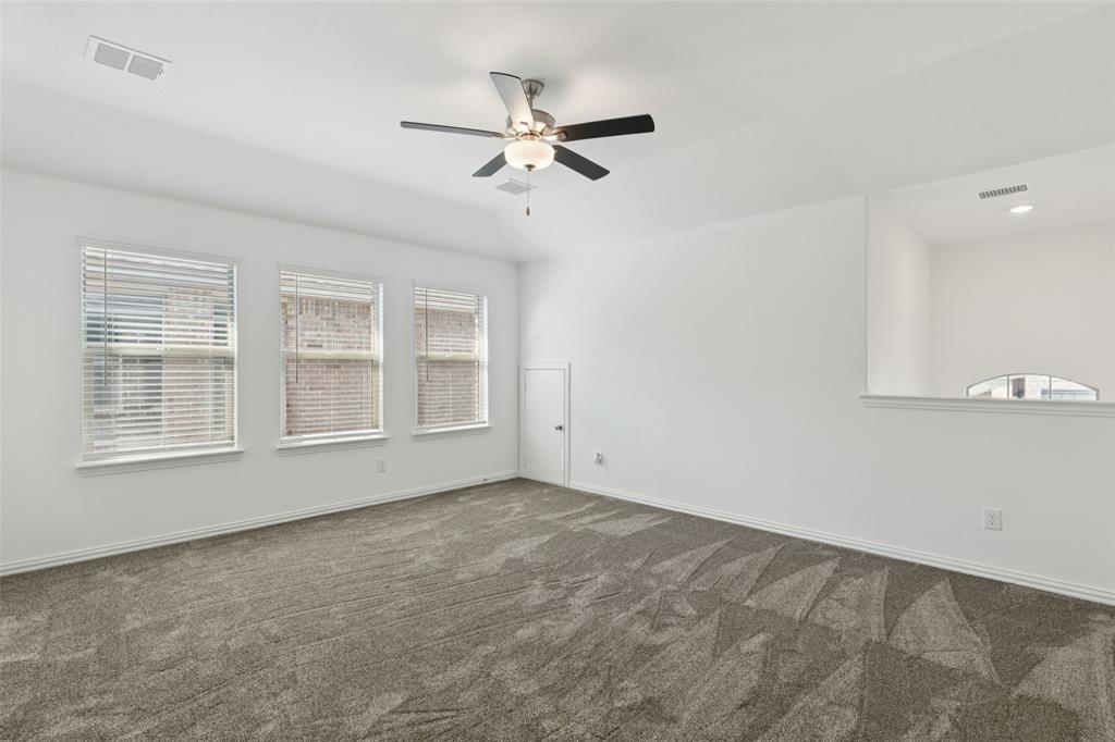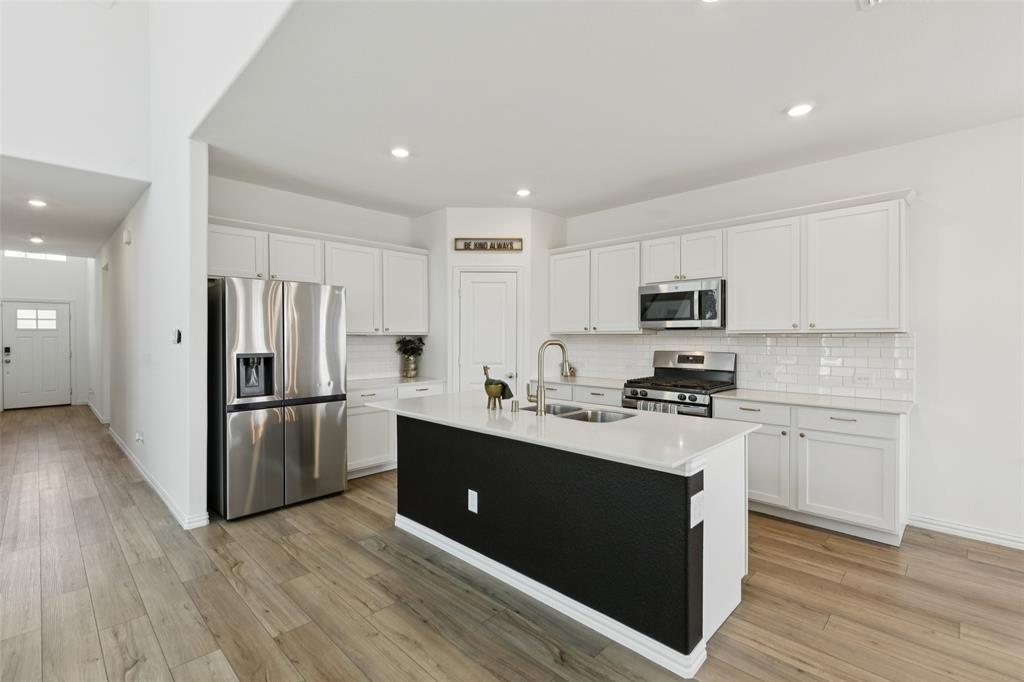 Better than new, this stunning 4-bedroom, 3-bath Justin home is filled with upgrades, ceiling fans, and thoughtful details throughout. From the moment you arrive, you are welcomed by soaring ceilings and modern elegance that set the tone for the entire home. At the heart of the open floor plan, the inviting living room features a wall of windows that fill the space with natural light and seamlessly connect to the enviable kitchen. The kitchen is a true showpiece, offering a large island with seating, built-in stainless steel appliances, and abundant cabinet and storage space—perfect for everyday living and entertaining. The serene downstairs primary suite provides a peaceful retreat with its spa-like ensuite bath, complete with dual sinks, a walk-in shower, and a spacious walk-in closet. A guest room and full bath are also conveniently located on the first floor, ideal for visitors or multi-generational living. Upstairs, you’ll find two generously sized secondary bedrooms joined by a Jack and Jill bath, along with a large family room that offers endless possibilities for a game room, media space, or second living area. Enjoy backyard views from the covered patio, perfect for relaxing or hosting gatherings. Situated on a desirable lot, this home truly combines comfort, style, and function—ready for you to move in and make your own. Great community amenities include a Lazy River, pool, parks, and trails. Just minutes from Elementary school. New paint, carpet, and refrigerator included. 3D tour available online.