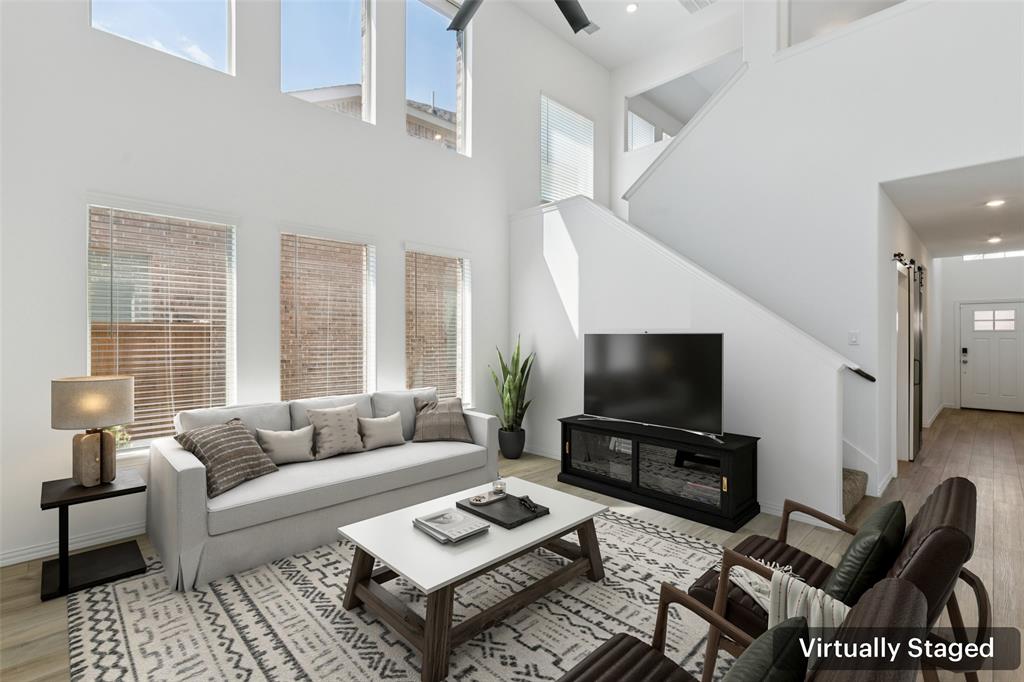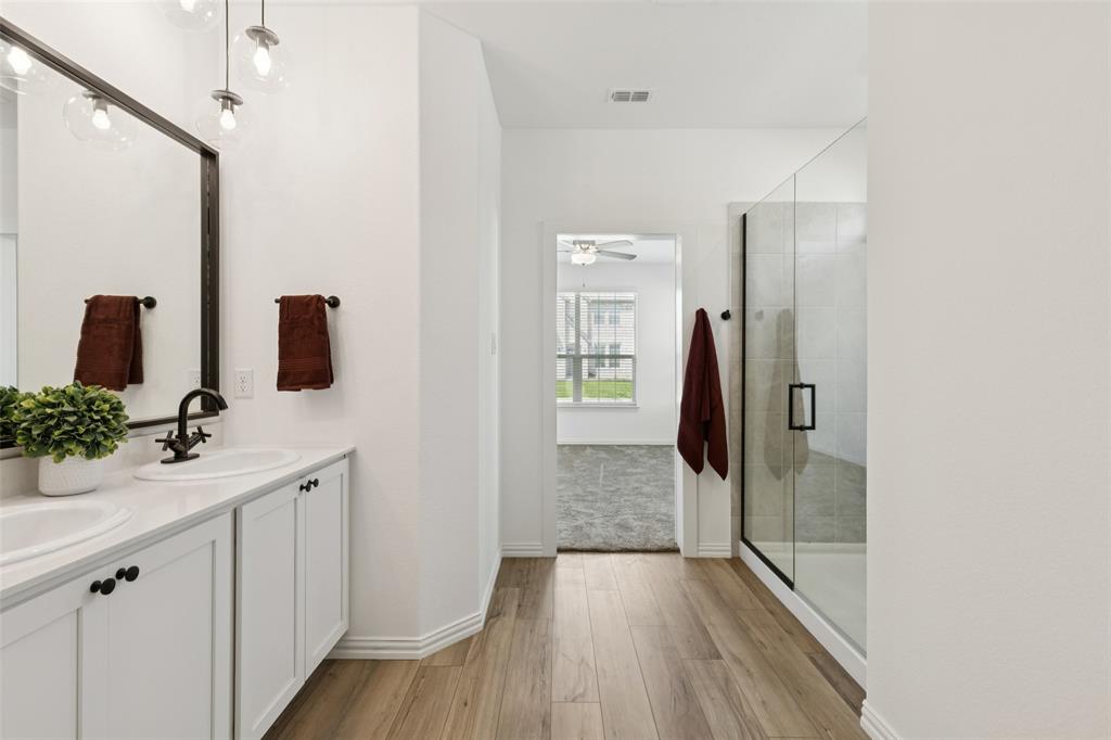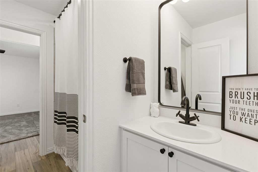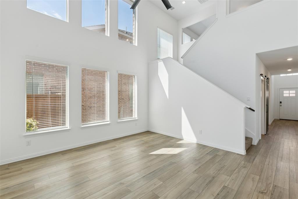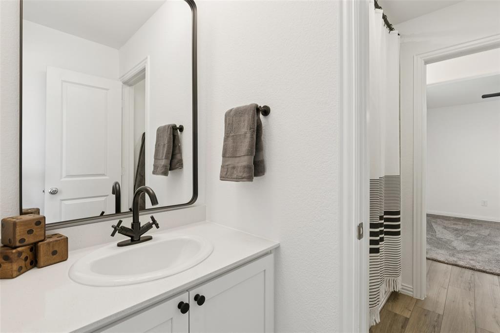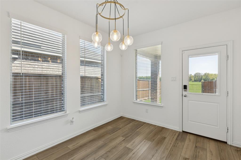 Better than new, this stunning 4-bedroom, 3-bath Justin home is filled with upgrades, ceiling fans, and thoughtful details throughout. From the moment you arrive, you are welcomed by soaring ceilings and modern elegance that set the tone for the entire home. At the heart of the open floor plan, the inviting living room features a wall of windows that fill the space with natural light and seamlessly connect to the enviable kitchen. The kitchen is a true showpiece, offering a large island with seating, built-in stainless steel appliances, and abundant cabinet and storage space—perfect for everyday living and entertaining. The serene downstairs primary suite provides a peaceful retreat with its spa-like ensuite bath, complete with dual sinks, a walk-in shower, and a spacious walk-in closet. A guest room and full bath are also conveniently located on the first floor, ideal for visitors or multi-generational living. Upstairs, you’ll find two generously sized secondary bedrooms joined by a Jack and Jill bath, along with a large family room that offers endless possibilities for a game room, media space, or second living area. Enjoy backyard views from the covered patio, perfect for relaxing or hosting gatherings. Situated on a desirable lot, this home truly combines comfort, style, and function—ready for you to move in and make your own. Great community amenities include a Lazy River, pool, parks, and trails. Just minutes from Elementary school. New paint, carpet, and refrigerator included. 3D tour available online.