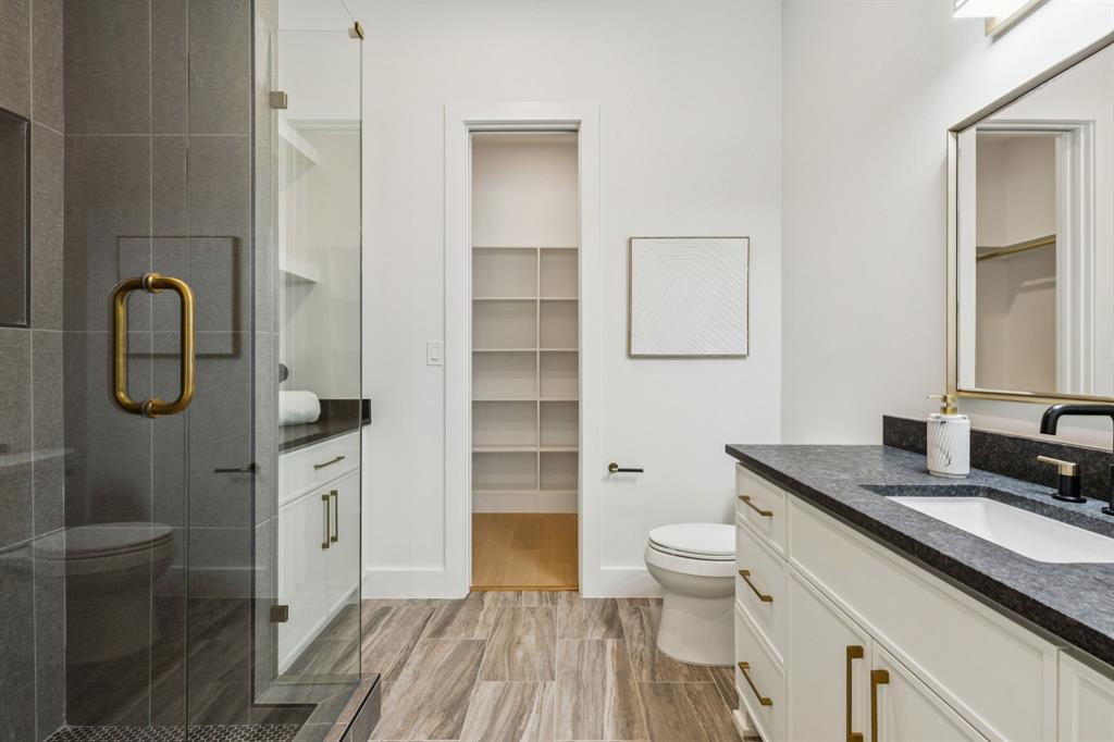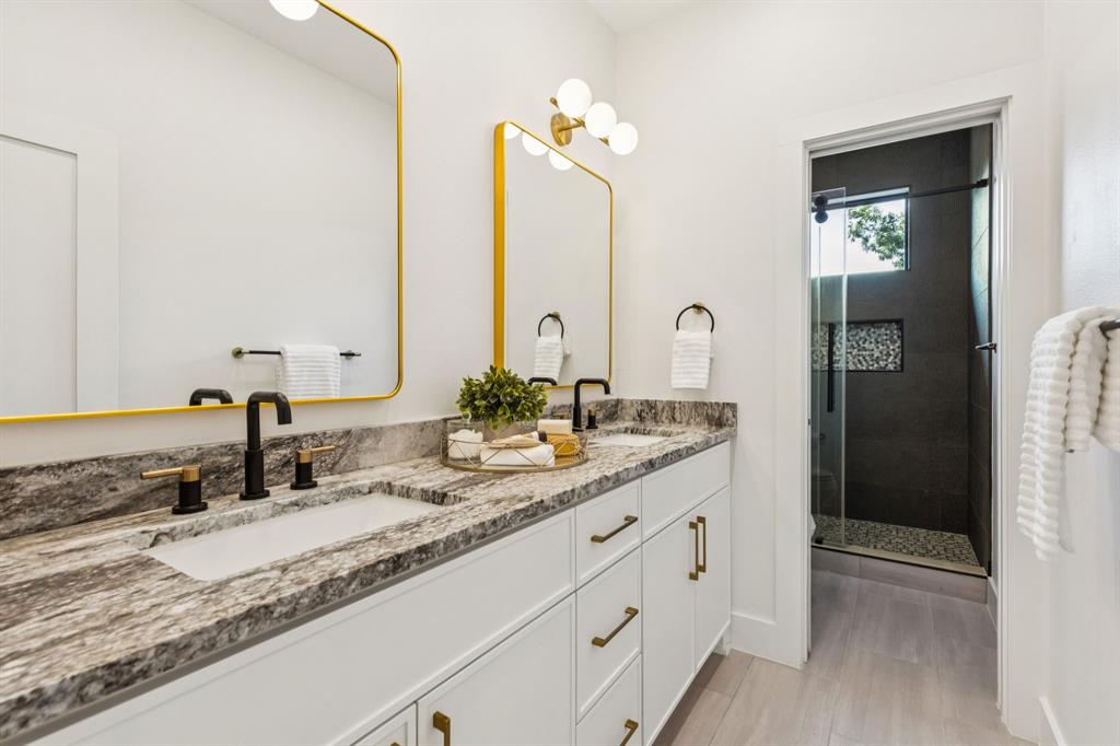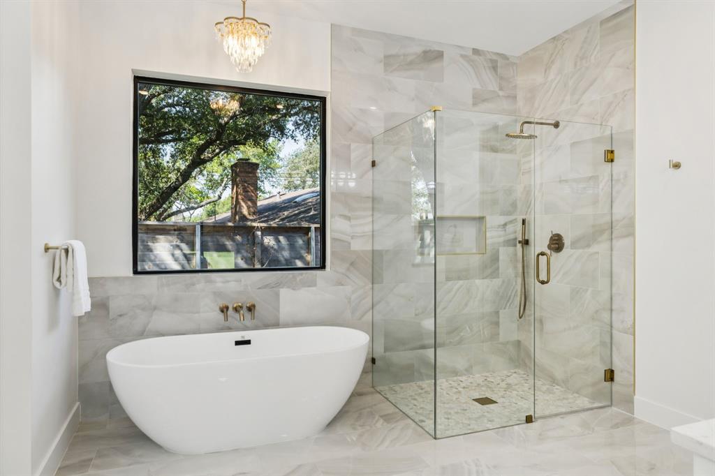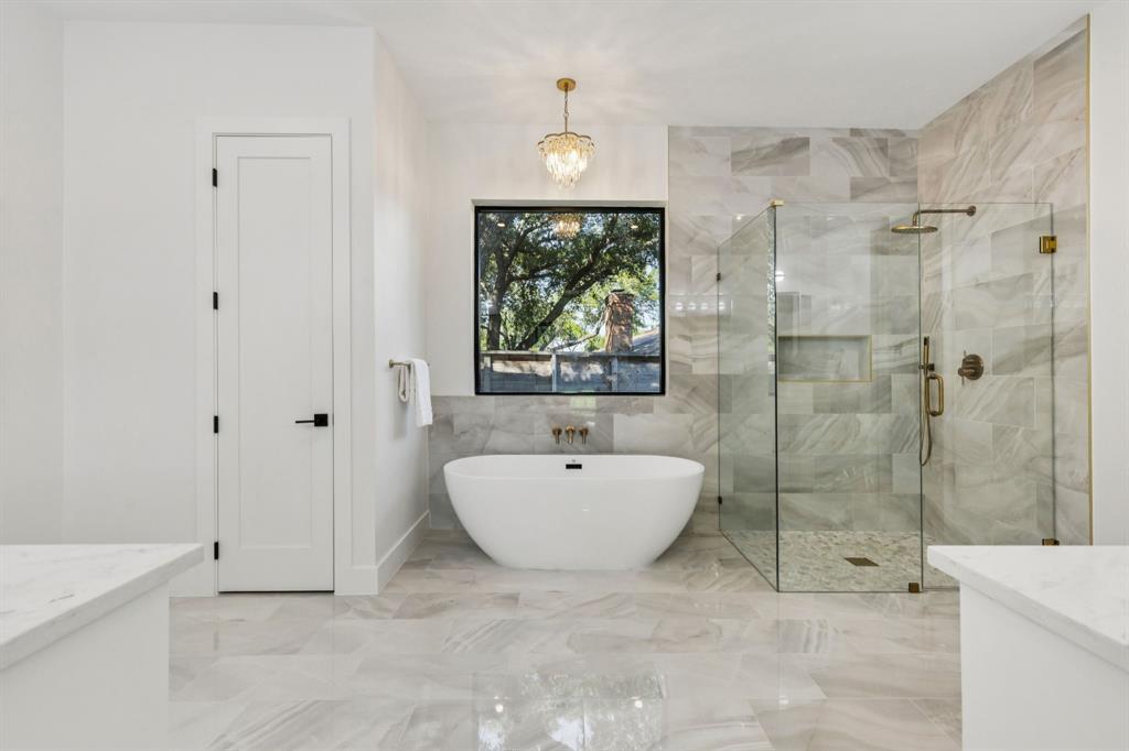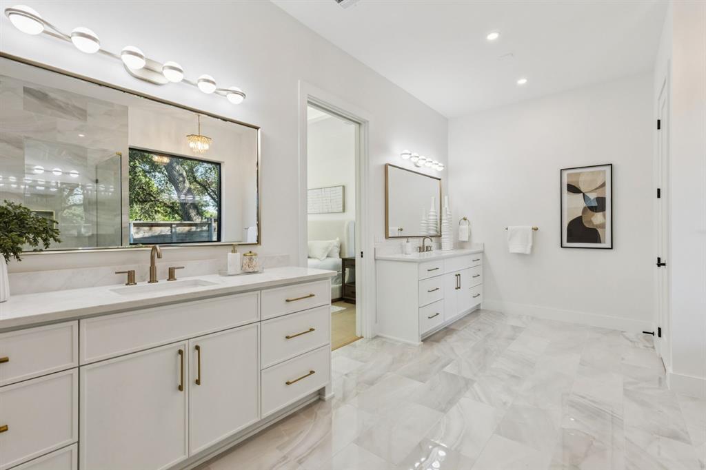 With five bedrooms total, the home offers versatile living arrangements. The primary suite is a true retreat, thoughtfully set apart at the back of the home for added privacy. Its location, accessed through the kitchen and mudroom, naturally separates family life from entertaining spaces, creating a sense of seclusion. The suite offers a generous walk-in closet and direct access to the patio. Its spa-inspired bath includes dual vanities, a soaking tub, and a spacious walk-in shower, all designed for relaxation. Downstairs you’ll also find a second bedroom and bath that serve as a secluded in-law suite for guests, multi-generational living, or anyone who values privacy.