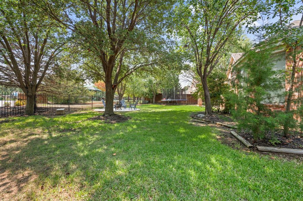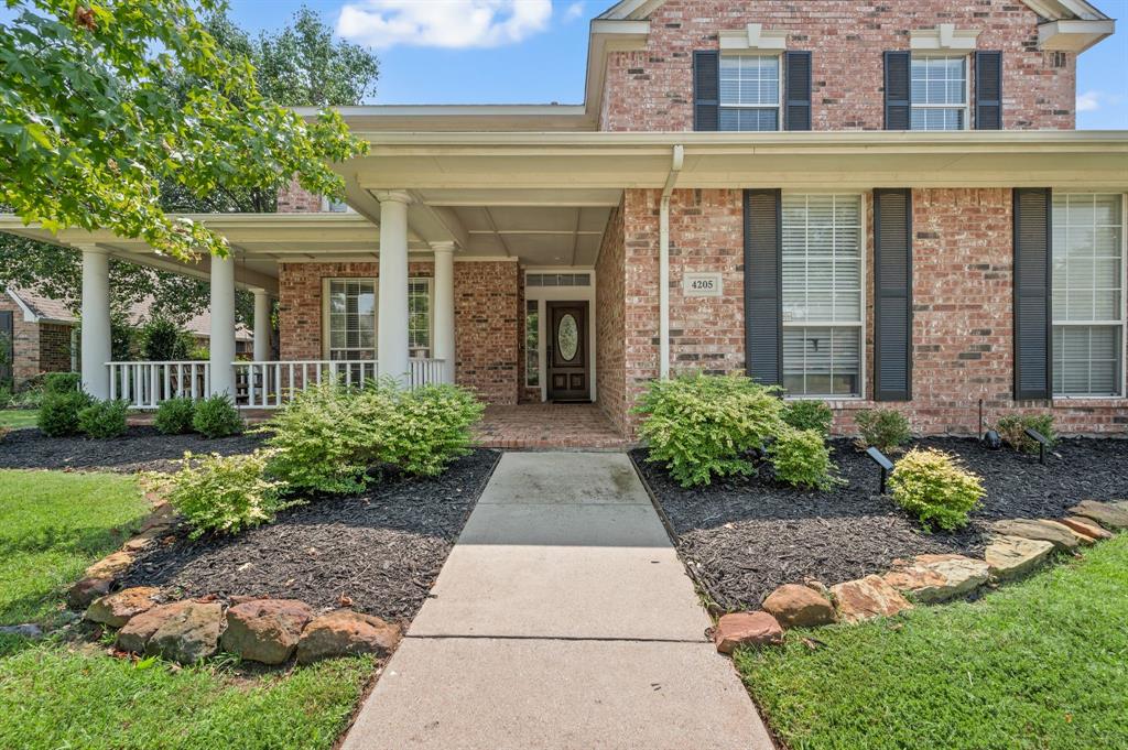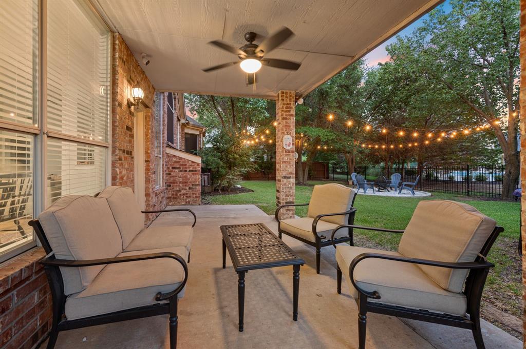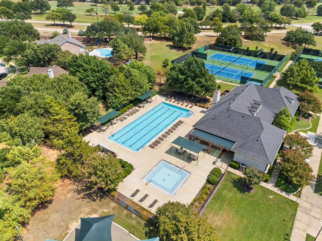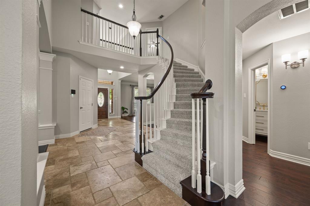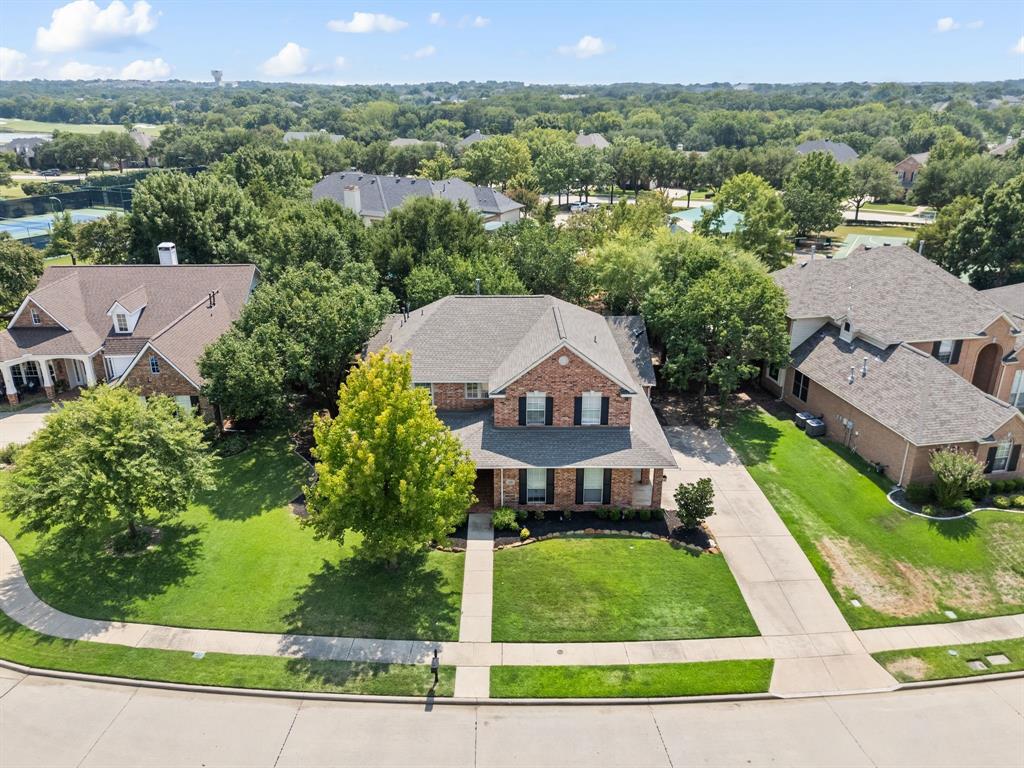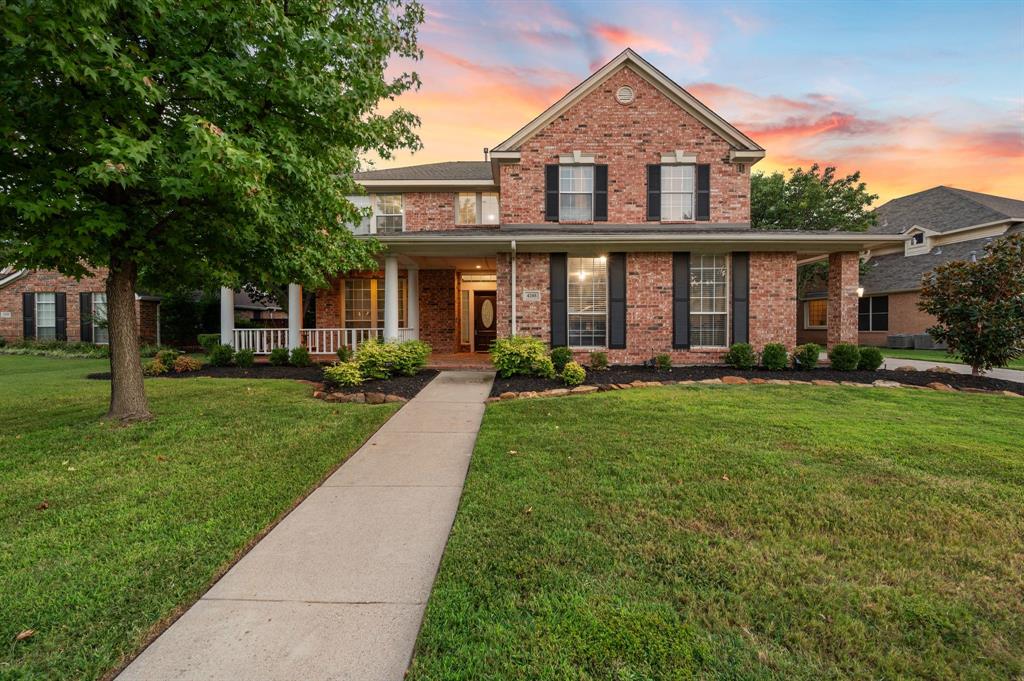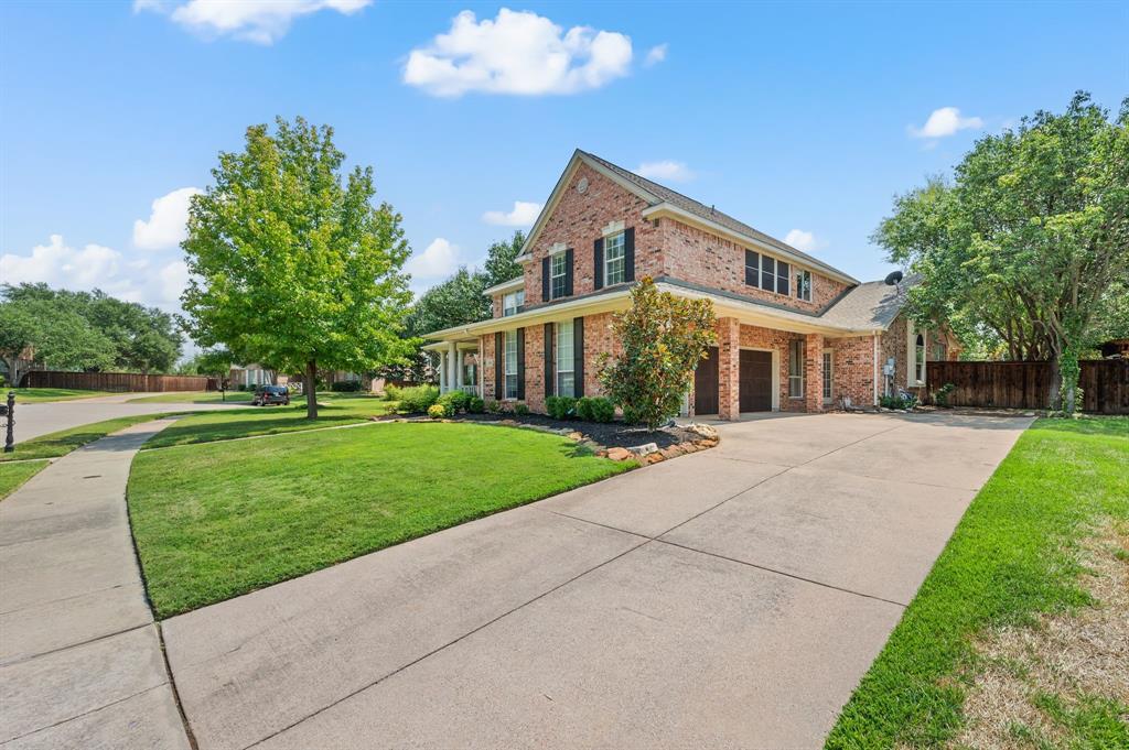 Stunning 2-story home nestled in the highly sought-after Bridlewood Golf Community within the top-rated Lewisville ISD. This beautiful home offers 4 spacious bedrooms all with walk-in closets, 3.5 bathrooms, a 3-car garage with updated doors, and a designated office, great for those who work from home or need a quiet place to study. Step inside to find soaring ceilings, rich wood floors, and elegant decorative lighting. The chef’s kitchen boasts a generous granite island, stainless steel appliances, white cabinetry, and a stylish backsplash, perfect for both everyday living and entertaining. The primary suite is a true retreat, featuring a serene bay window, vaulted tray ceilings, and a spa-inspired ensuite with a jetted soaking tub, separate walk-in shower, and an updated vanity with dual sinks. Enjoy the outdoors on the charming wrap around front porch or relax on the back patio overlooking mature landscaping and peaceful greenspace. With a private gate leading directly to Bridlewood’s community amenities, including a pool, playground, tennis courts, and basketball courts, you’ll love the convenience and lifestyle this home provides. Additional updates include HVAC, fence and sprinkler system, ensuring peace of mind for years to come.