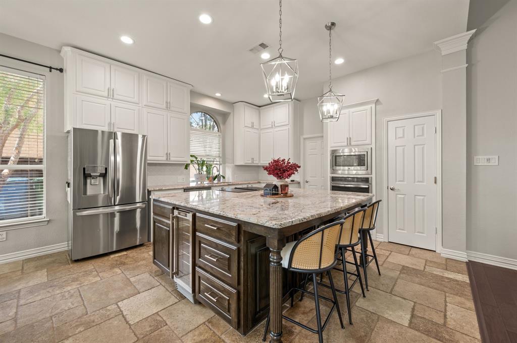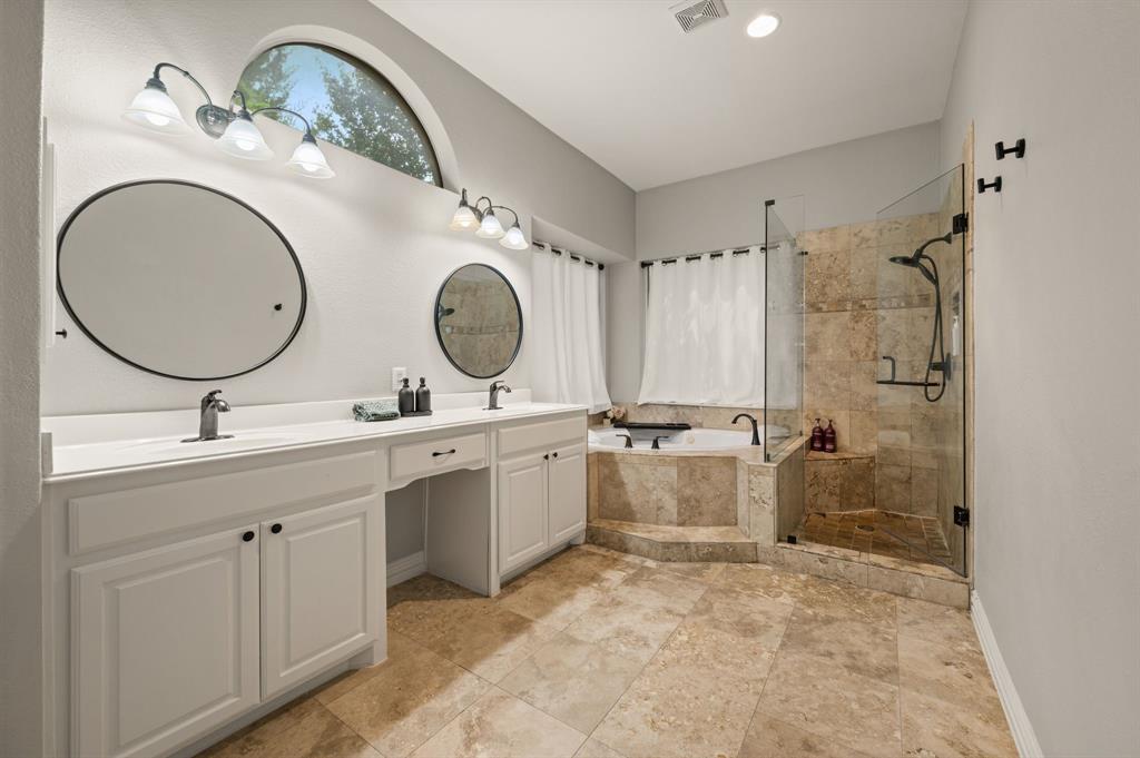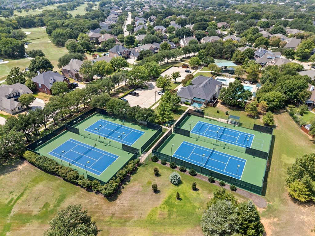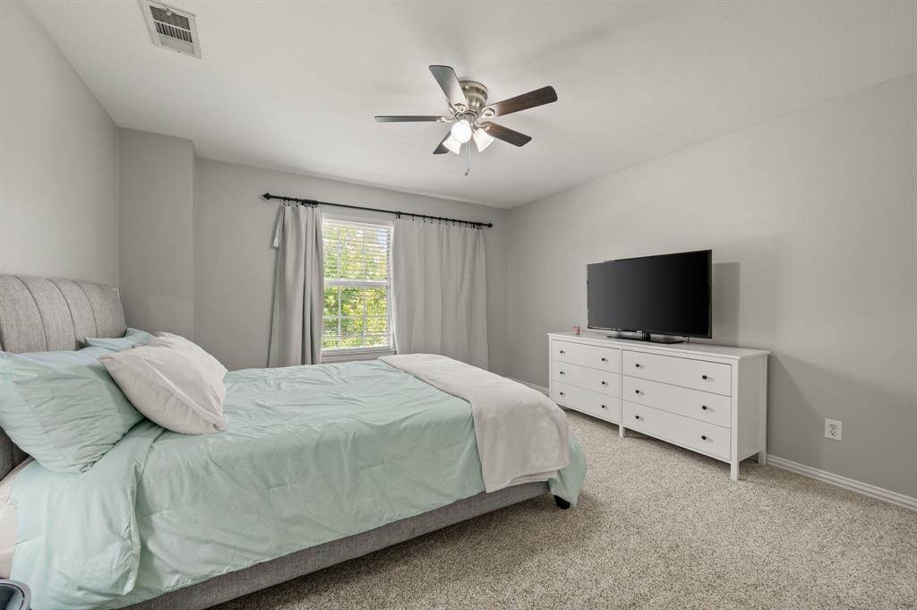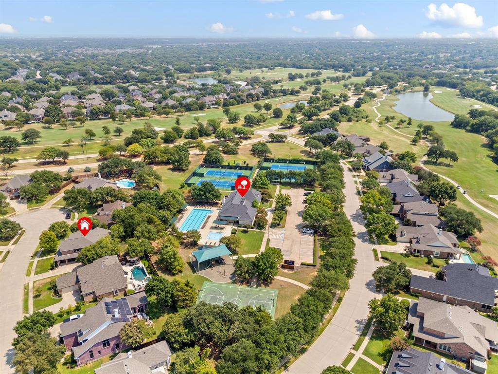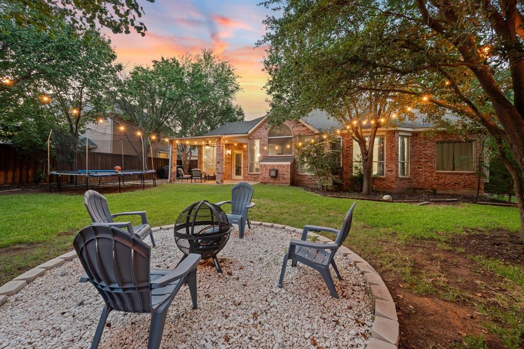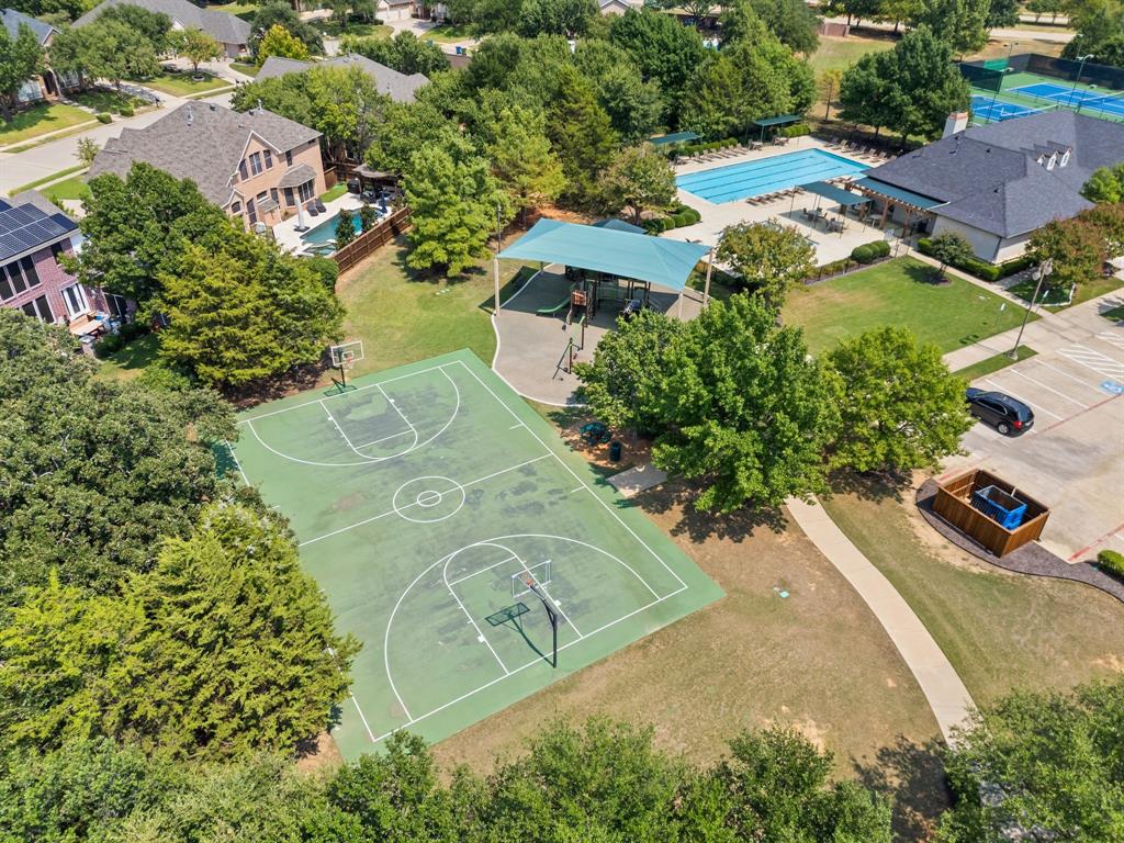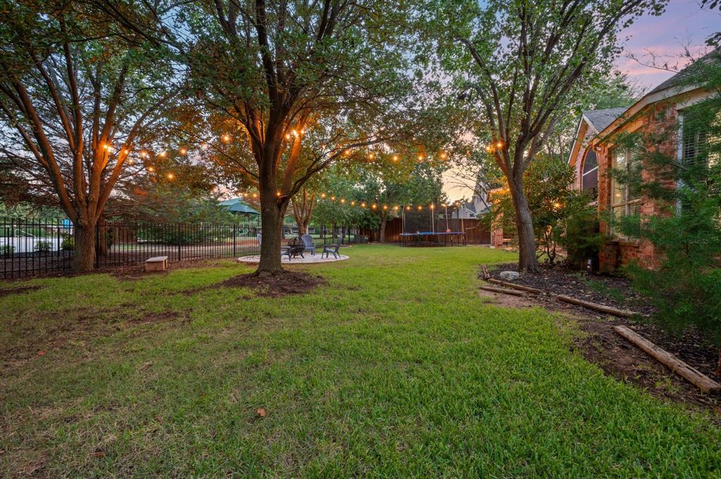 Stunning 2-story home nestled in the highly sought-after Bridlewood Golf Community within the top-rated Lewisville ISD. This beautiful home offers 4 spacious bedrooms all with walk-in closets, 3.5 bathrooms, a 3-car garage with updated doors, and a designated office, great for those who work from home or need a quiet place to study. Step inside to find soaring ceilings, rich wood floors, and elegant decorative lighting. The chef’s kitchen boasts a generous granite island, stainless steel appliances, white cabinetry, and a stylish backsplash, perfect for both everyday living and entertaining. The primary suite is a true retreat, featuring a serene bay window, vaulted tray ceilings, and a spa-inspired ensuite with a jetted soaking tub, separate walk-in shower, and an updated vanity with dual sinks. Enjoy the outdoors on the charming wrap around front porch or relax on the back patio overlooking mature landscaping and peaceful greenspace. With a private gate leading directly to Bridlewood’s community amenities, including a pool, playground, tennis courts, and basketball courts, you’ll love the convenience and lifestyle this home provides. Additional updates include HVAC, fence and sprinkler system, ensuring peace of mind for years to come.