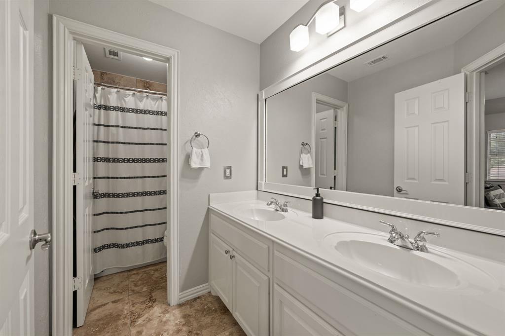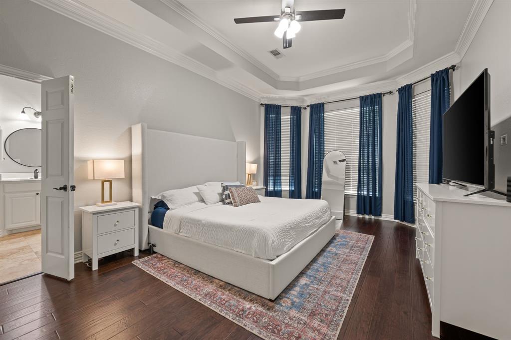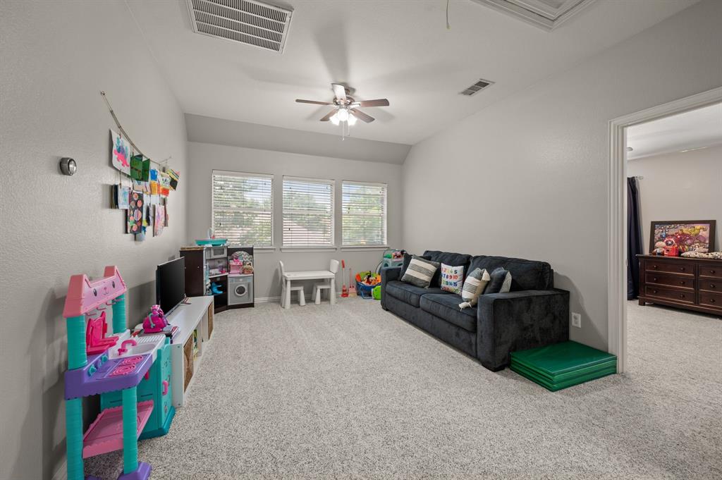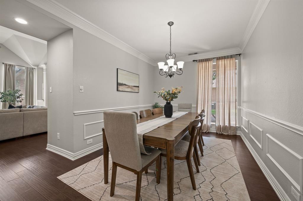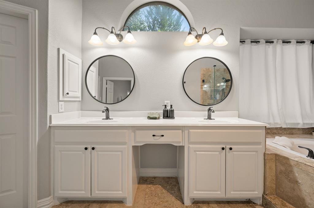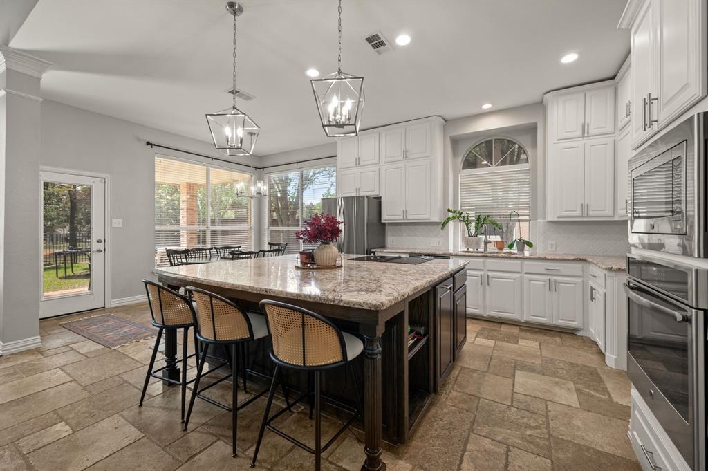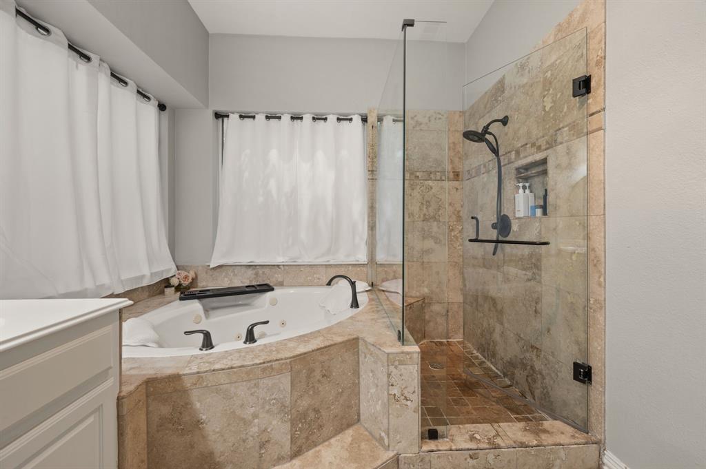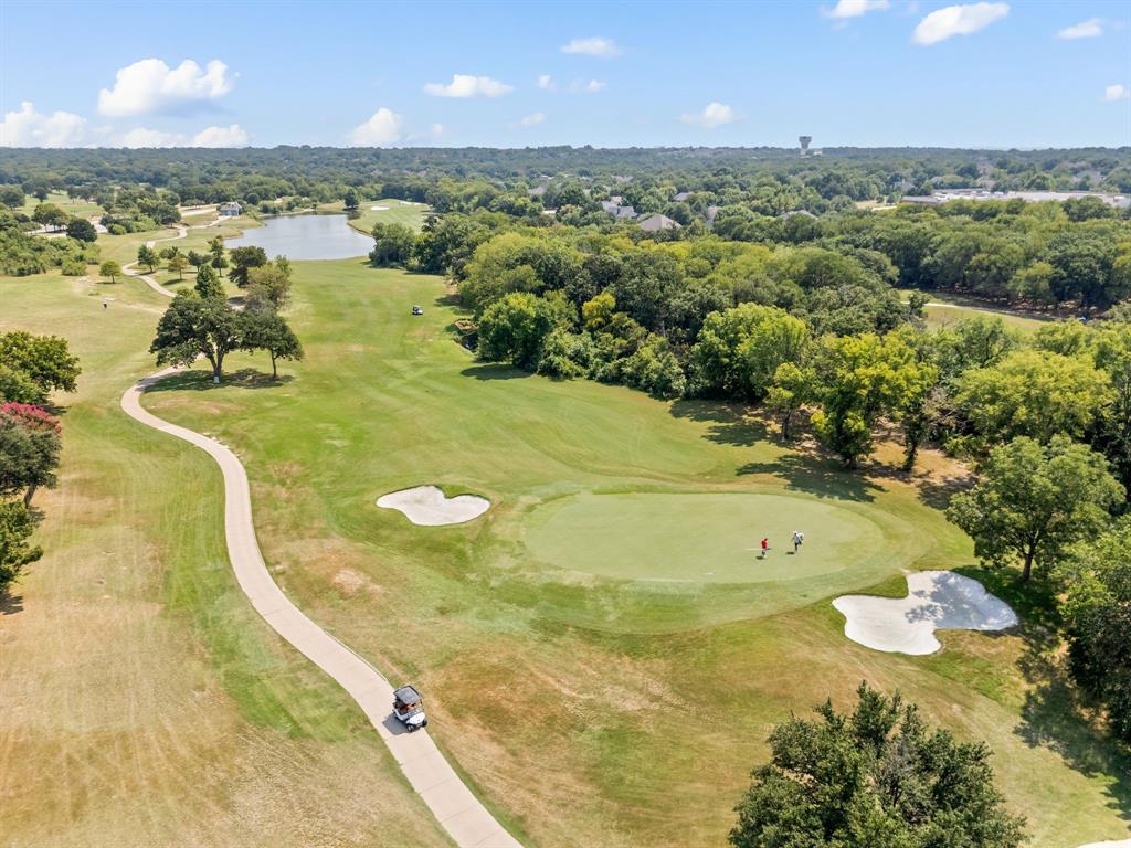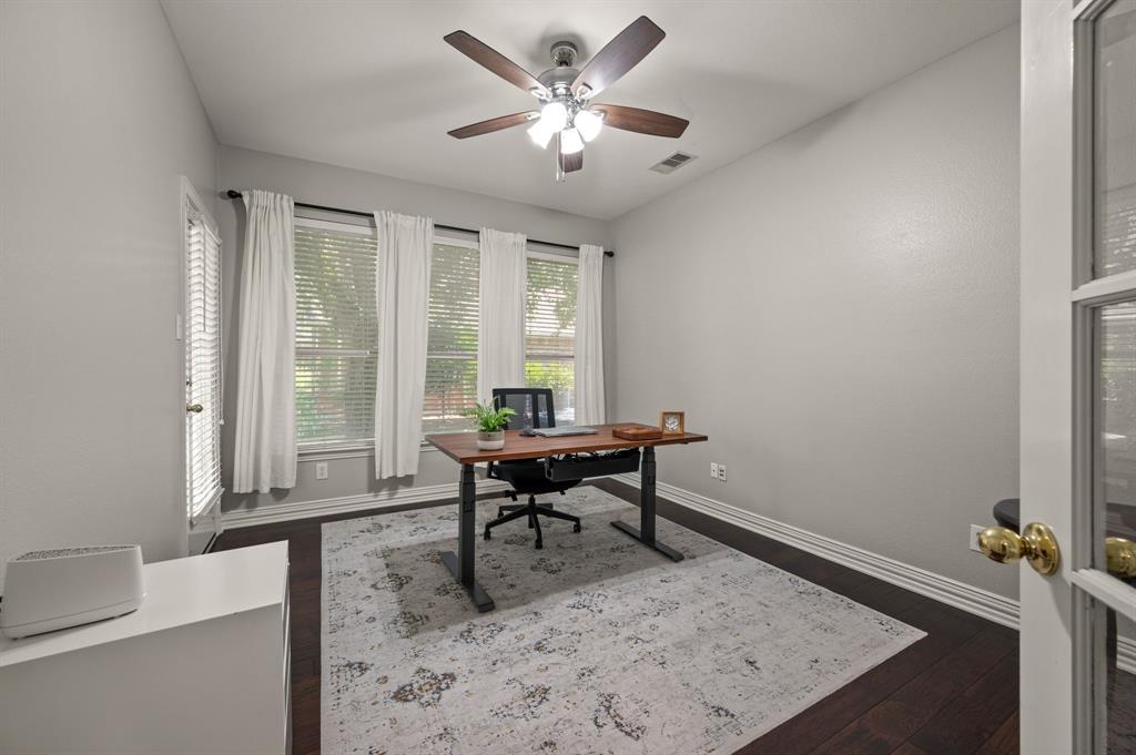 Stunning 2-story home nestled in the highly sought-after Bridlewood Golf Community within the top-rated Lewisville ISD. This beautiful home offers 4 spacious bedrooms all with walk-in closets, 3.5 bathrooms, a 3-car garage with updated doors, and a designated office, great for those who work from home or need a quiet place to study. Step inside to find soaring ceilings, rich wood floors, and elegant decorative lighting. The chef’s kitchen boasts a generous granite island, stainless steel appliances, white cabinetry, and a stylish backsplash, perfect for both everyday living and entertaining. The primary suite is a true retreat, featuring a serene bay window, vaulted tray ceilings, and a spa-inspired ensuite with a jetted soaking tub, separate walk-in shower, and an updated vanity with dual sinks. Enjoy the outdoors on the charming wrap around front porch or relax on the back patio overlooking mature landscaping and peaceful greenspace. With a private gate leading directly to Bridlewood’s community amenities, including a pool, playground, tennis courts, and basketball courts, you’ll love the convenience and lifestyle this home provides. Additional updates include HVAC, fence and sprinkler system, ensuring peace of mind for years to come.