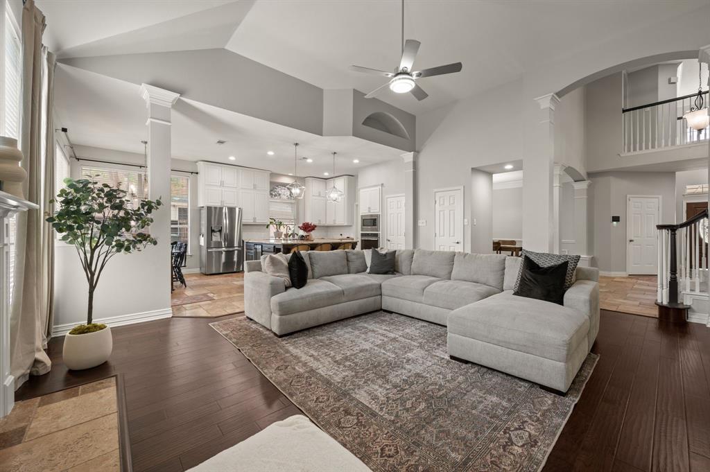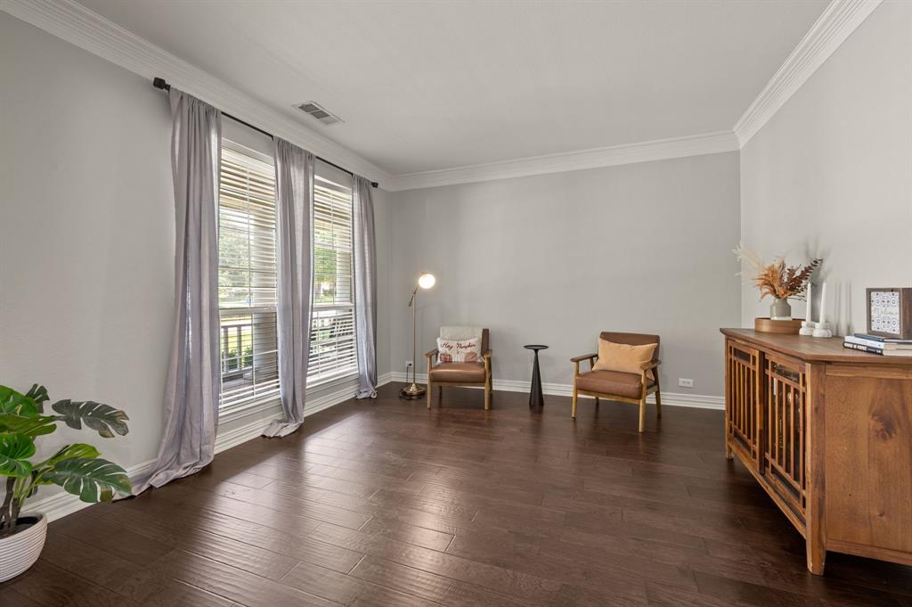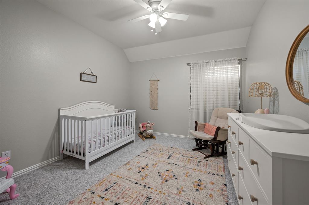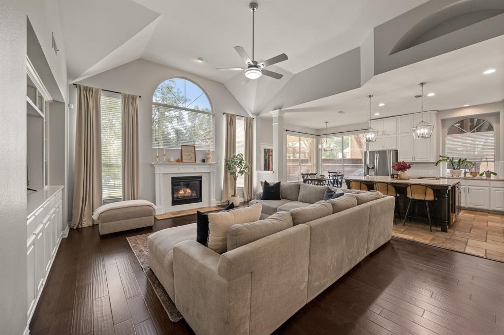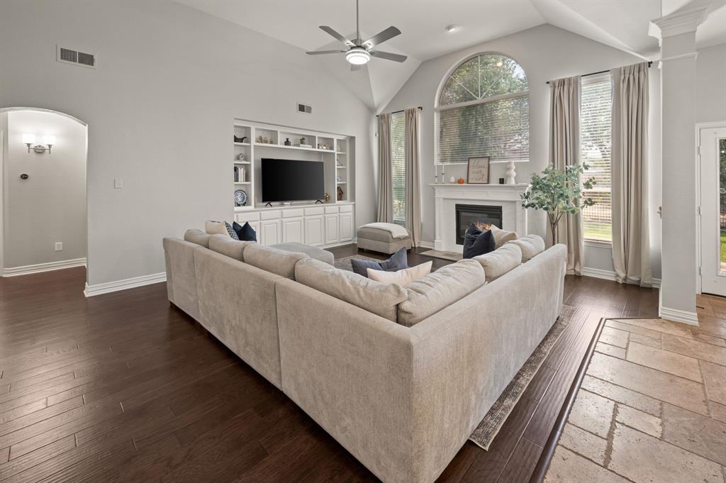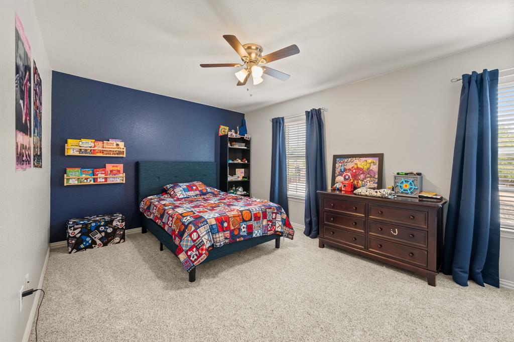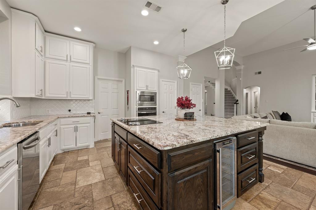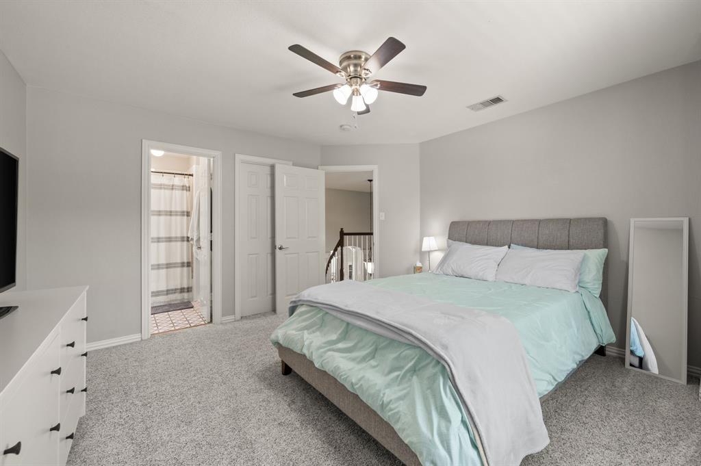 Stunning 2-story home nestled in the highly sought-after Bridlewood Golf Community within the top-rated Lewisville ISD. This beautiful home offers 4 spacious bedrooms all with walk-in closets, 3.5 bathrooms, a 3-car garage with updated doors, and a designated office, great for those who work from home or need a quiet place to study. Step inside to find soaring ceilings, rich wood floors, and elegant decorative lighting. The chef’s kitchen boasts a generous granite island, stainless steel appliances, white cabinetry, and a stylish backsplash, perfect for both everyday living and entertaining. The primary suite is a true retreat, featuring a serene bay window, vaulted tray ceilings, and a spa-inspired ensuite with a jetted soaking tub, separate walk-in shower, and an updated vanity with dual sinks. Enjoy the outdoors on the charming wrap around front porch or relax on the back patio overlooking mature landscaping and peaceful greenspace. With a private gate leading directly to Bridlewood’s community amenities, including a pool, playground, tennis courts, and basketball courts, you’ll love the convenience and lifestyle this home provides. Additional updates include HVAC, fence and sprinkler system, ensuring peace of mind for years to come.