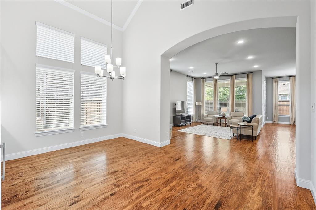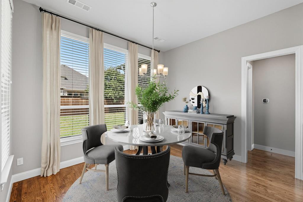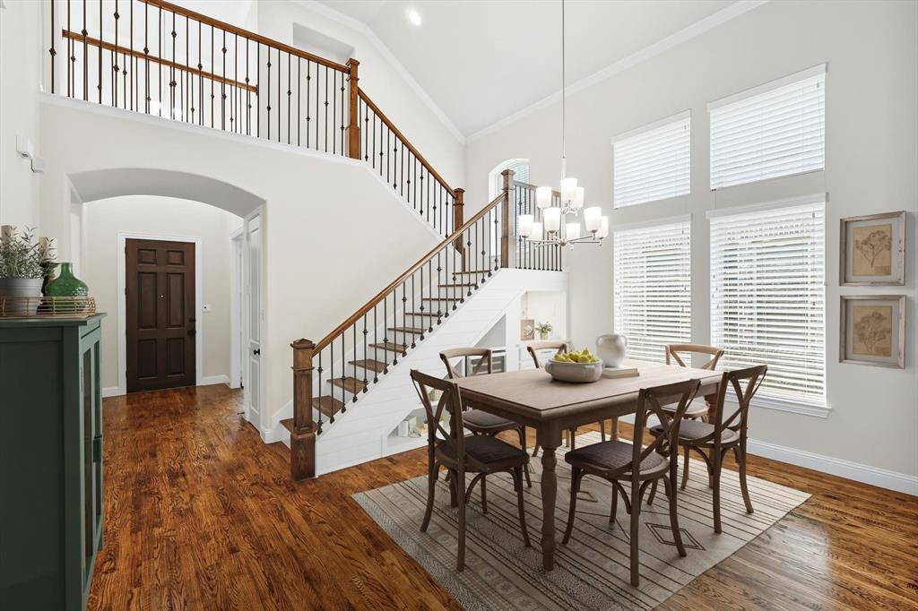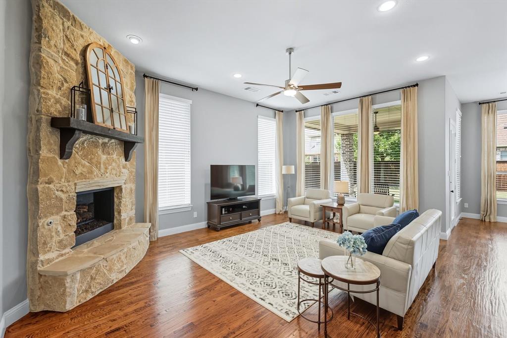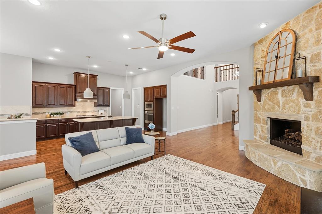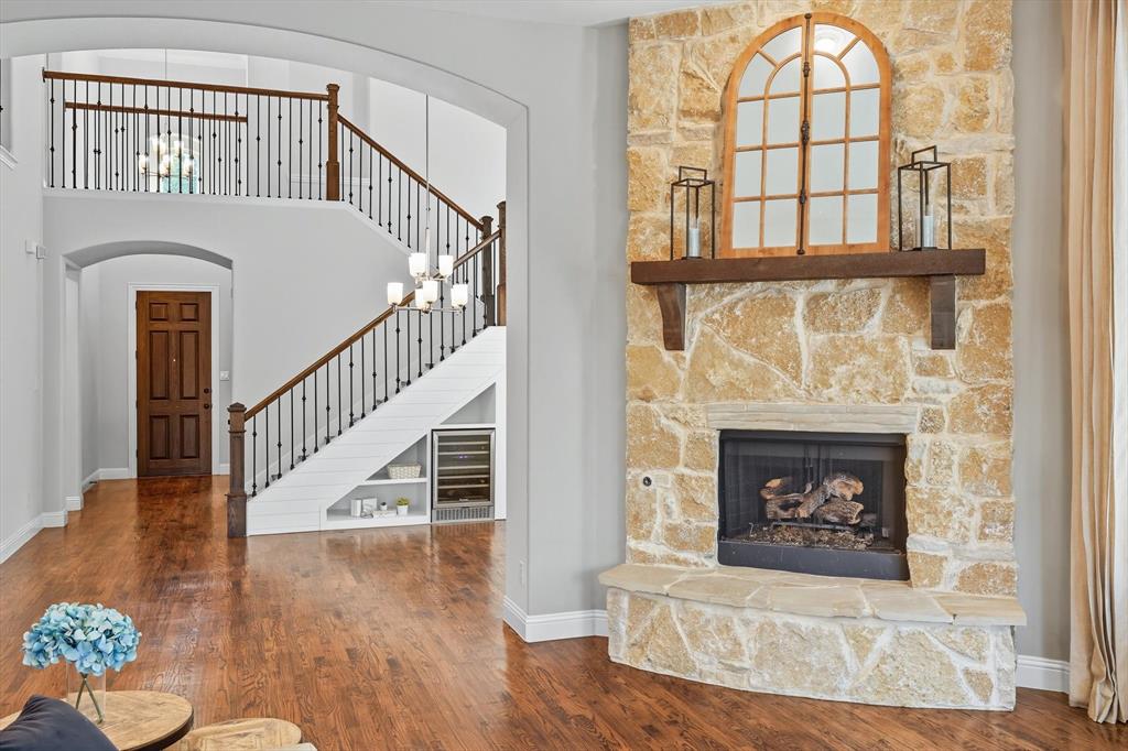 Welcome to this beautifully upgraded home in the sought-after Fairway Ranch community of Roanoke, where luxury and comfort meet convenience. Upon entry, you’ll be greeted by a private study with crown molding and plantation shutters offering the perfect work-from-home space. You'll love entertaining in the soaring double-height dining room just off the spacious living room featuring rich hardwood floors, a dramatic floor-to-ceiling stone fireplace, and a wall of windows that flood the home with natural light.