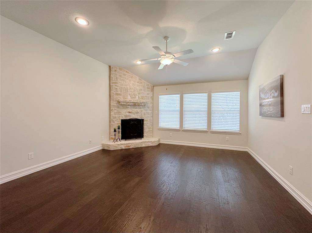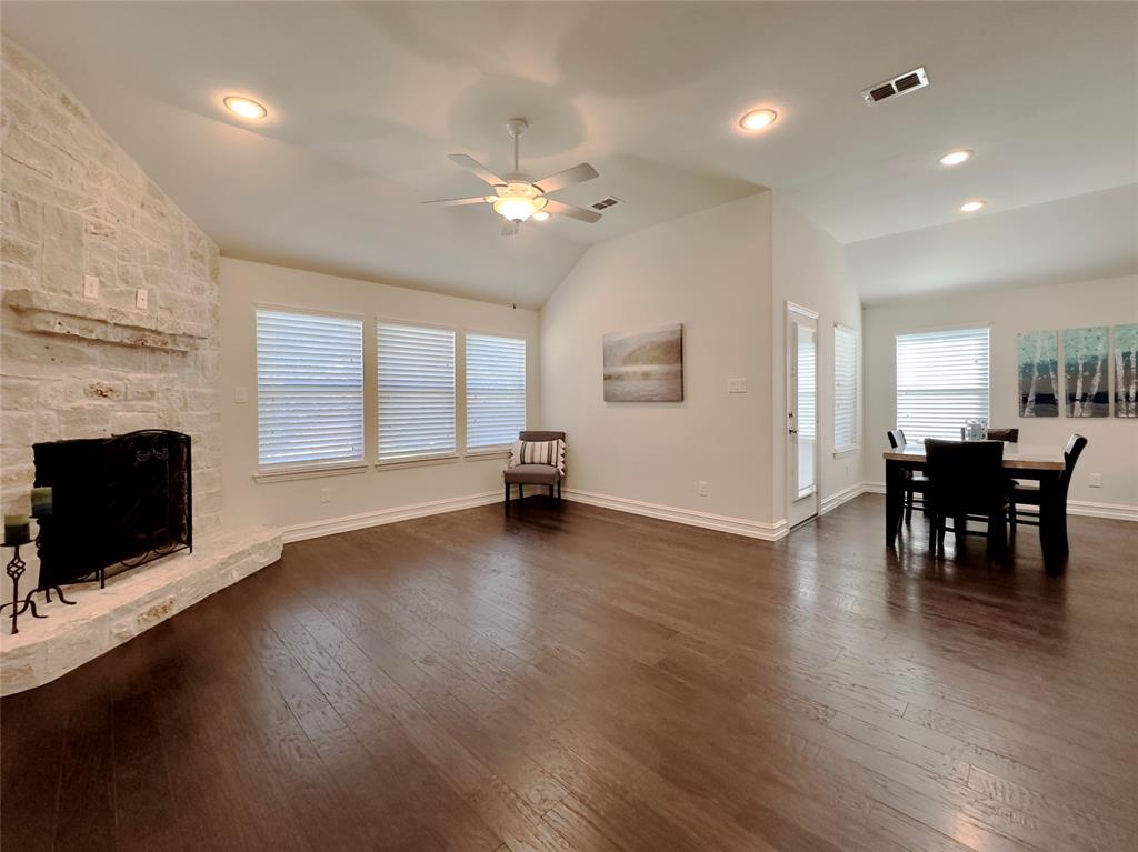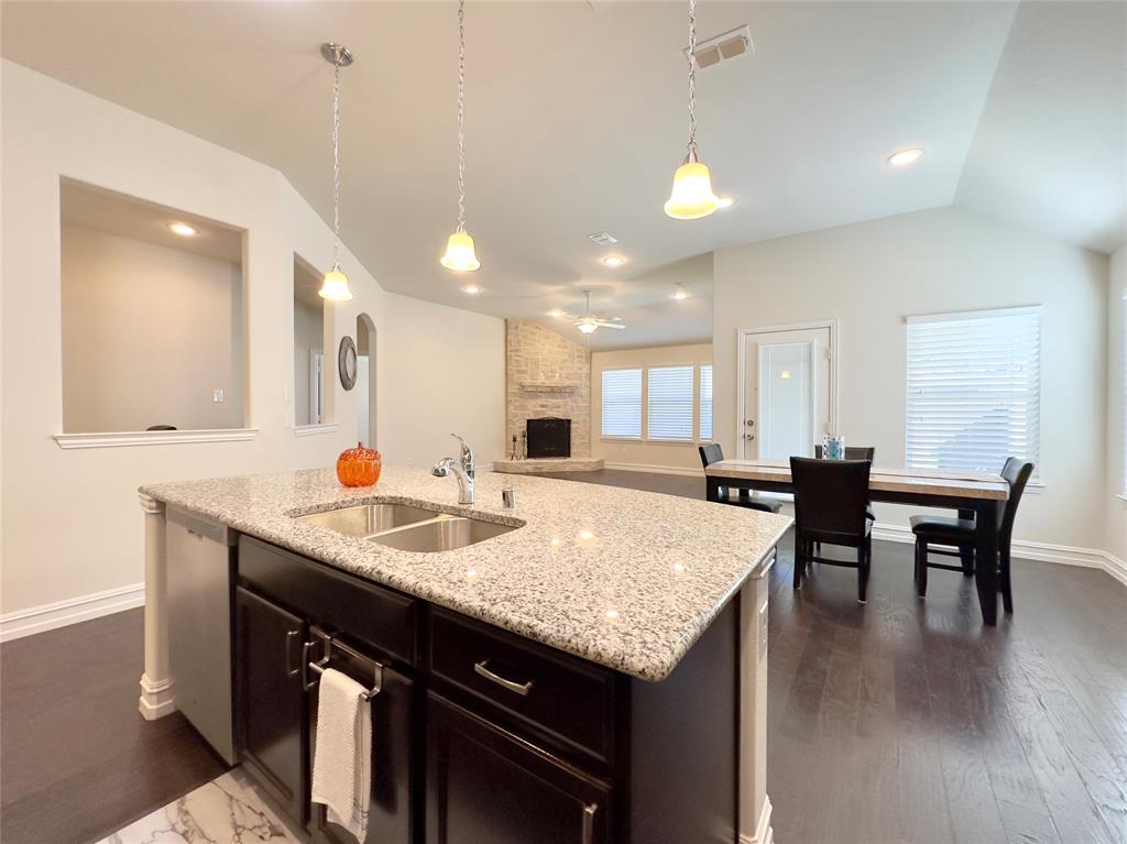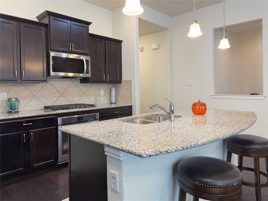 Enter a well-designed space with high ceilings and abundant natural light. The living room invites relaxation with its cozy stone fireplace, while the gourmet kitchen delights with granite countertops, gas cooktop, stainless steel appliances, and ample cabinet space. Enjoy casual dining at the oversize granite island or entertain family and friends in the generous dining space overlooking the covered patio and lush backyard. The home office computer center is centrally located and offers a convenient built in desk.