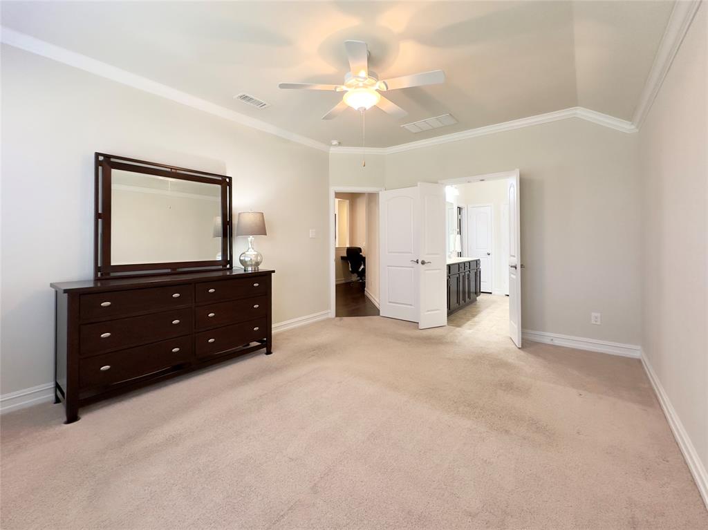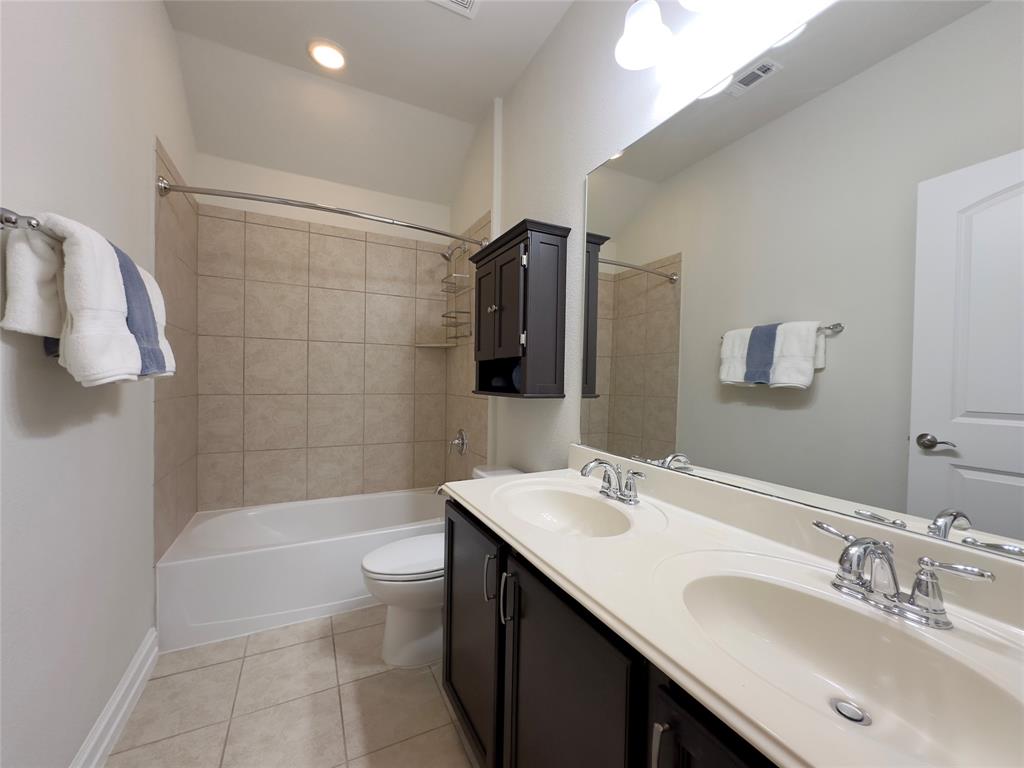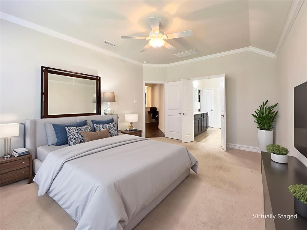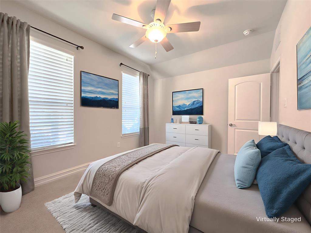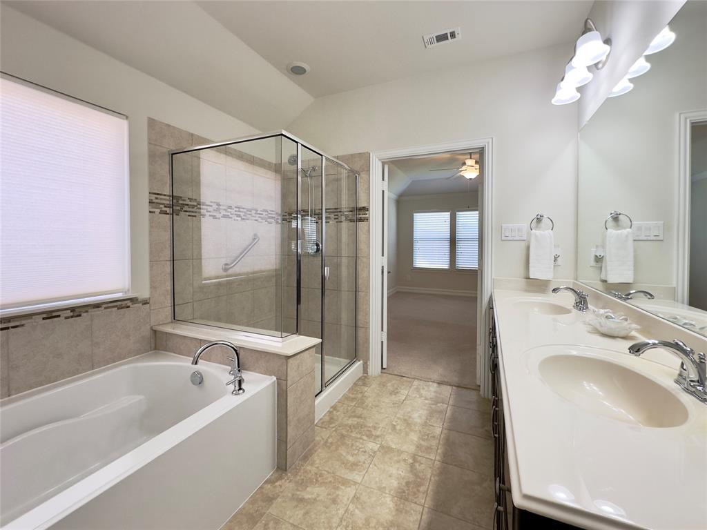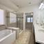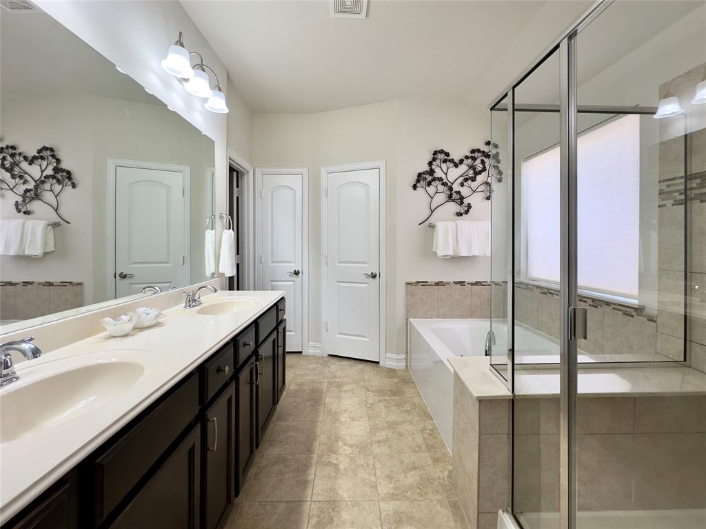 The primary suite is a luxurious retreat with a walk-in closet and ensuite bath, complete with a dual sink vanity, soaking tub, and separate shower. Additional bedrooms are generously sized for guests. The second bathroom features modern fixtures and a convenient layout for optimal functionality.