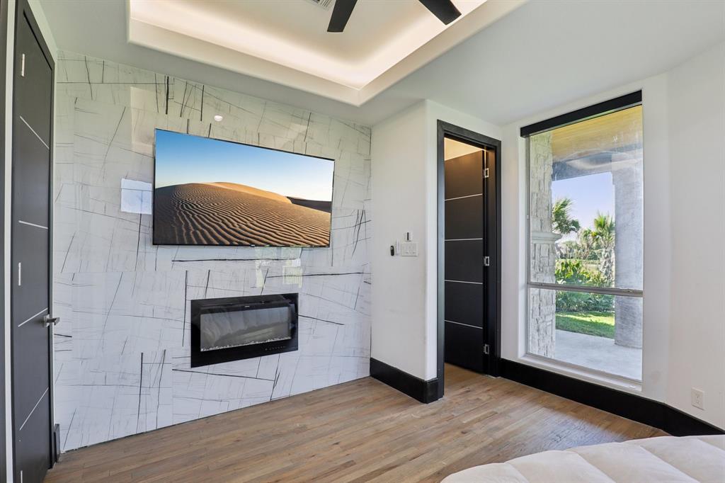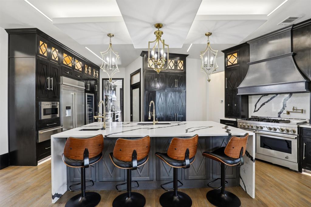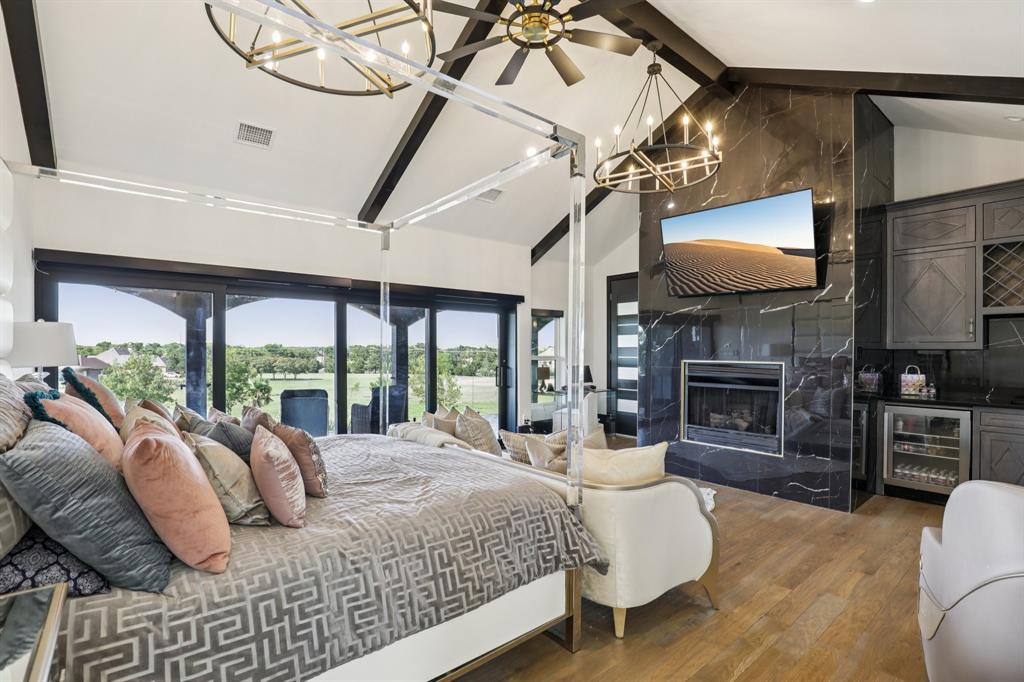 The chef’s kitchen is a masterpiece—featuring a waterfall quartz island, commercial-grade gas range, dual dishwashers, built-in refrigerator, and endless storage. A hidden butler’s prep kitchen makes entertaining seamless, while the formal dining room and game room with full wet bar elevate gatherings to new heights. The primary suite is a true sanctuary, boasting vaulted ceilings, a marble fireplace, private beverage center, sitting area, and a wall of glass sliders leading to a private terrace. The spa-inspired en-suite bath offers ultimate indulgence with luxury finishes and a retreat-like ambiance. Upstairs, a secondary living space with its own bar continues the theme of elevated entertaining.