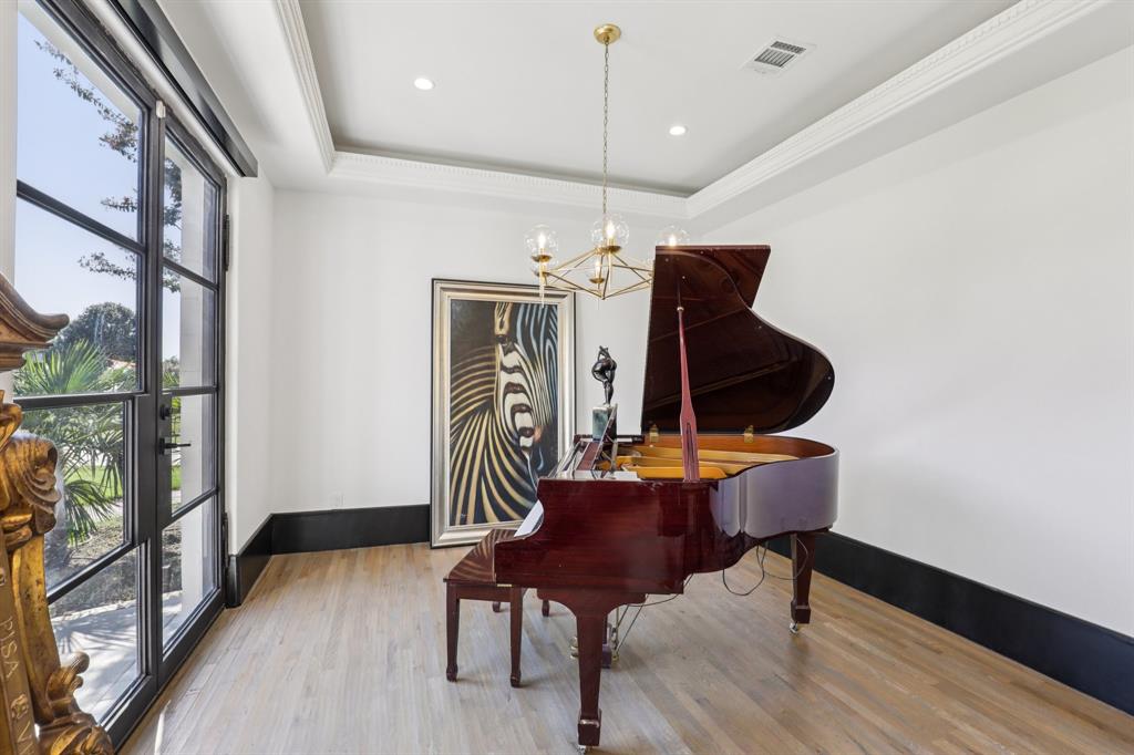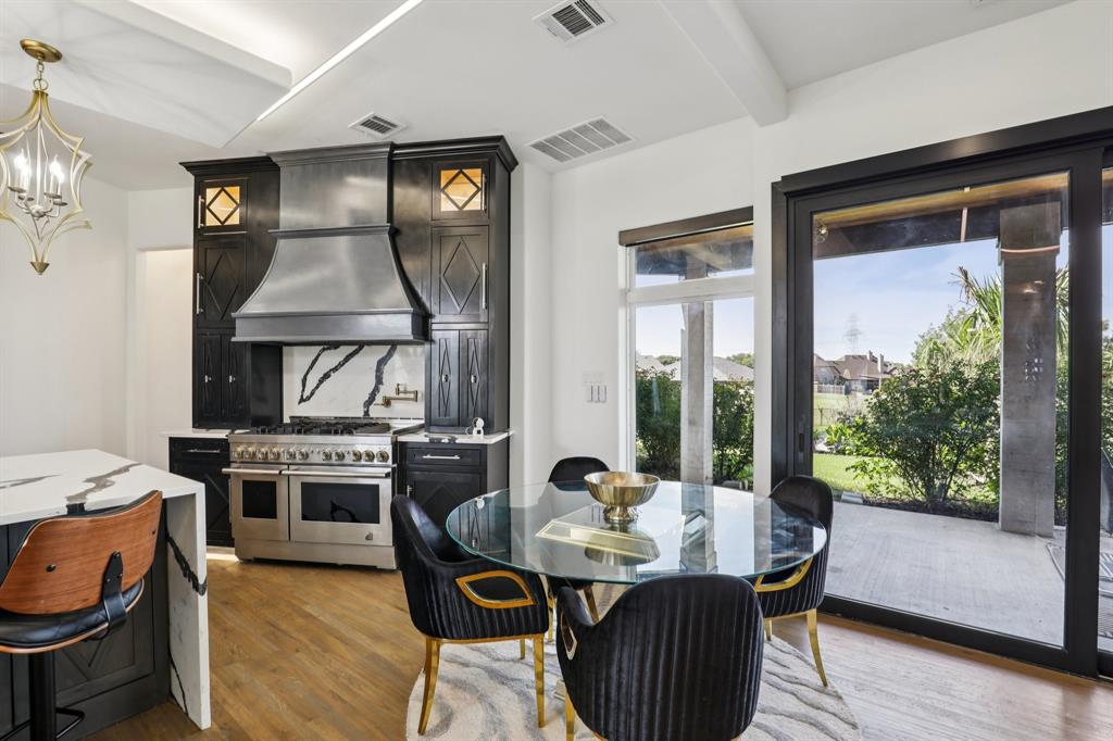 The expansive living area is bathed in natural light, anchored by a sleek marble fireplace and a showcase glass-enclosed wine cellar. Floor-to-ceiling sliders dissolve the boundaries between indoors and out, offering an effortless flow into the resort-style backyard.