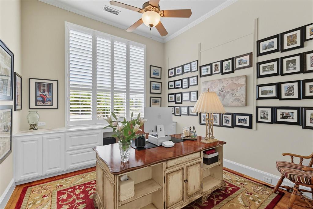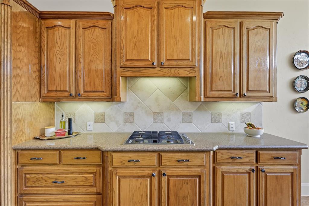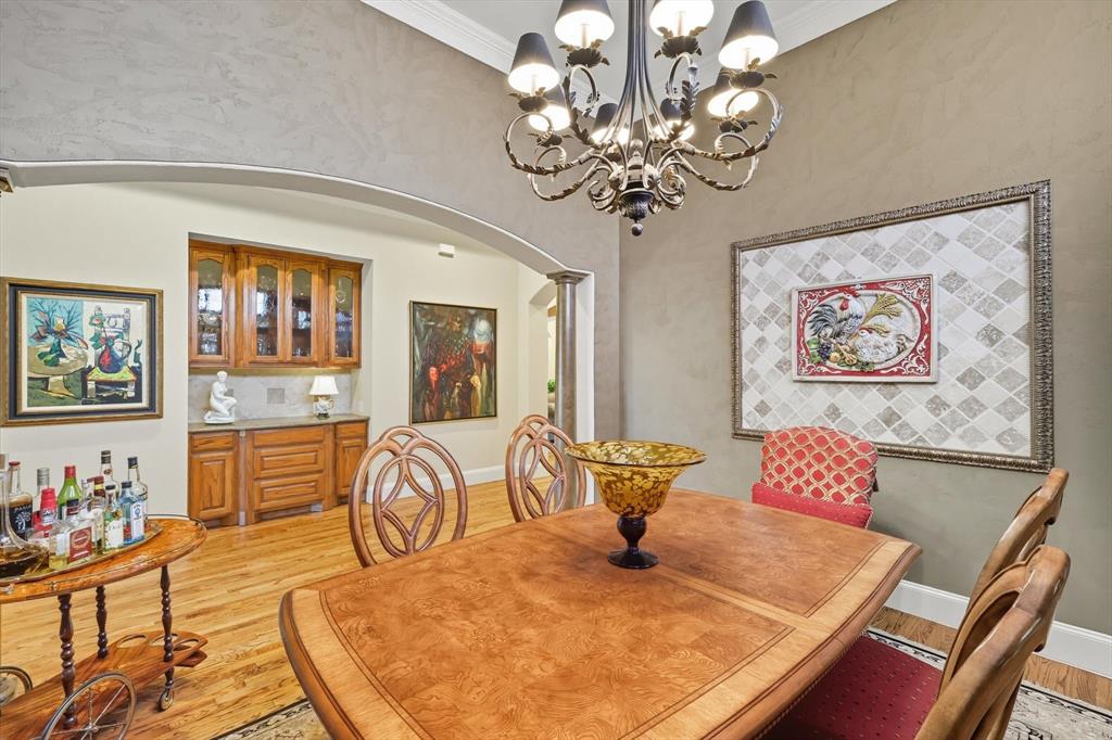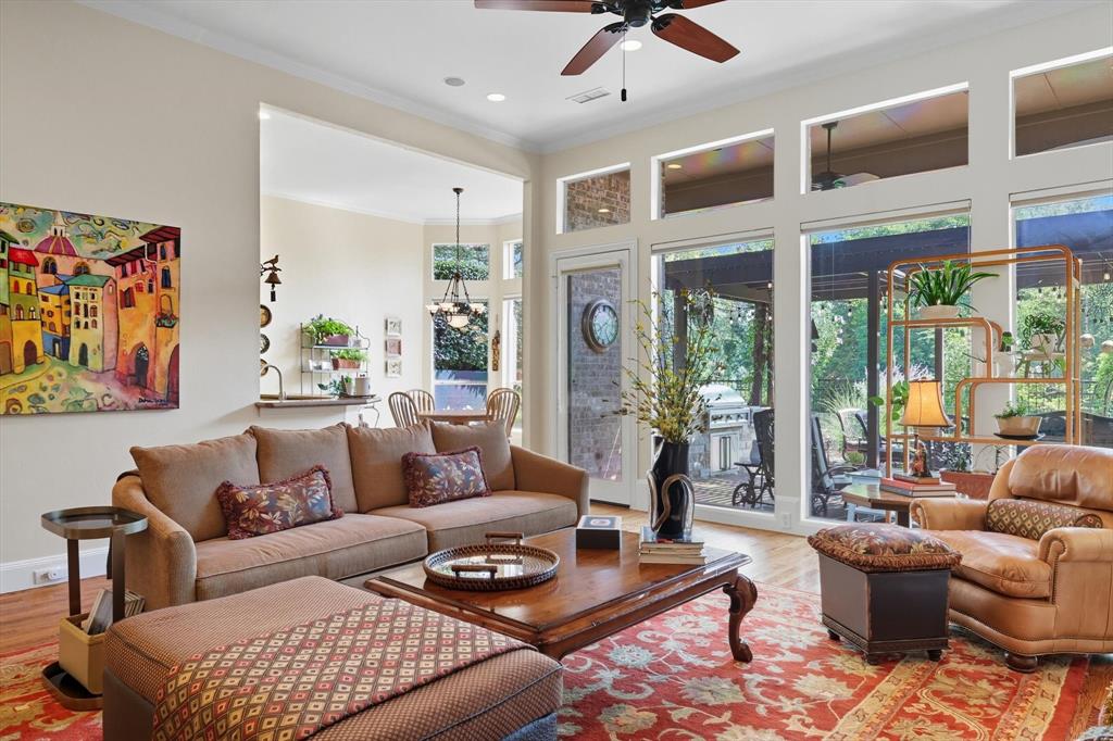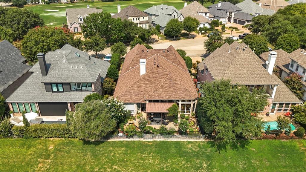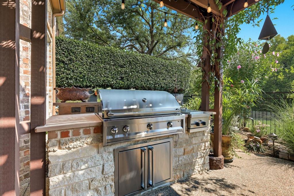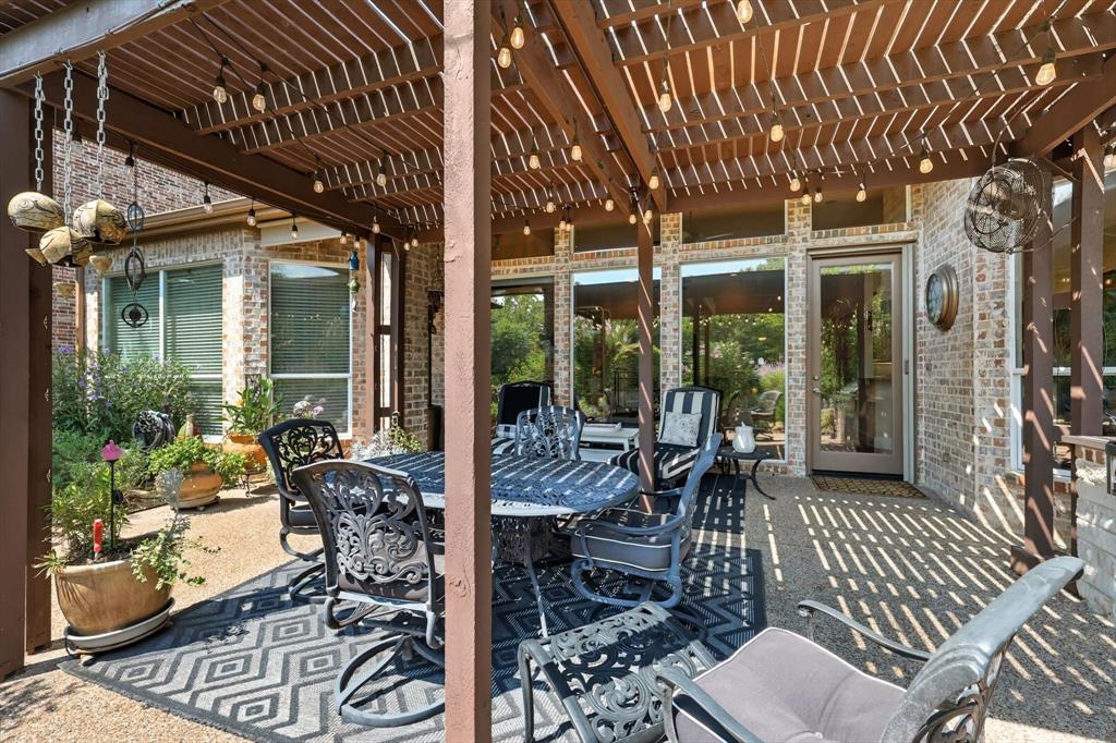 Immaculately maintained one-story home with fabulous curb appeal in the highly desirable Crescent Royale addition in Timarron. Hardwood floors throughout living areas, extra tall ceilings, and large living areas. Three bedrooms, three baths, two living areas and two dining areas. One bedroom currently being used as office. Lots of storage throughout. Spacious primary suite with huge bathroom, separate vanities, and large dual closets. Enjoy relaxing evenings in the stunning outdoor space with living area that includes summer kitchen with grill and burners, pergola, and soothing sounds of the rock waterfall and pond. Backyard features lush landscaping and easy maintenance and backs to green space for privacy. HOA maintains front yard. Roof replaced 8-25; water heaters replaced 2024, new fireplace 8-25.